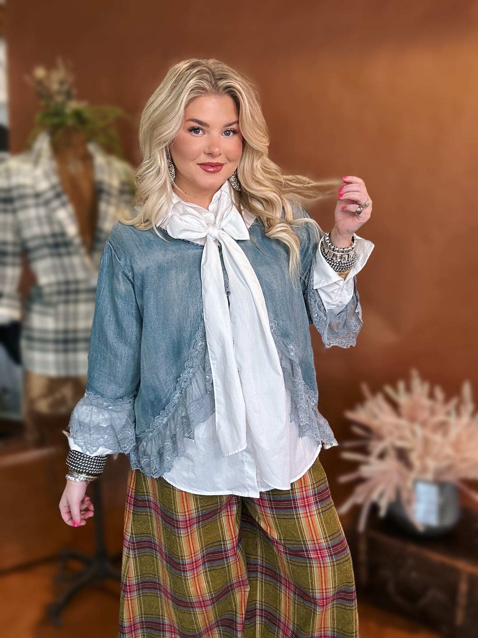 Meet your new wardrobe obsession—the Alluring Romance Lace Overlay! This charming denim piece features romantic lace trim that catches the light just right, paired with a flirty tie-front closure that lets you adjust the fit however you like. Designed for maximum versatility, it's the perfect layer for any season: throw it over sundresses in summer, style it with cozy knits when fall rolls around, or rock it solo when the mood strikes. The beauty of this overlay is its ability to transform any outfit from basic to fabulous in seconds. Whether you're dressing up for a night out or keeping it casual on the weekend, this playful piece brings instant charm and personality to your look. Layer it, tie it, love it!