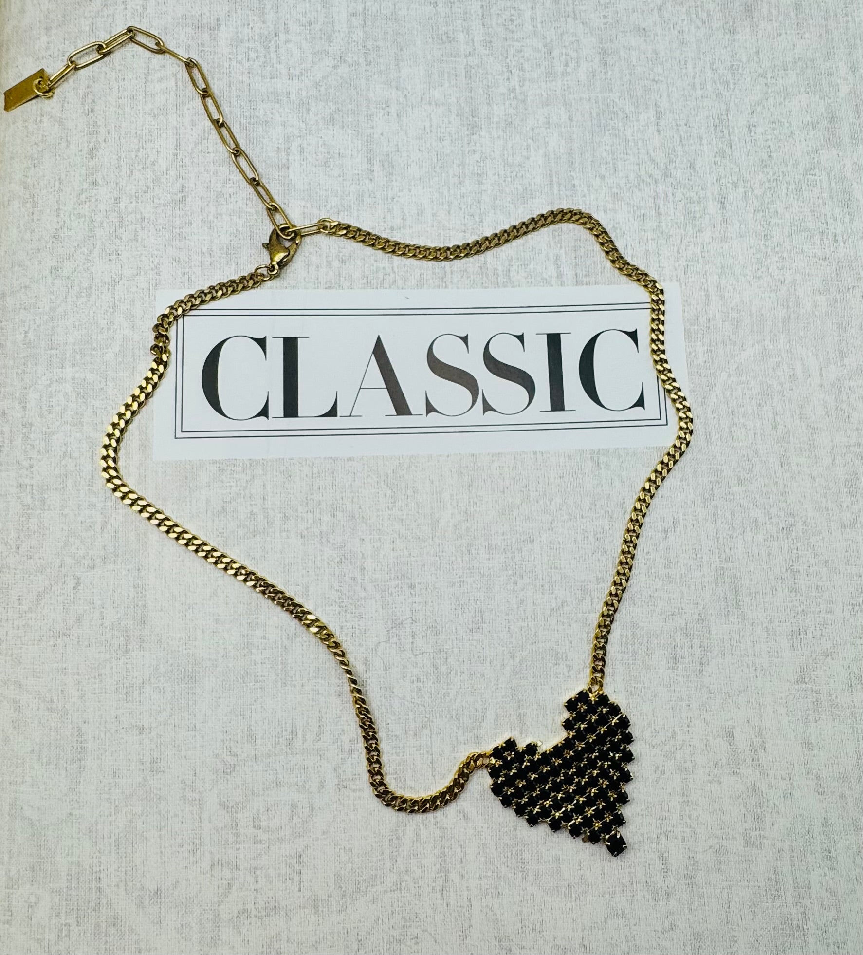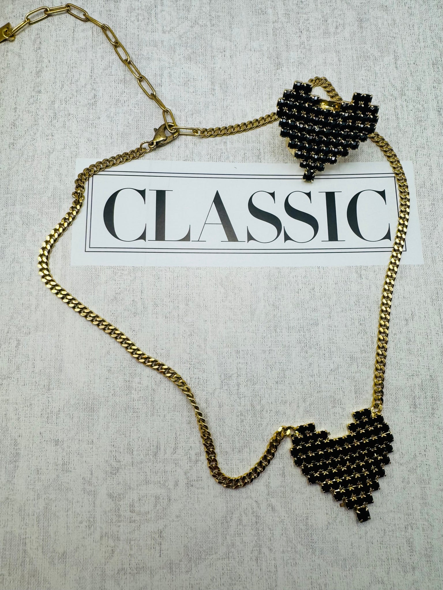 Elevate your accessory collection with the whimsical Candy Heart Necklace, a playful twist on classic charm. Featuring antique gold plating that gives it a vintage vibe and sparkling high-quality crystals that catch the light with every move, this necklace promises to add a dash of fun to any outfit. Crafted in Canada from a flexible brass base metal, it molds comfortably to your neckline, combining durability with delightful style. Whether layered or worn solo, this necklace is your new go-to for turning heads and sparking smiles wherever you go.