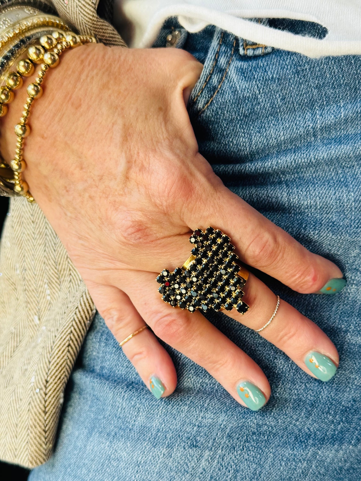 Elevate your accessories with the playful charm of the Candy Heart Ring in Jet. Featuring sparkling high-quality crystals set on an antique gold-plated band, this ring adds a touch of vintage glam to any outfit. Crafted in Canada from malleable brass, it offers both durability and comfort for everyday wear. Its eye-catching dark tones and whimsical candy heart design make it the perfect statement piece to brighten your look and spark conversations wherever you go. Add a fun, stylish twist to your jewelry collection with this unique, head-turning ring.