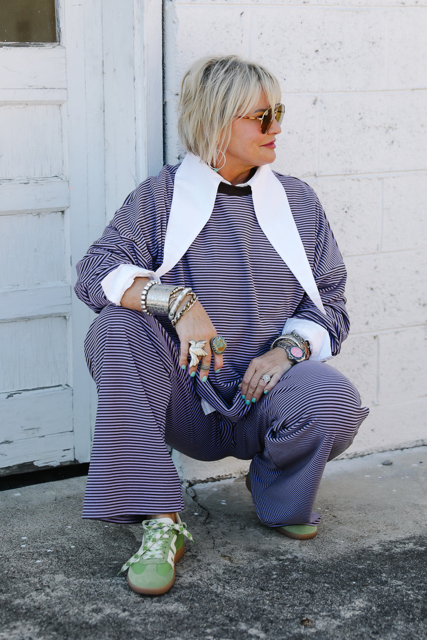 Embrace comfort and style with the Candy Striped Top in Lavender & Brown. This super soft, oversized top features cozy stripes and a slouchy fit that feels like a warm hug all day long. Its playful, classic pattern makes it a versatile favorite you’ll want to wear repeatedly. Perfect for easy travel days or relaxed weekends, it pairs effortlessly with matching pants sold separately—just pick your size to complete the set. Whether lounging at home or stepping out, this top keeps you comfy and effortlessly chic.