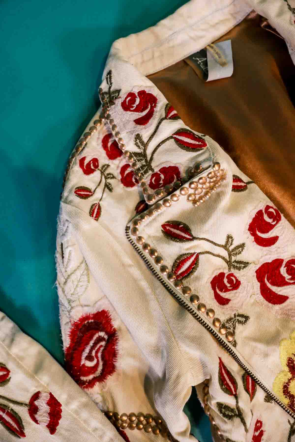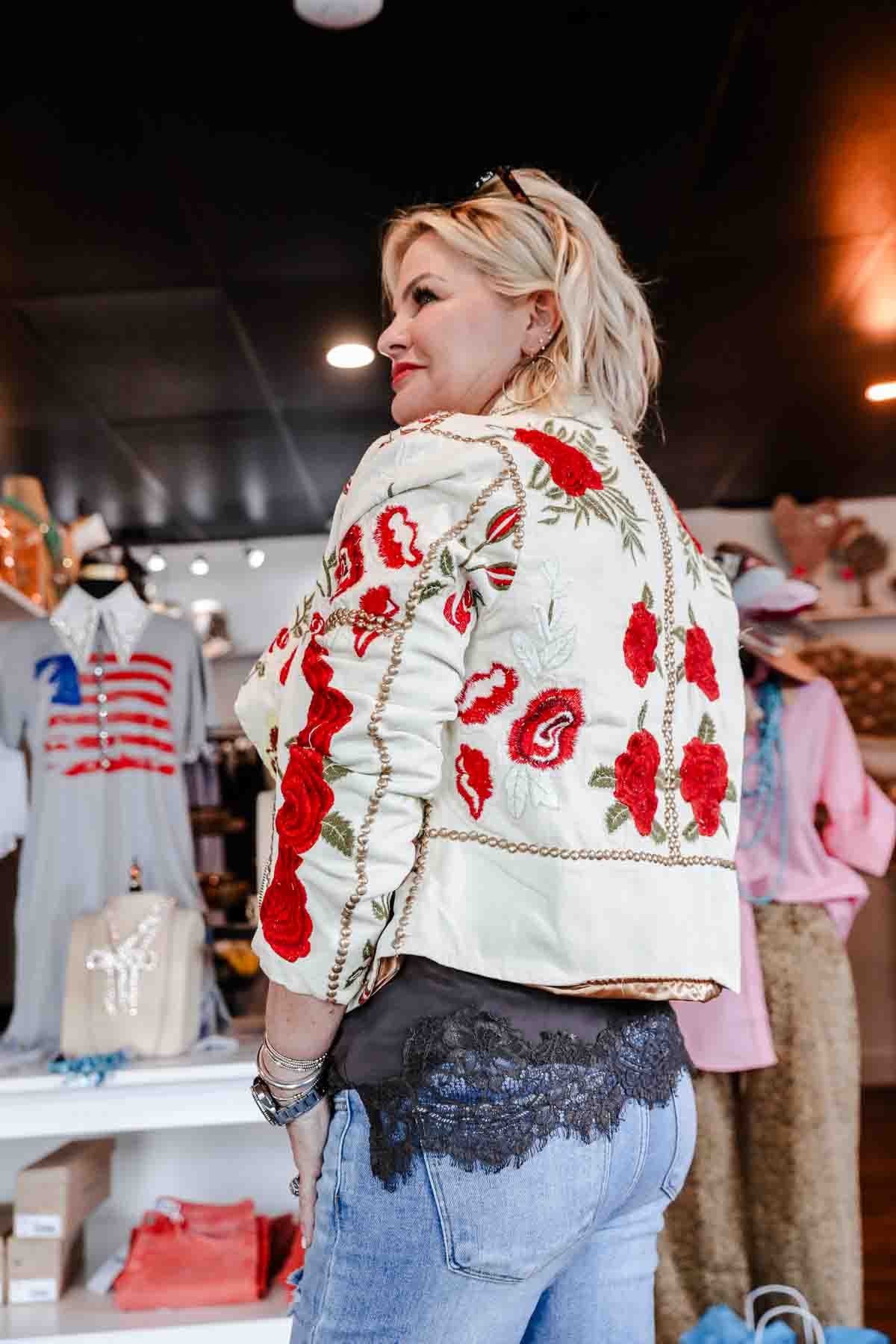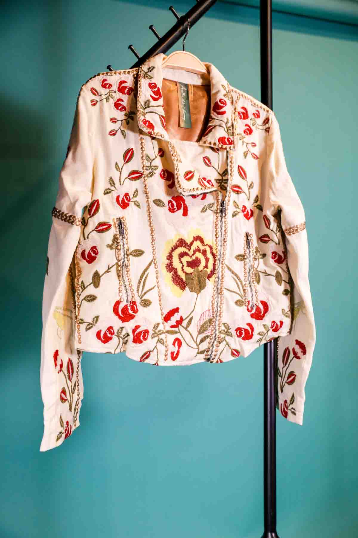 The Carmen Rose Jacket is a playful twist on classic denim with embroidered floral details and edgy stud accents. Crafted from 100% cotton, this ivory motorcycle-style jacket features a sturdy zip closure and two front zip pockets for a cool, functional vibe. Perfect for adding a bit of attitude to any outfit, it’s designed to stand out while keeping you comfortable. Remember to dry clean only to keep those vibrant details looking fresh and fabulous!