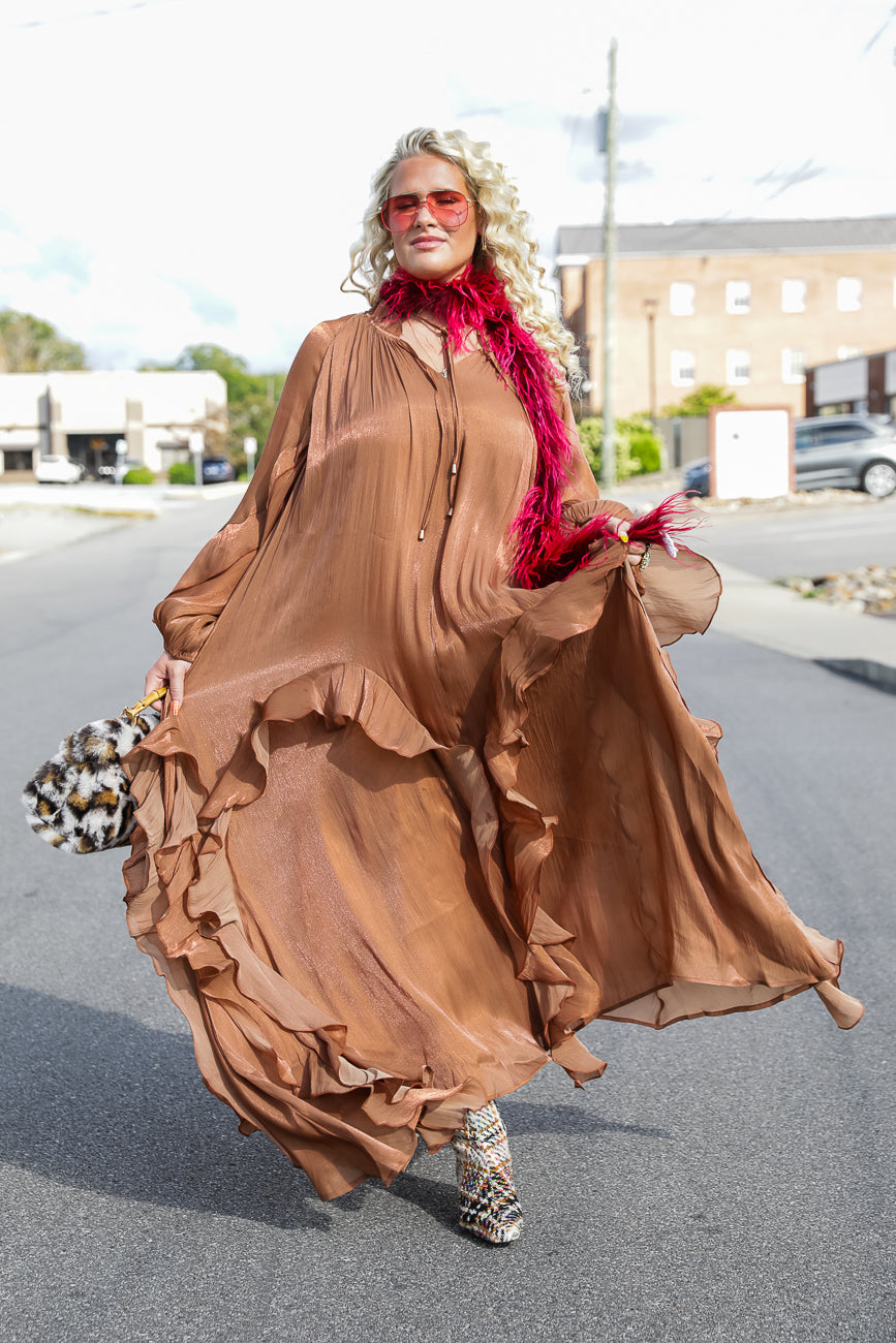 Step into autumn with the Dalia Dress, a taupe beauty that shimmers subtly in the light. Its flowing maxi skirt features playful ruffles that dance with every step, while the flattering v-neckline adds a touch of charm. The included belt cinches your waist perfectly, giving you a silhouette that turns heads at every fall gathering. Whether you're strolling through crisp leaves or enjoying a cozy evening, this dress brings warmth and whimsy to your seasonal wardrobe.