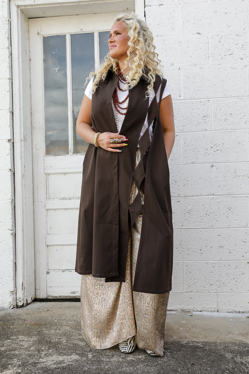 This versatile piece works as a shirt, dress, tunic, or kimono! Featuring an asymmetrical hollow-out design with sparkling diamante details, it’s crafted from solid fabric for a chic midi-length look. It has a spread collar, front buttons, and is sleeveless—with no inner lining. The A-line silhouette offers a relaxed fit for breezy comfort. Available in Black and Brown, this imported style is perfect for mixing up your wardrobe. Remember, treating your clothes gently with cool washes and delicate cycles keeps them looking fresh while being kind to the planet!