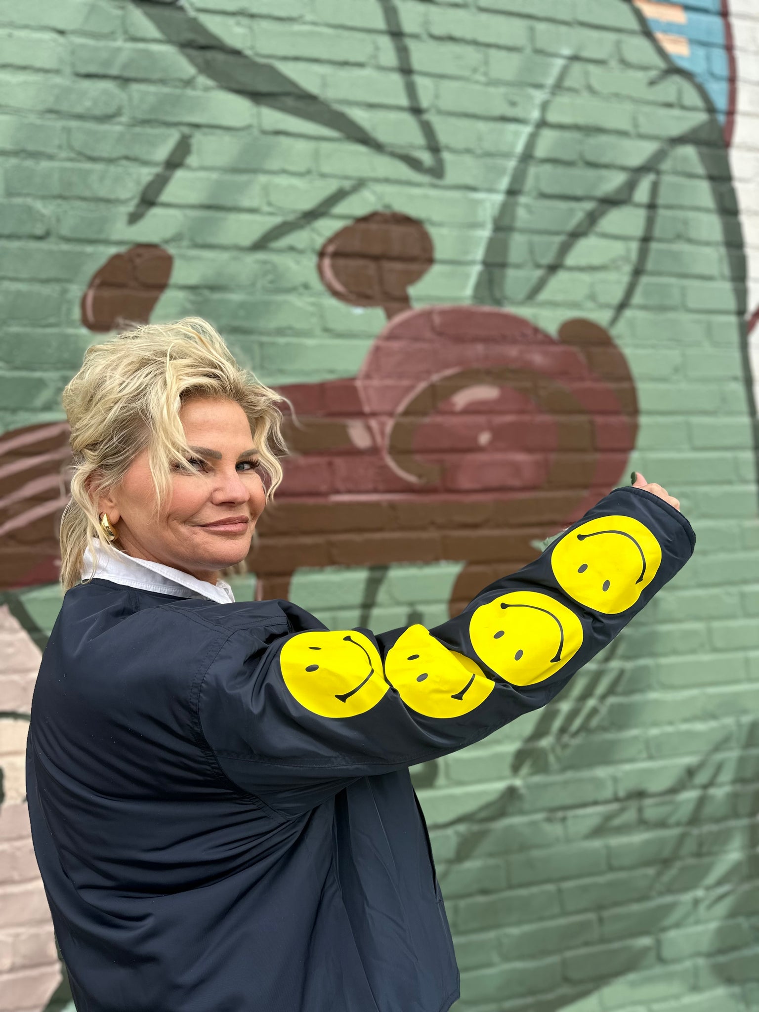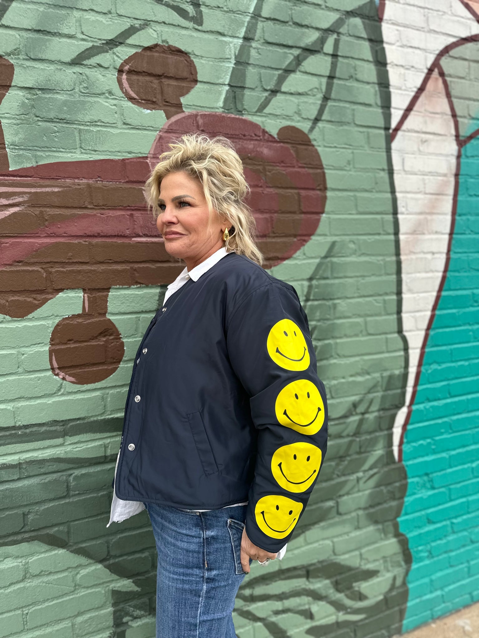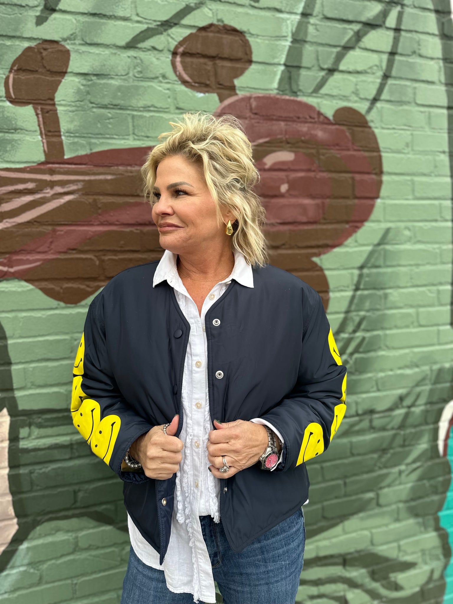Stay cheerful and cozy with the Happy Days Puffer Jacket in vibrant navy. Featuring playful smiley faces running down both arms, this oversized jacket adds a fun twist to your winter wardrobe. With convenient snap button closures and roomy pockets, it’s designed for both style and practicality. Perfect for those who want to embrace warmth and good vibes all season long.