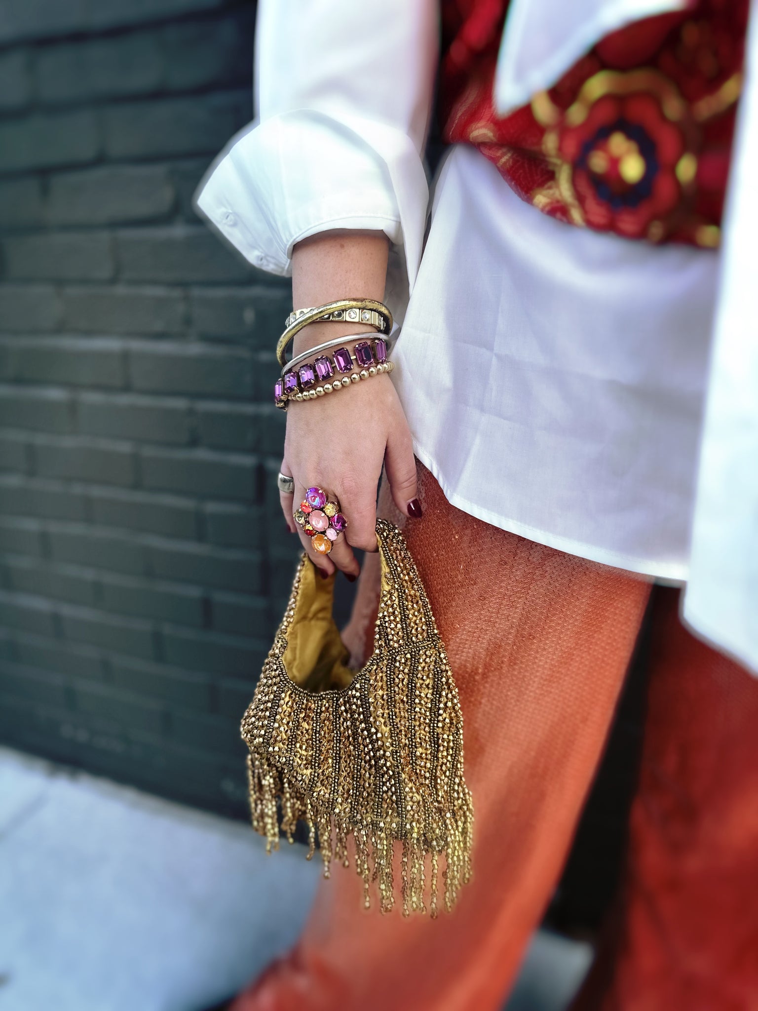 Be bold and daring with the Erina Bracelet! Made with antique gold plated brass, it's a guaranteed statement maker with its colorful array of glimmering high quality crystals. It features a length of 5.5" with a 1.5" extension. When you want to shine brighter than the sun, it's time to slip this beauty on and look fabulous! Made in Canada for your stylish pleasure.