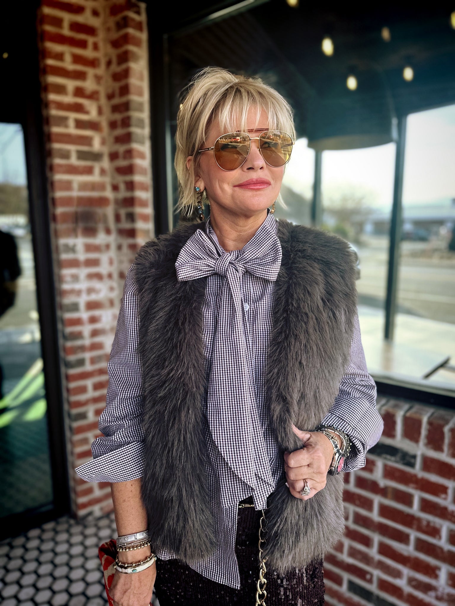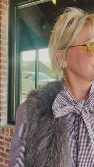 Layer up with personality in this Figgy Fur Vest, where cozy meets glam in the most delightful way. The open front design lets you style it over your favorite pieces, while the sleeveless cut keeps things breezy and versatile. Practical side pockets add function to the fun, perfect for stashing essentials or keeping hands warm. What really makes this vest shine? Shredded tinsel artfully scattered throughout the plush faux fur creates an eye-catching sparkle that catches the light with every move. Whether you're heading to a holiday gathering or just want to add some shimmer to your everyday look, this playful piece brings instant festive flair and a touch of whimsy to any outfit.