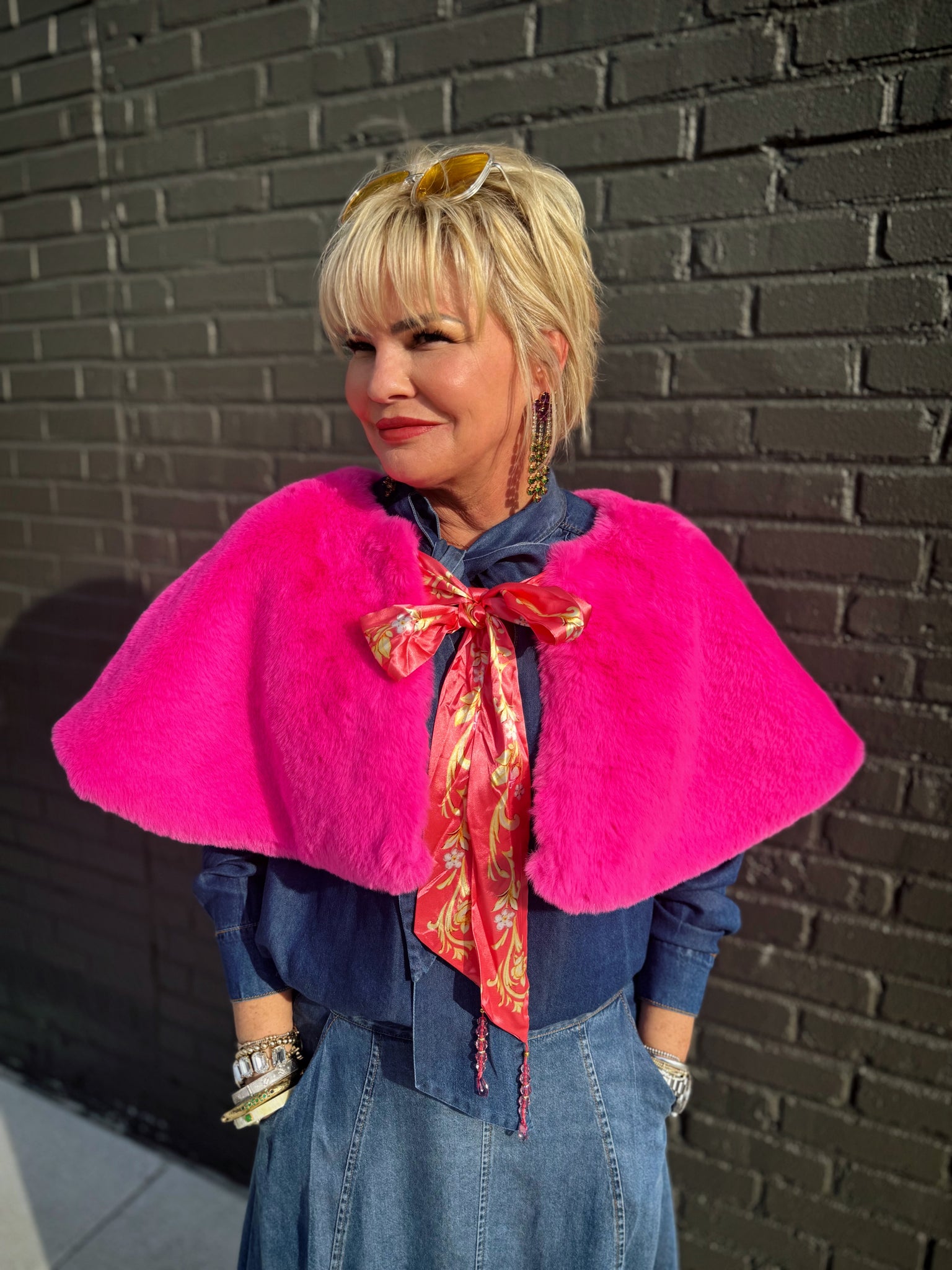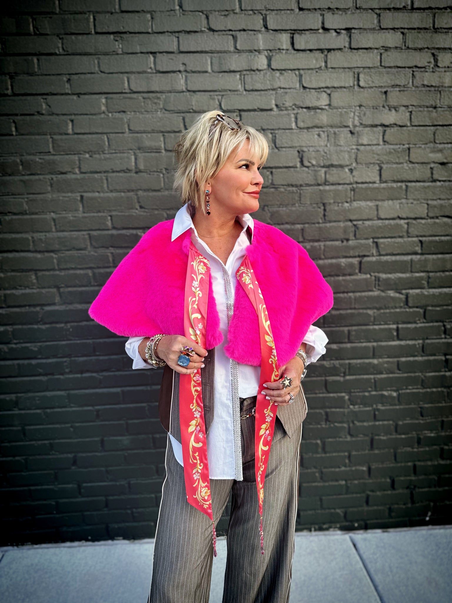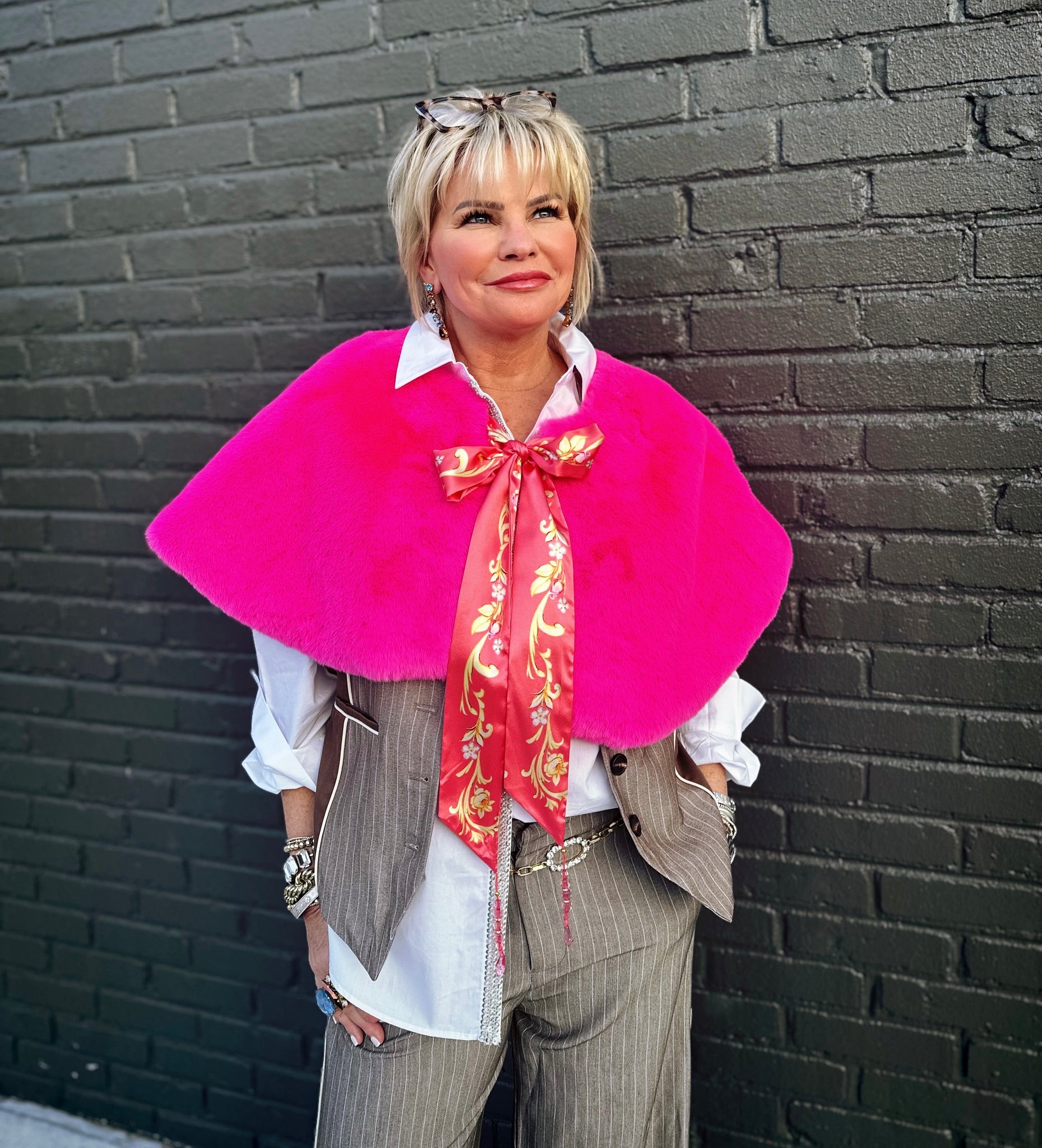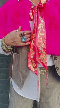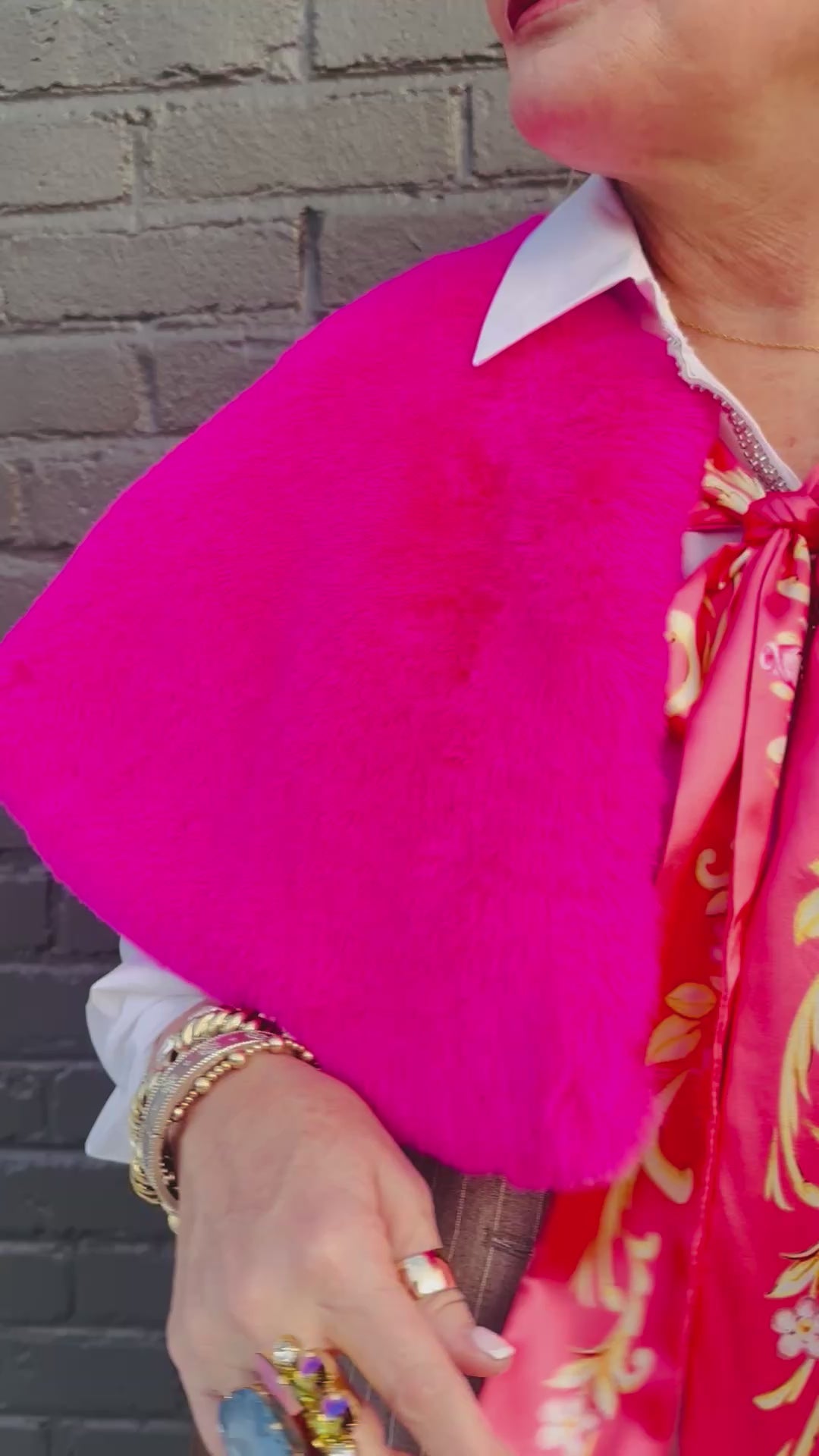 Wrap yourself in pure glamour with the Fiona Reversible Fur Cape in Pink—a show-stopping piece that doubles your style options. This luxurious faux fur cape features a stunning hot pink exterior that's perfect for making a dramatic entrance, while the reverse side reveals a charming floral print satin lining for a completely different vibe. The matching floral print tie is adorned with sparkling crystal tassels that catch the light beautifully, adding an extra touch of elegance and playfulness. Wear it one way for bold sophistication or flip it for delicate femininity—the choice is yours. Whether you're heading to a special event or elevating your everyday look, this reversible cape is your ticket to turning heads. Dry clean only to maintain its luxurious finish.