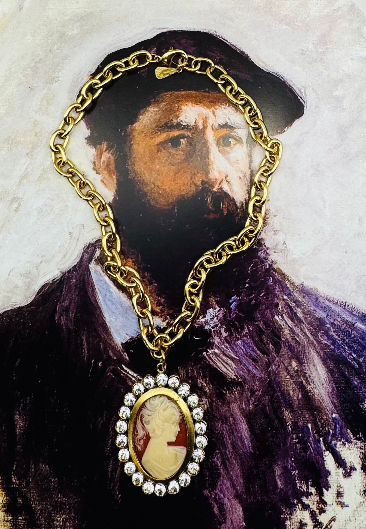 Elevate your style with the Hale Cameo Necklace, a charming blend of vintage flair and modern sparkle. Featuring a classic cameo design framed by a dazzling rhinestone border, this necklace adds a touch of whimsy to any outfit. Crafted with 22k gold plating over durable brass, it offers both shine and lasting quality. Plus, its adjustable length lets you customize your look effortlessly, making it perfect for layering or wearing solo. Add a playful twist to your jewelry collection with this timeless piece that’s as fun as it is elegant.