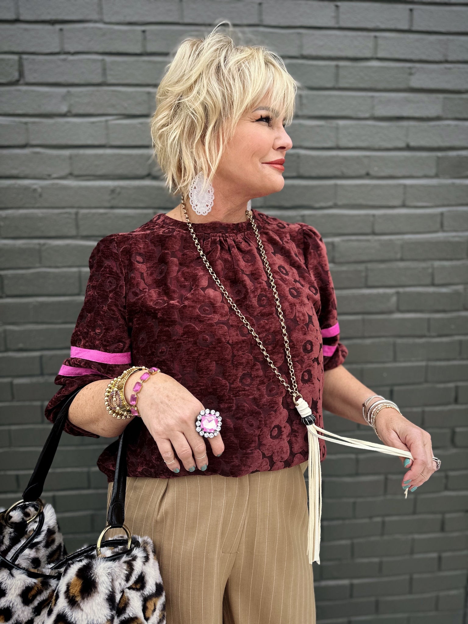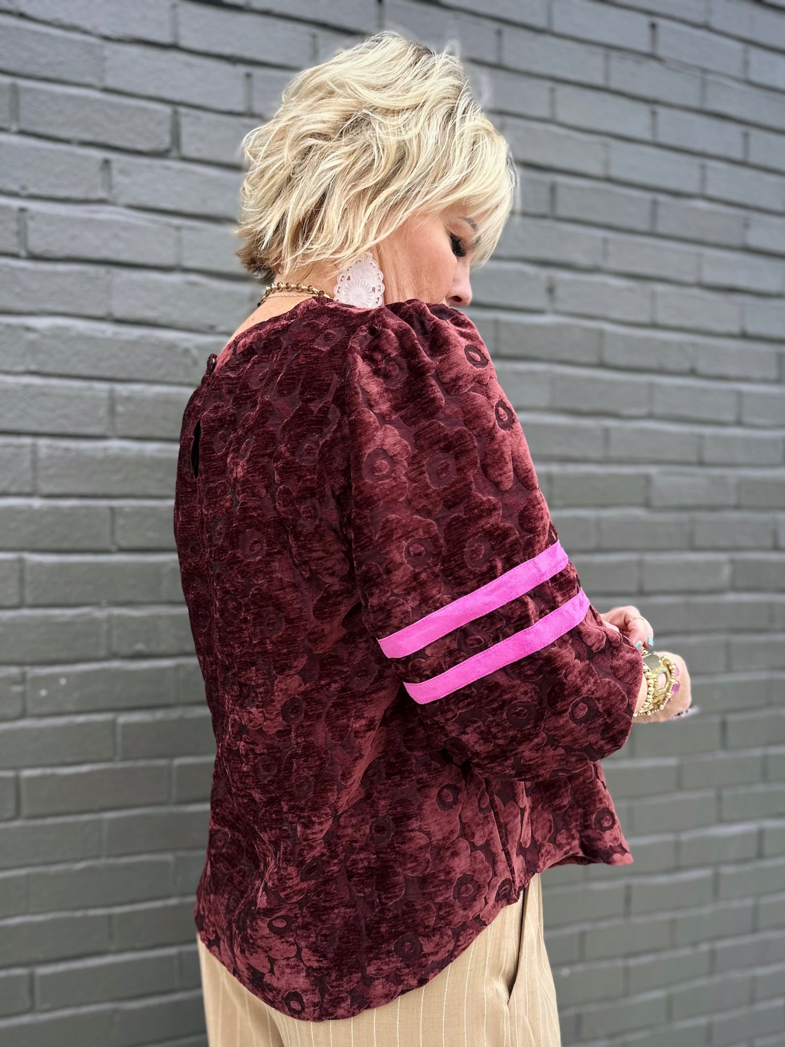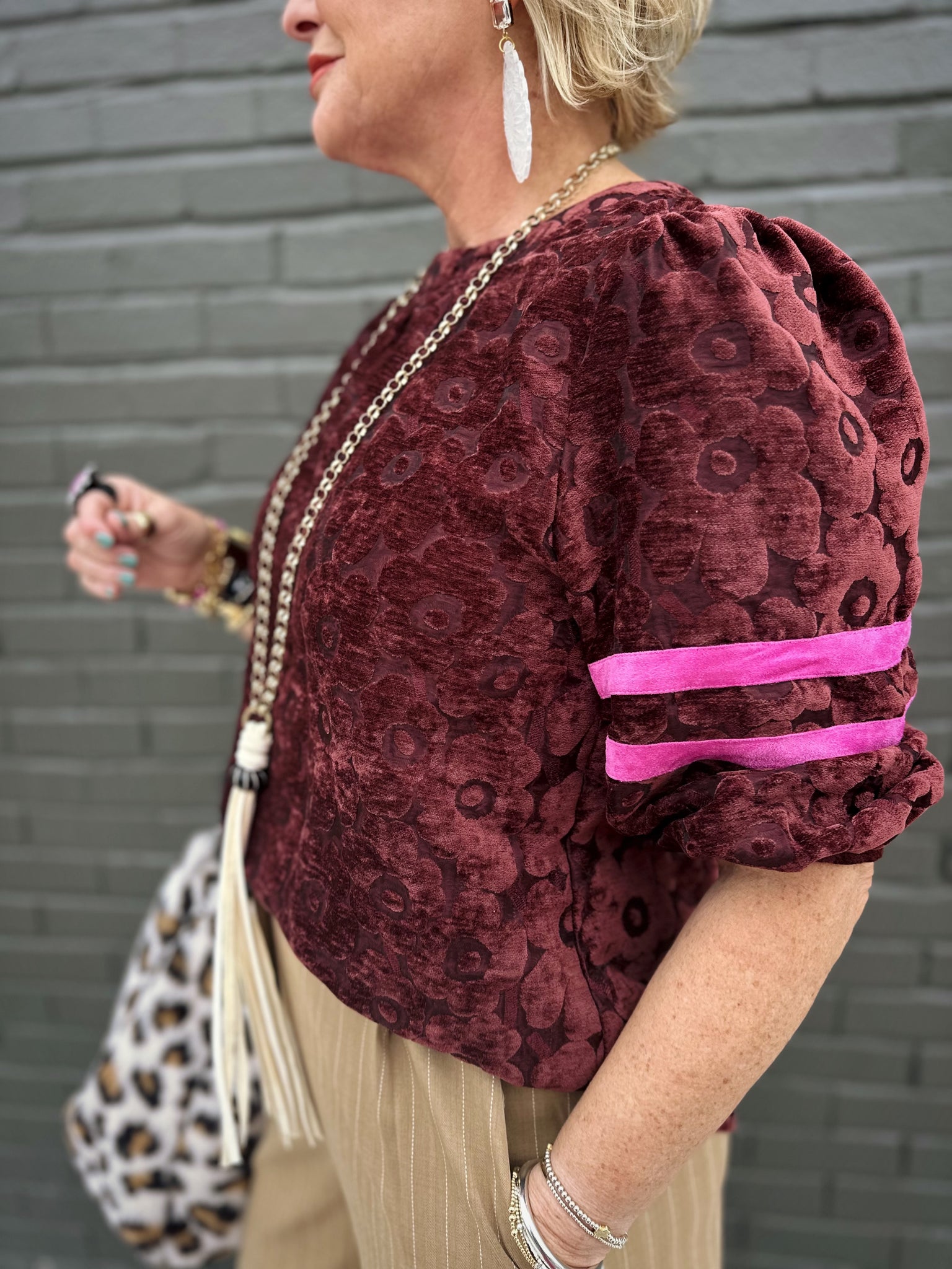 Elevate your everyday style with the Haus Track Top, where sporty sophistication meets playful charm. This burgundy velvet beauty features a luxurious floral texture that catches the light beautifully, paired with eye-catching pink stripe details running down the half puff sleeves for that perfect pop of personality. The rounded neckline is finished with a subtle band, while a functional back neck loop and button closure add both style and practicality to this versatile piece. Whether you're cheering from the sidelines, heading to brunch, or building your signature boutique collection, this standout blouse delivers effortless elegance with a spirited edge. The soft, textured velvet fabric feels as good as it looks, making it a go-to favorite that transitions seamlessly from casual days to special occasions. A true color-of-the-season essential that proves you don't have to choose between comfort and statement-making style.