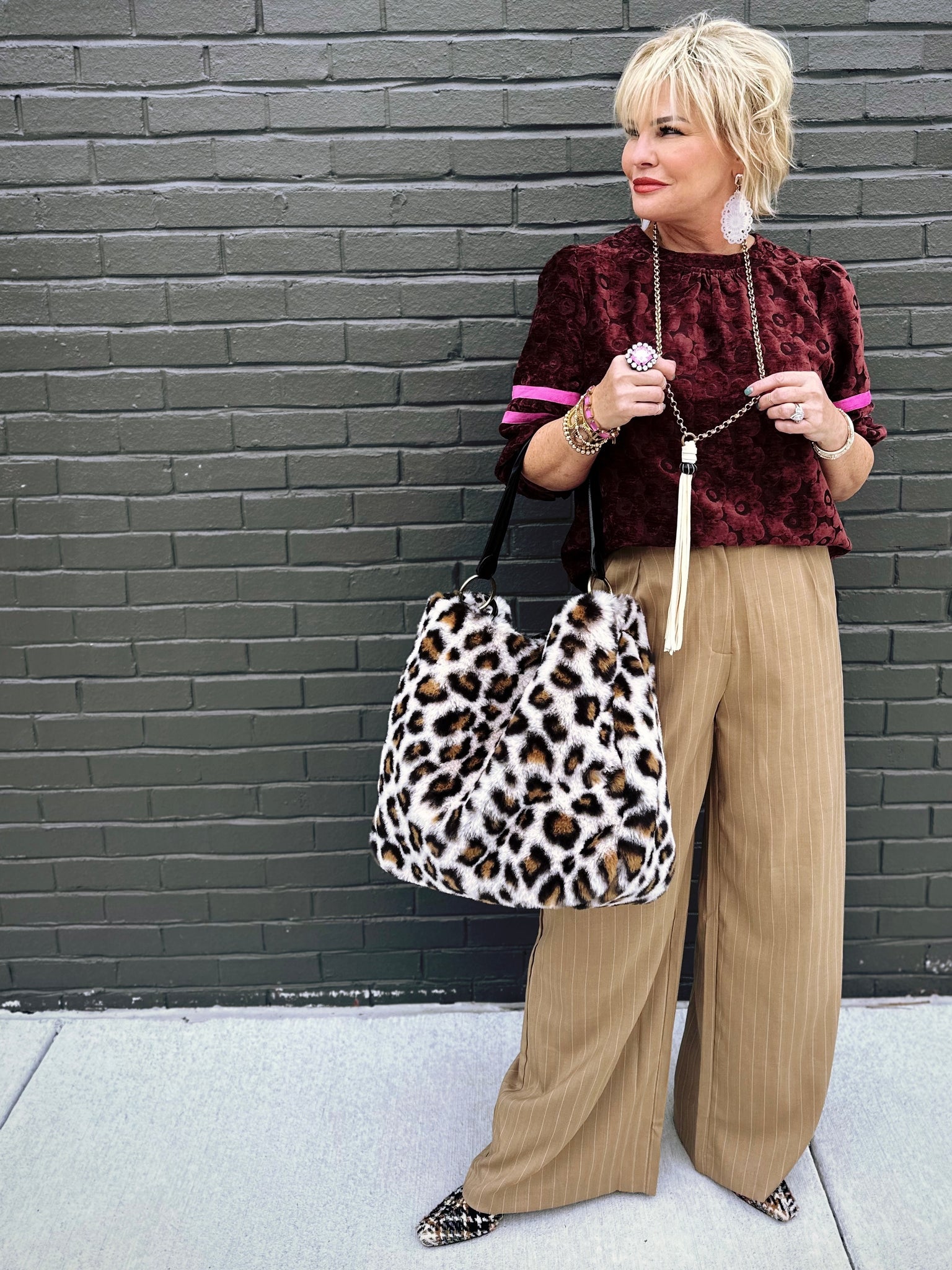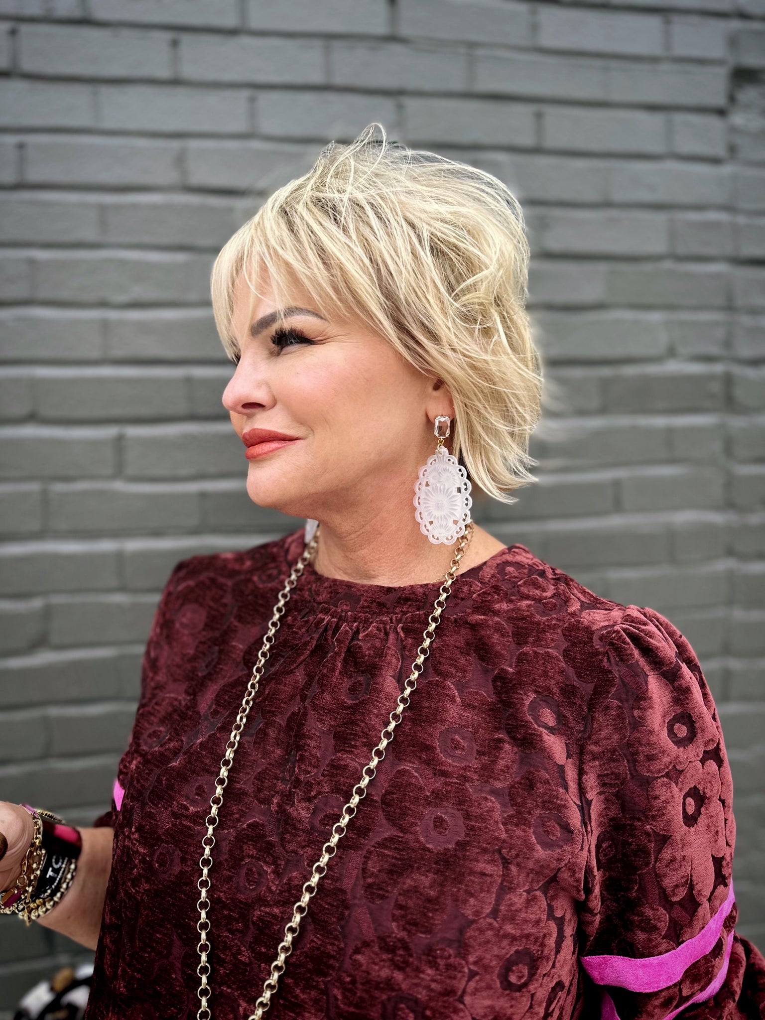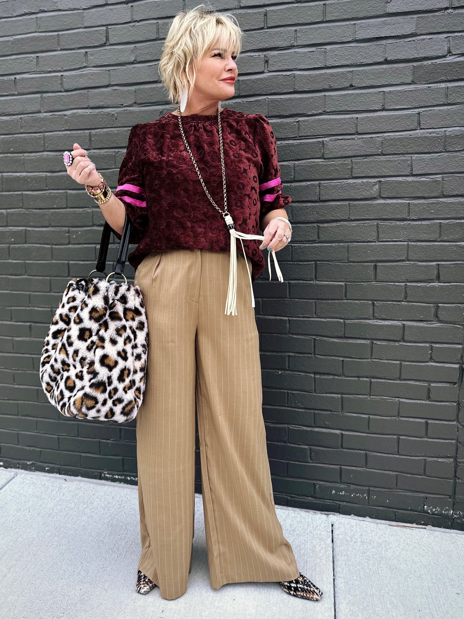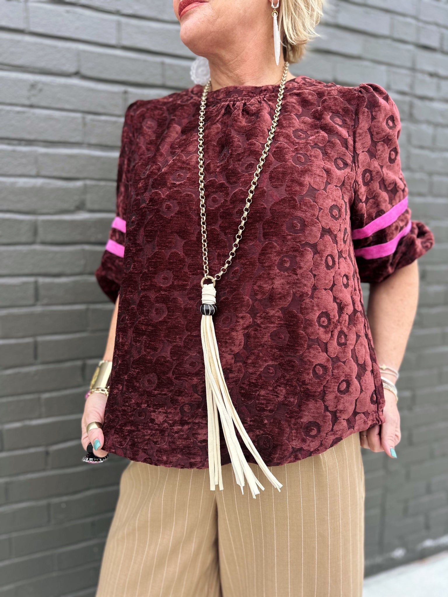 Elevate your everyday style with the Haus Track Top, where sporty sophistication meets playful charm. This burgundy velvet beauty features a luxurious floral texture that catches the light beautifully, paired with eye-catching pink stripe details running down the half puff sleeves for that perfect pop of personality. The rounded neckline is finished with a subtle band, while a functional back neck loop and button closure add both style and practicality to this versatile piece. Whether you're cheering from the sidelines, heading to brunch, or building your signature boutique collection, this standout blouse delivers effortless elegance with a spirited edge. The soft, textured velvet fabric feels as good as it looks, making it a go-to favorite that transitions seamlessly from casual days to special occasions. A true color-of-the-season essential that proves you don't have to choose between comfort and statement-making style.