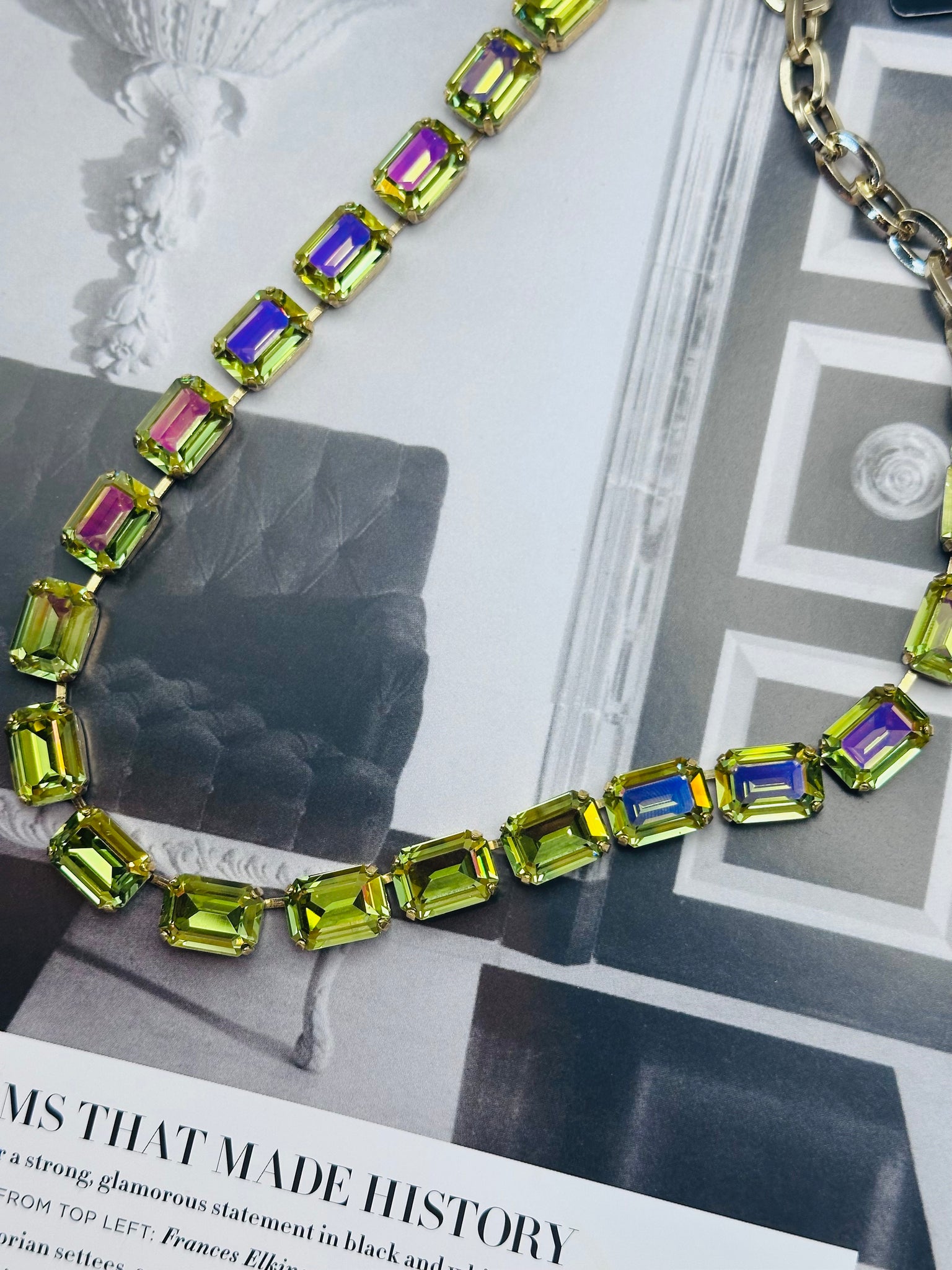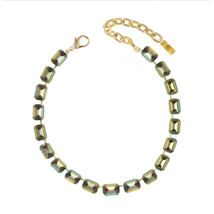 Add a pop of sparkle to your style with the Jabari Necklace in Peridot Brandy! Featuring an antique gold-plated brass base adorned with shimmering high-quality crystals, this necklace captures attention with its vibrant green hues reminiscent of peridot gemstones. The adjustable length ranges from 12.25" to 15.75", making it perfect for layering or wearing solo to highlight your neckline. Crafted with care in Canada, this dazzling piece effortlessly brings fun and flair to any outfit, whether you're dressing up for a night out or adding sparkle to your everyday look. Let the Jabari Necklace be your new go-to statement charm!