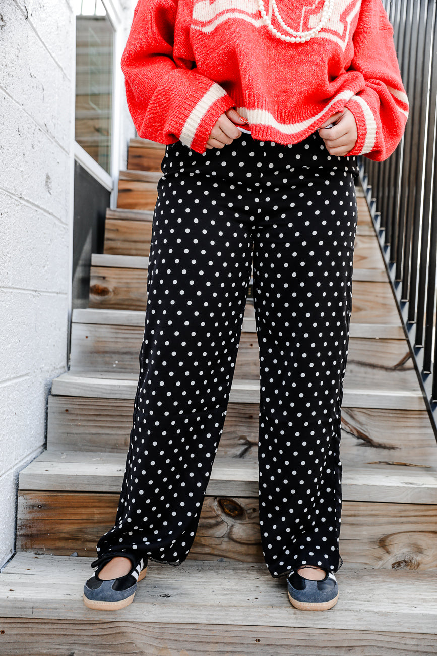 Add a pop of playful charm to your wardrobe with these Jammer Polka-Dot Pants. Crafted from smooth, 100% polyester satin, they offer a silky feel that's perfect for day-to-night wear. The elastic waistband ensures comfort and easy movement, while the straight leg fit flatters every silhouette. Delicate scalloped lace trim adds a feminine touch that makes these pants stand out. Whether paired with a simple top or dressed up for a night out, these polka-dot beauties bring fun and flair to any outfit. Embrace effortless style with a hint of whimsy in every step.