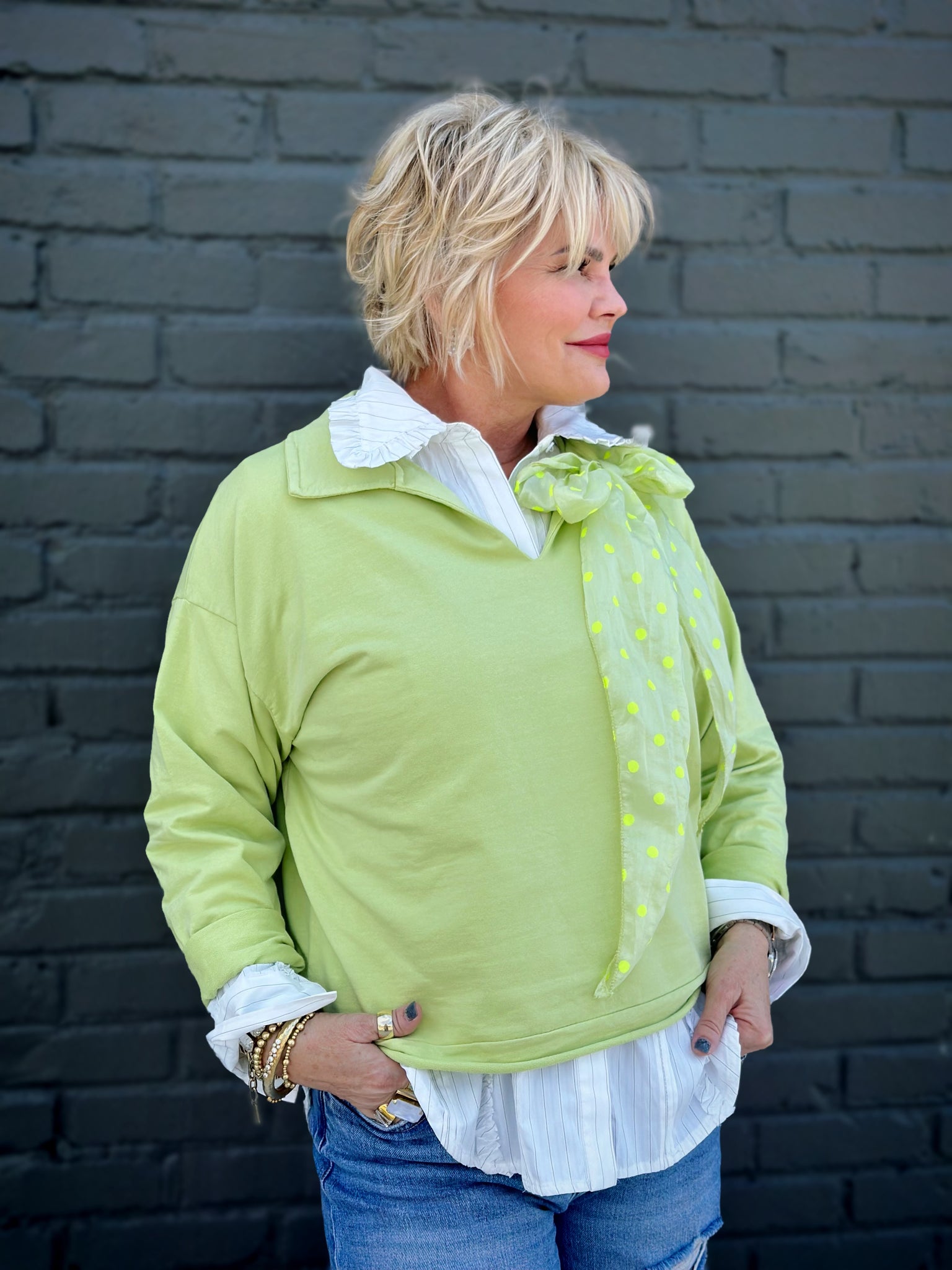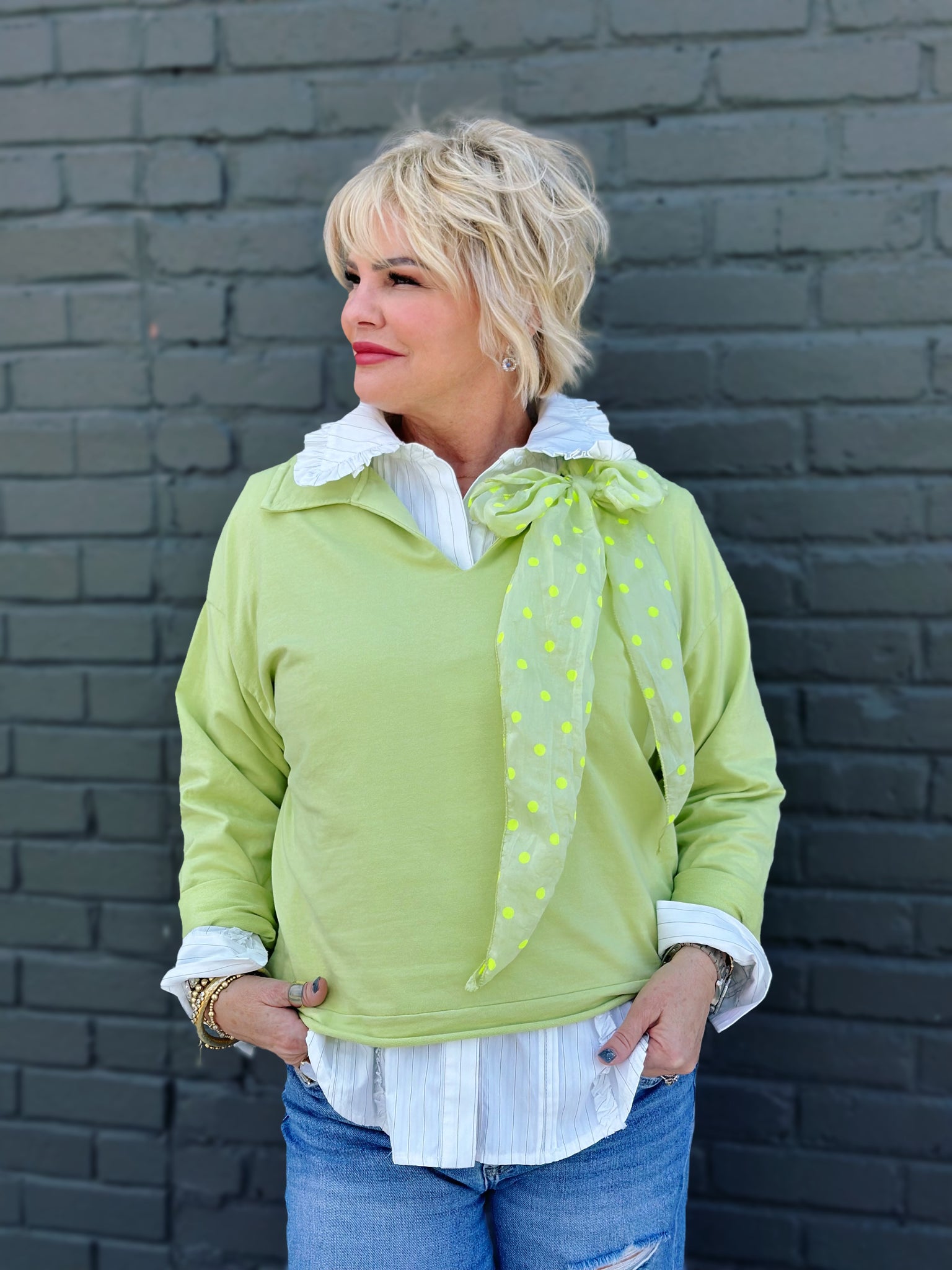 The Juliep Pullover features a classic v-neck with collar design in a fresh celery tone. This lightweight pullover includes a removable twilly—a versatile accessory that doubles as a belt, neck scarf, or pants accent for endless styling possibilities. The rolled hem adds a polished finish. Mix and match the colorful twilly with other outfits to refresh your wardrobe instantly.