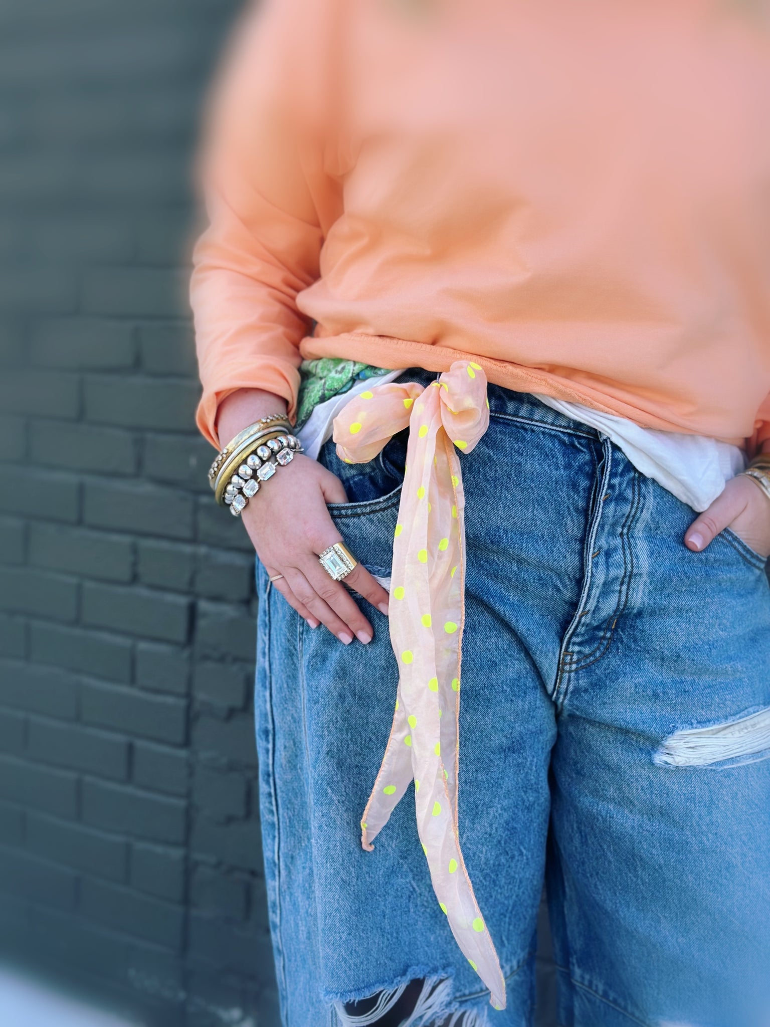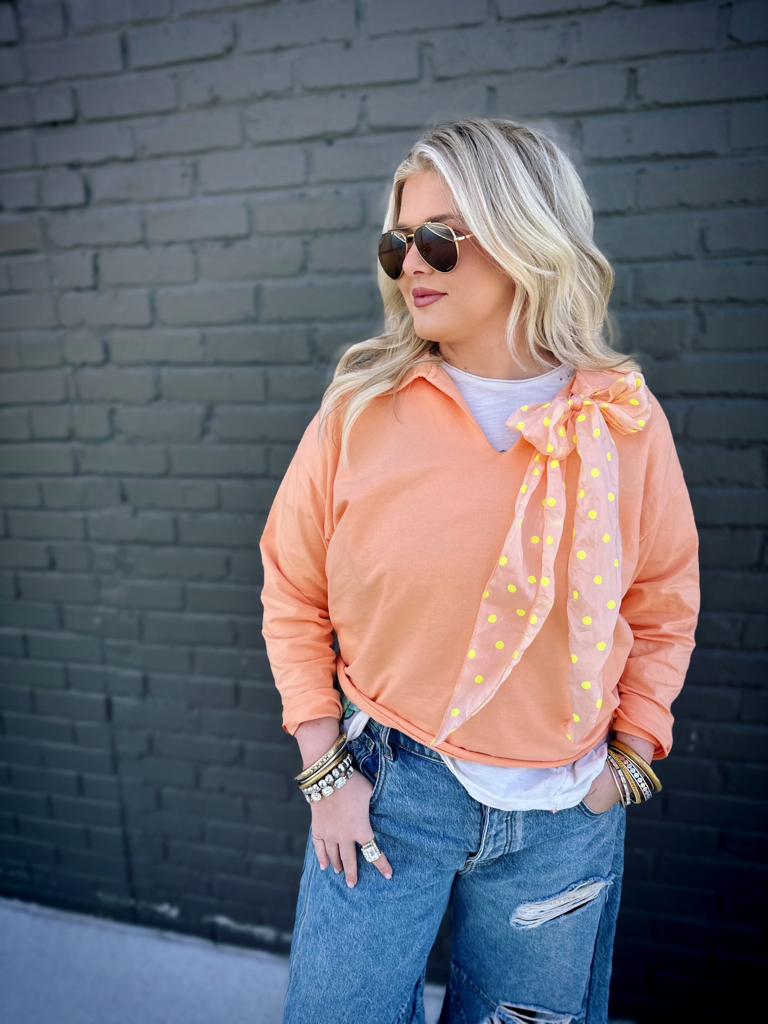The Juliep Pullover features a classic v-neck with collar design in a fresh tangerine tone. This lightweight pullover includes a removable twilly—a versatile accessory that doubles as a belt, neck scarf, or pants accent for endless styling possibilities. The rolled hem adds a polished finish. Mix and match the colorful twilly with other outfits to refresh your wardrobe instantly.