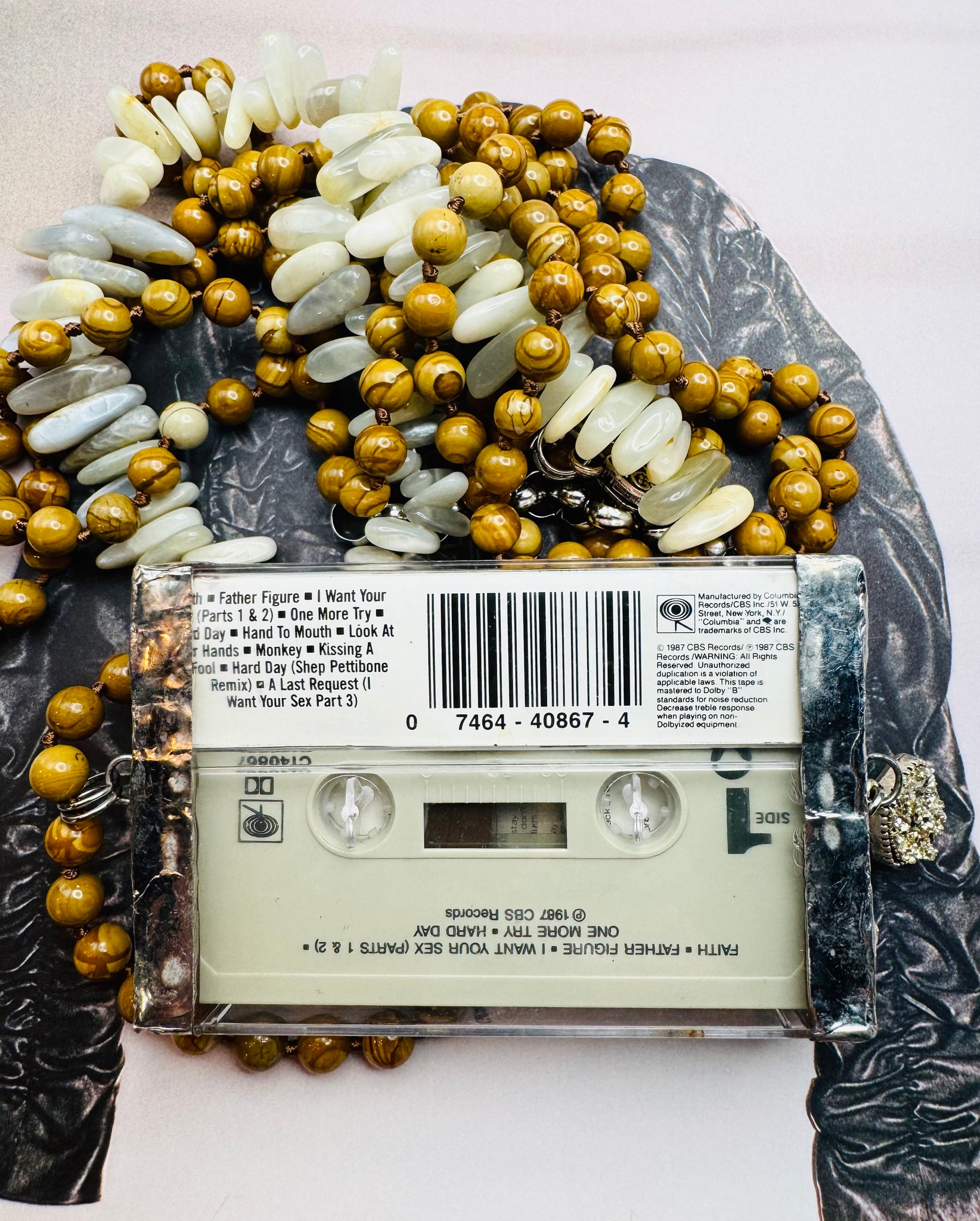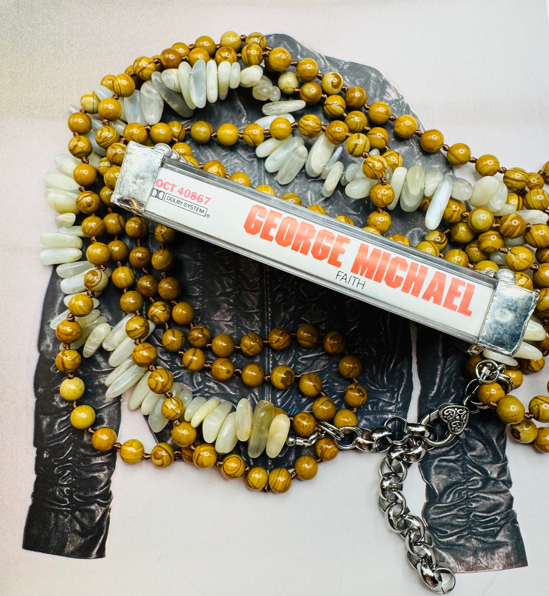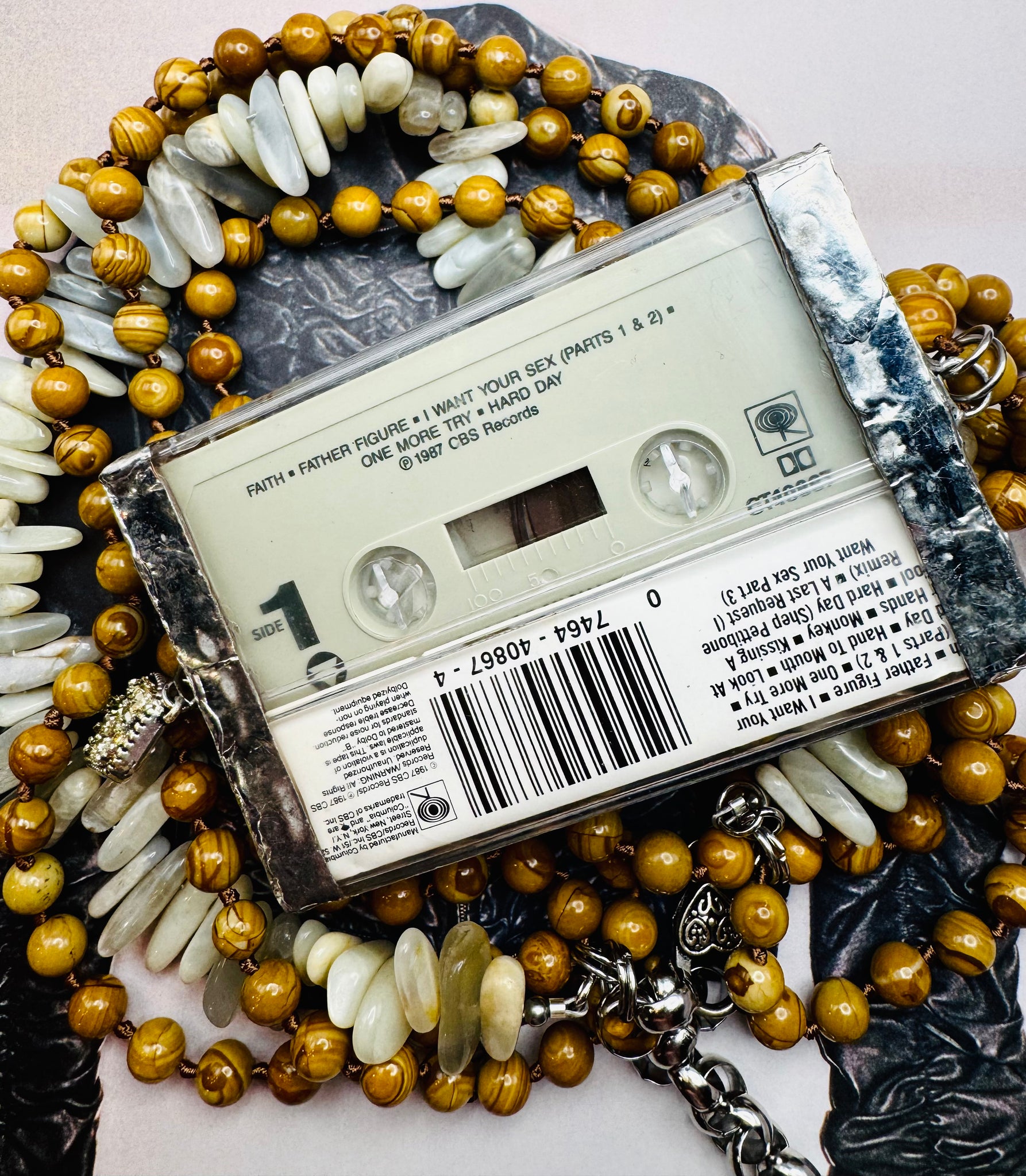 Elevate your style with the Kissing A Fool Cassette Necklace. Featuring an original cassette and case from George Michael's Faith soundtrack, this necklace adds a touch of uniqueness to any outfit. Multiple strands of matching beads elegantly display the cassette, making it an eclectic and fashionable accessory.