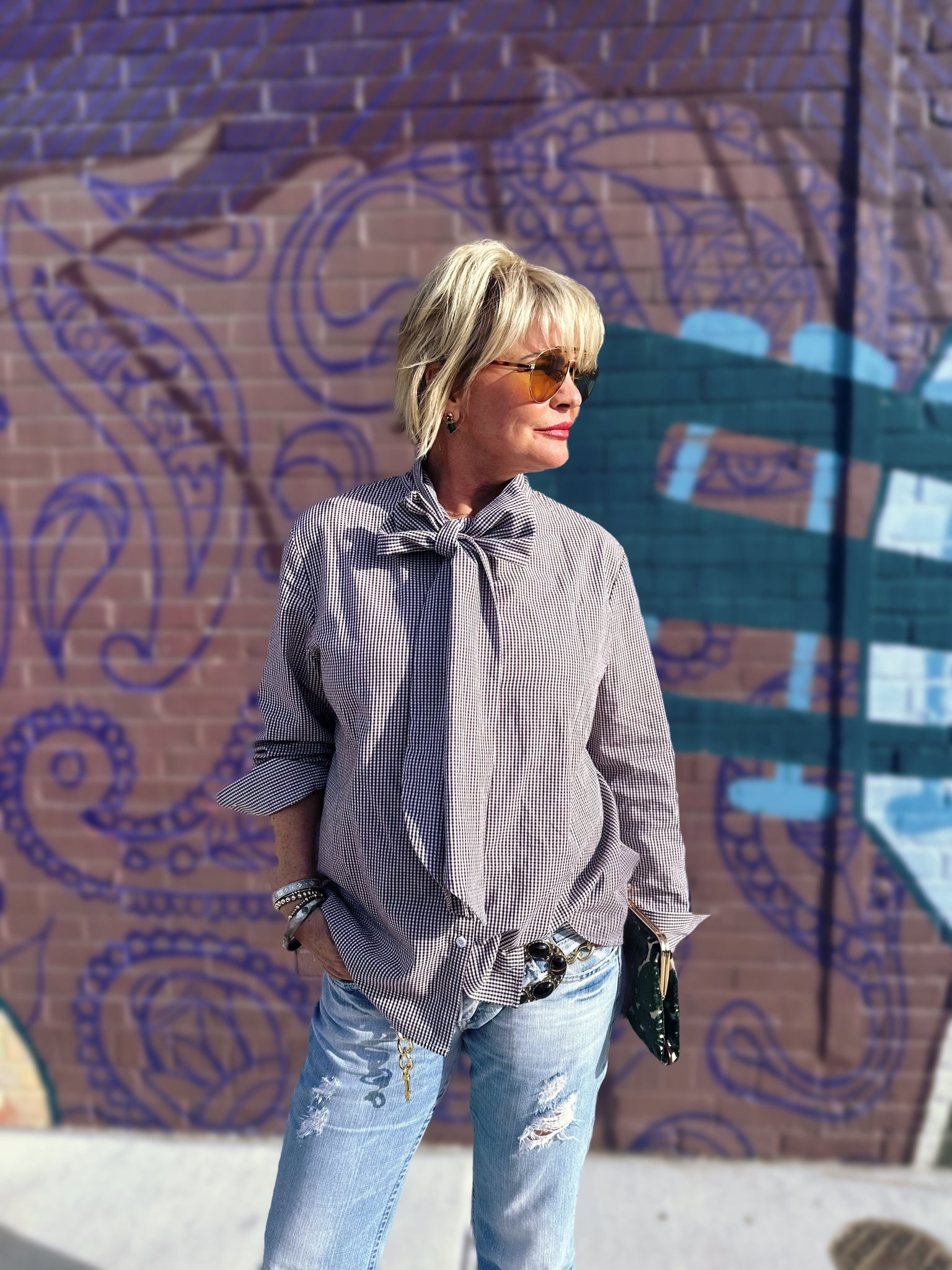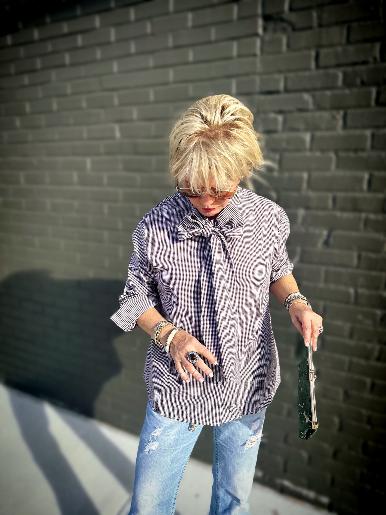 Indulge in timeless style with our Lauren Bow Top. Versatile for any season, it can be worn as a stand-alone piece or paired with a sweater, blazer, or t-shirt. The biggest decision is to..tie the bow or no bow. Either way, you will look fabulous. The elegance of this top is undeniable. Make a statement with sophisticated fashion.