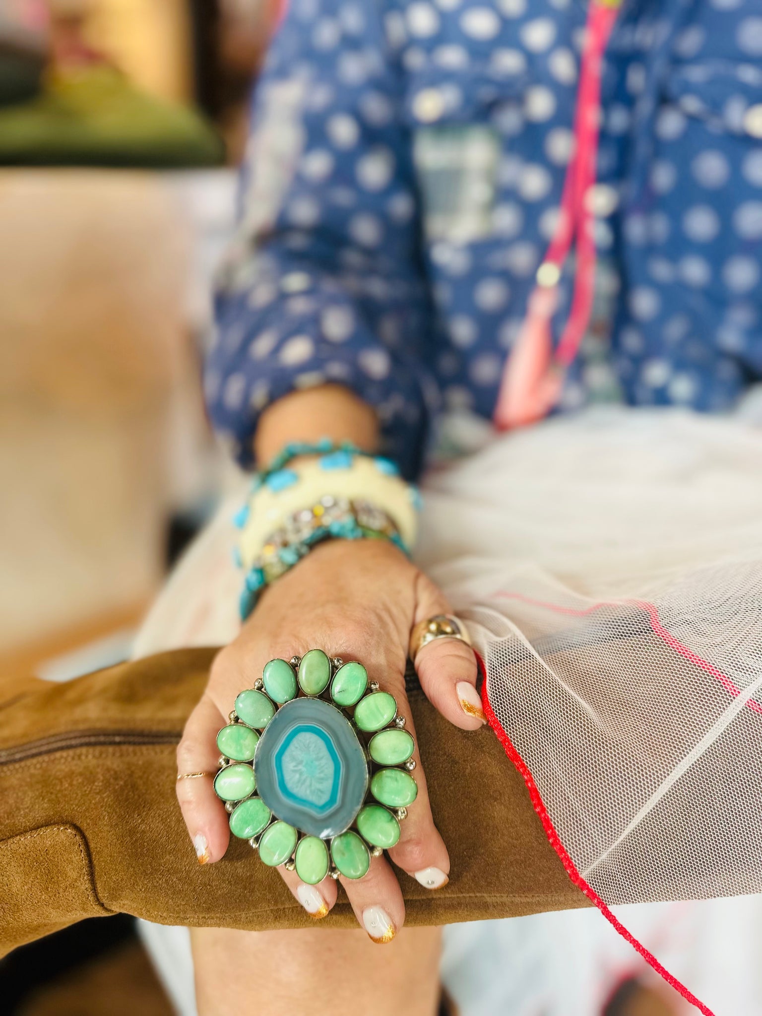 Discover the Layers Of Envy Ring, featuring a vibrant blue agate slice that stretches to an adjustable 2 1/2 inches in diameter. This eye-catching centerpiece is embraced by a lively border of green turquoise, creating a bold contrast that adds a splash of color to your look. Perfect for those who love unique, playful accessories, this ring easily adapts to fit your finger with a comfortable, customizable design. Add a touch of bold charm and natural beauty to any outfit with this striking statement piece.