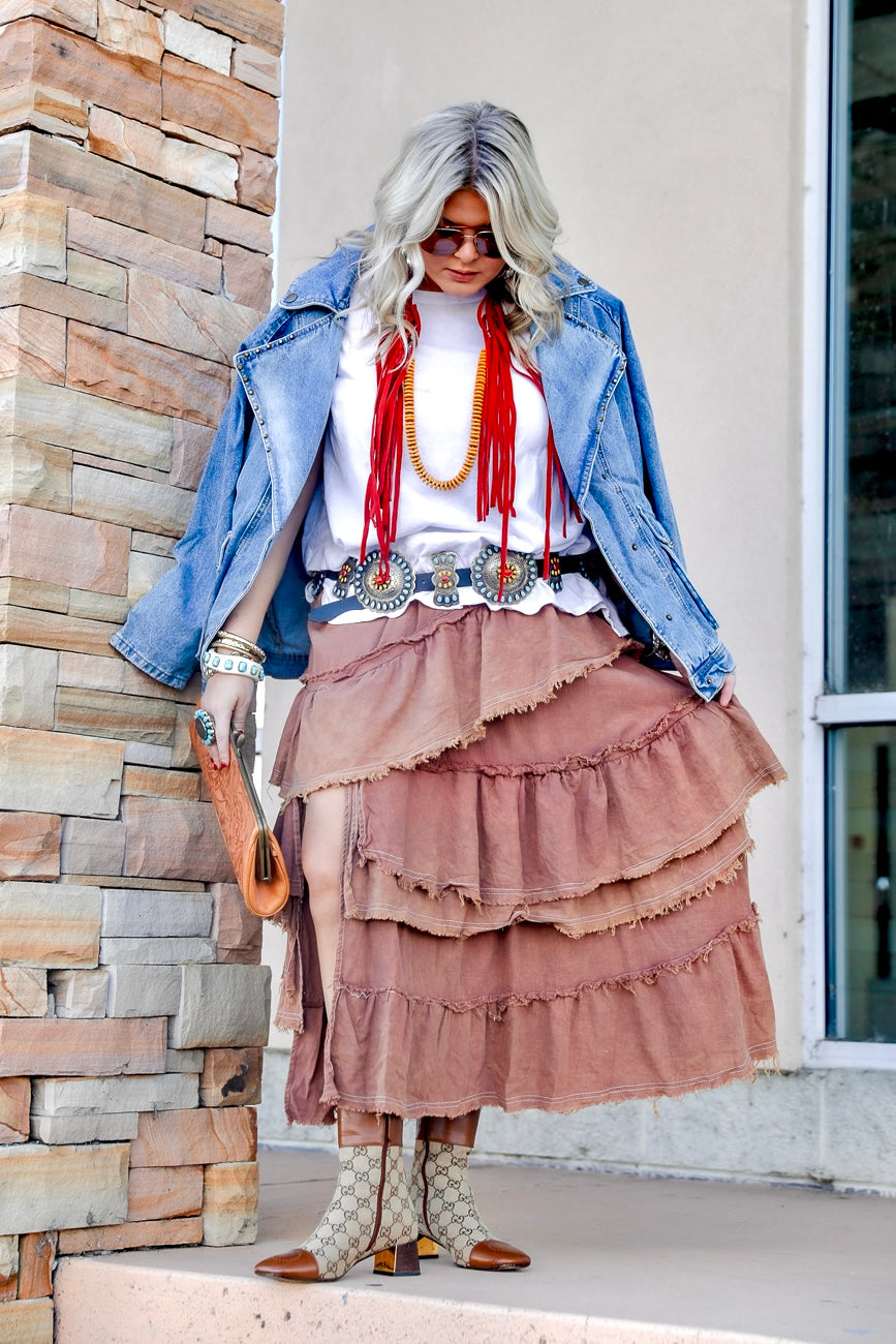 The Lewellyn Layered Skirt offers a relaxed fit with a full-length silhouette that moves effortlessly with you. Featuring an elastic smocked back waistband for comfort and a convenient side zipper for a secure fit, this skirt combines style and ease. Distressed edge detailing and a front slit add a playful, edgy touch to your look. Crafted from mineral-washed, 100% cotton woven fabric, it's lightweight and breathable—perfect for days when you want to feel free and fabulous. Embrace layers and texture with this versatile skirt that brings a fun twist to your wardrobe.