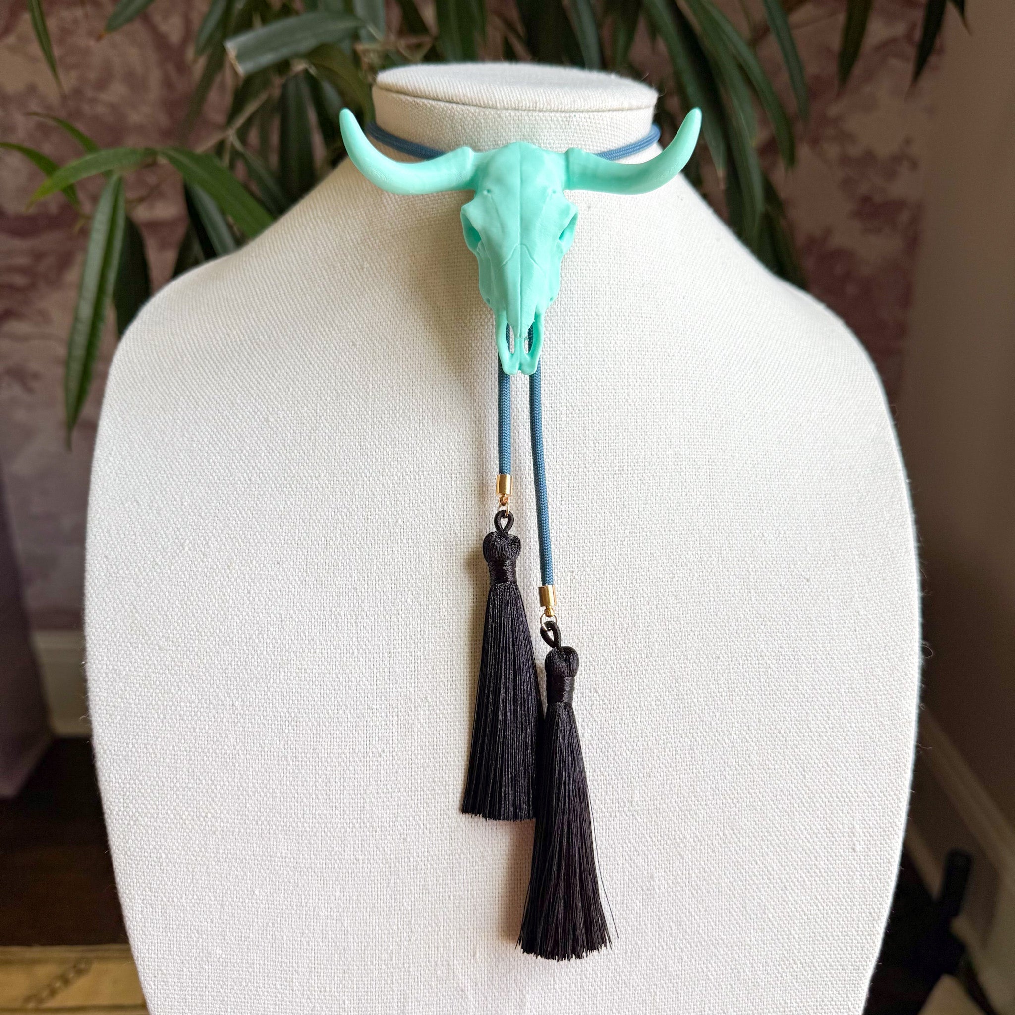 Bring out your inner wild child with this bold bolo necklace that’s equal parts rodeo and runway. Featuring a statement longhorn centerpiece and finished with swingy tassels, it’s a little bit Western, a little bit party, and a whole lot of personality. Perfect for anyone who loves to turn heads and kick up some fun, this necklace is ready to lasso compliments wherever you go.