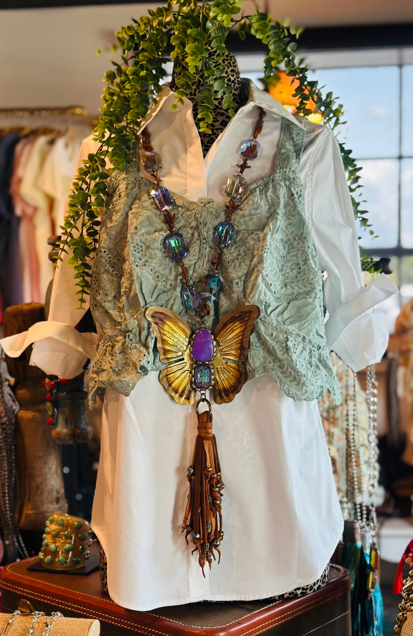 Fly into the fashion world with this handmade statement necklace! Only for daring fashionistas, this piece boasts a large metal butterfly adorned with stunning purple iridescent glass crystals. Make a bold statement and stand out from the crowd with this unique and eye-catching accessory.