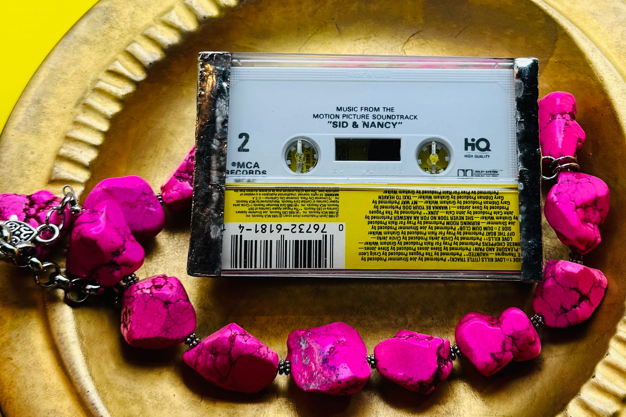 Own a piece of punk history with Love Kills Cassette Necklace! This original cassette & case from the movie "Sid & Nancy, Love Kills" has been repurposed into a bold hot pink rock necklace. Embrace your love for risk-taking and adventure with this unique piece.
