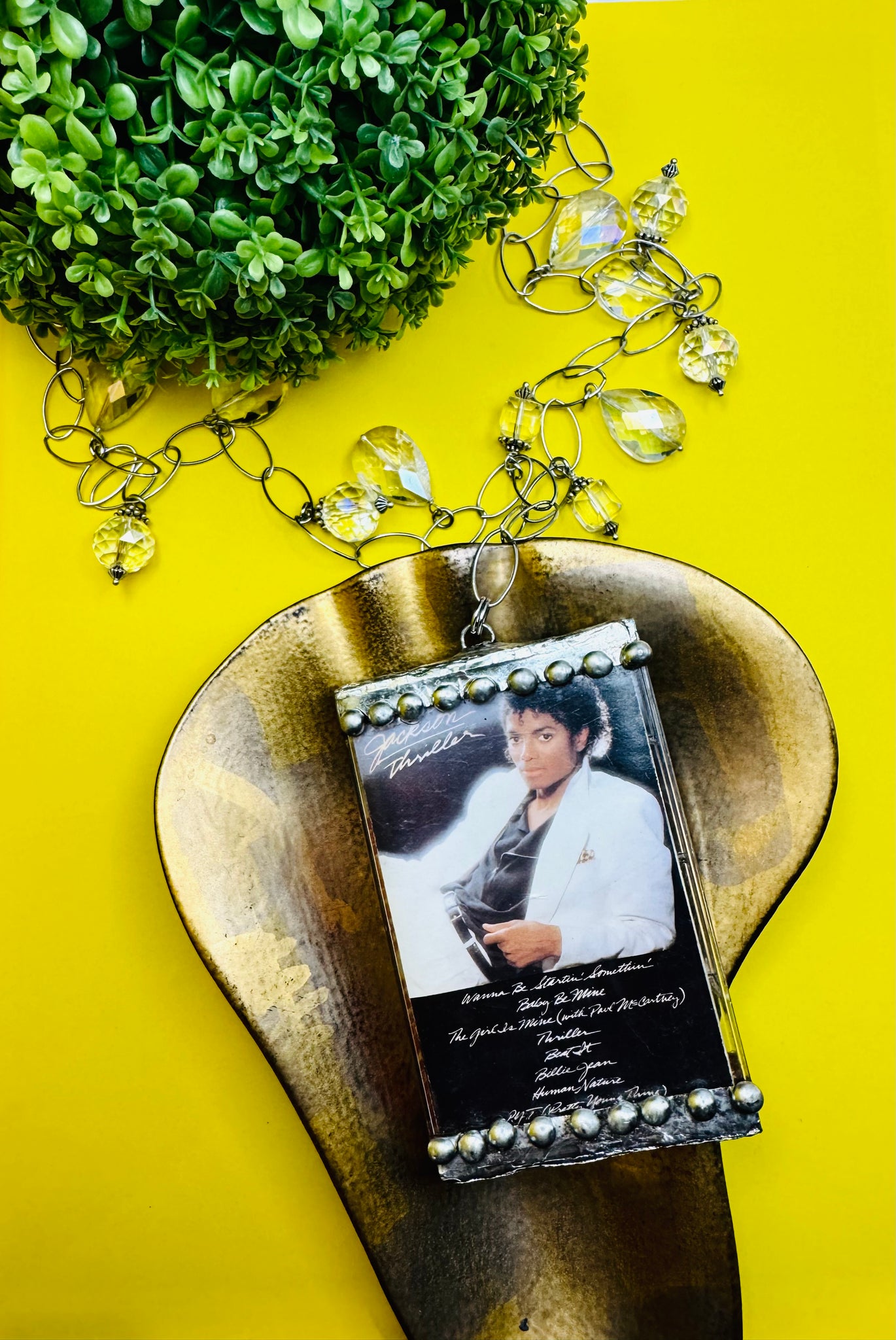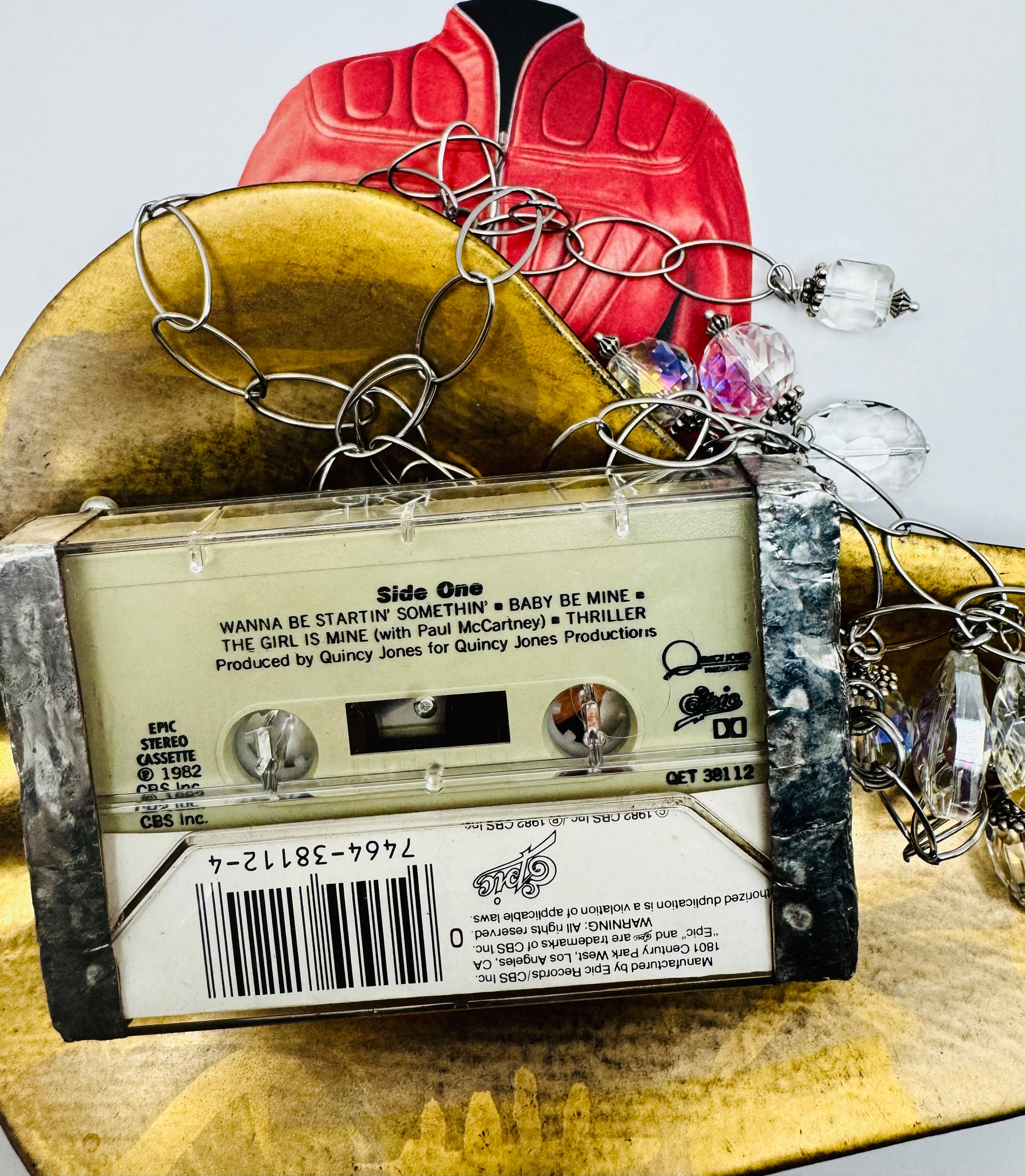 Capture the magic of the 80's with MJ's Thriller Cassette Necklace. Individually crafted from the original cassette and case of Michael Jackson's iconic album, this necklace is a must-have for any true fan. Recreate the excitement of the era and add a touch of nostalgia to your style. Limited quantities available, so grab yours now!