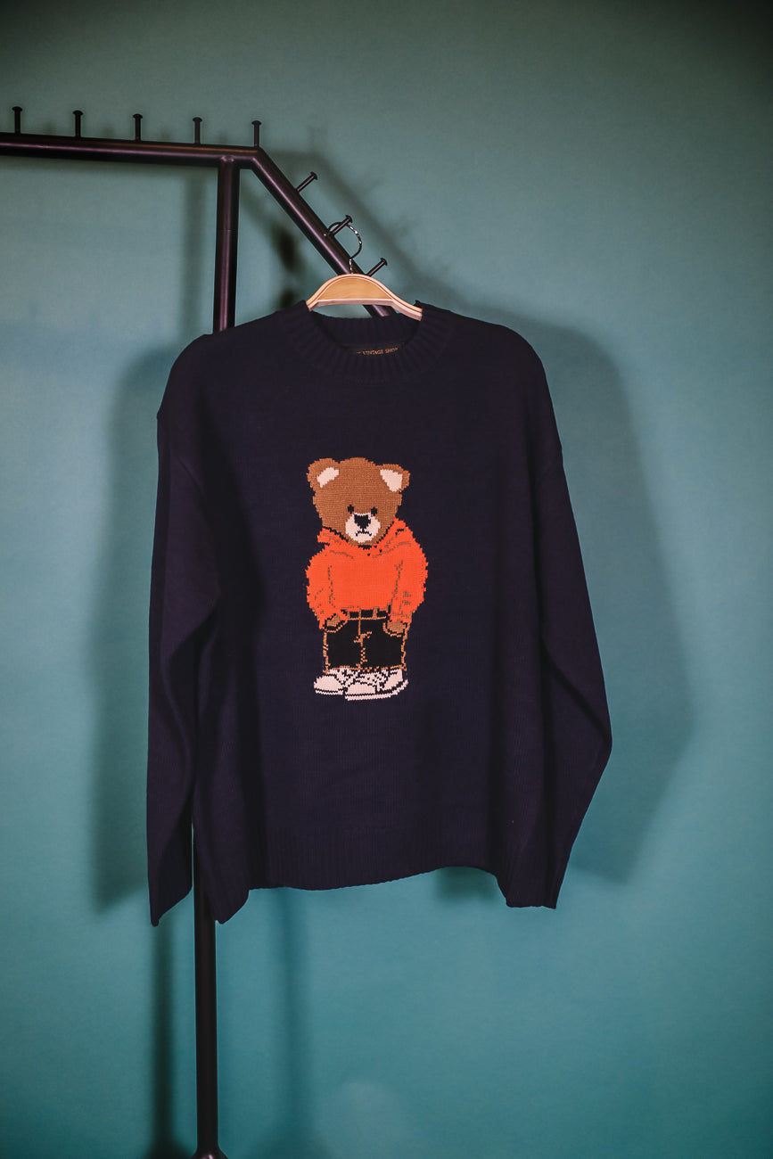 The Mr. Scruggs Sweater brings cozy charm to your wardrobe with its navy base and an adorable teddy bear wearing a bright orange hoodie, reminiscent of classic Ralph Lauren style. Crafted from 100% acrylic, this sweater is lightweight and perfect when you want warmth without bulk. Its oversized fit invites comfort and makes layering a breeze, while the playful design adds a fun twist to your everyday look. Whether lounging at home or stepping out for a casual day, this sweater keeps you effortlessly stylish and snug.