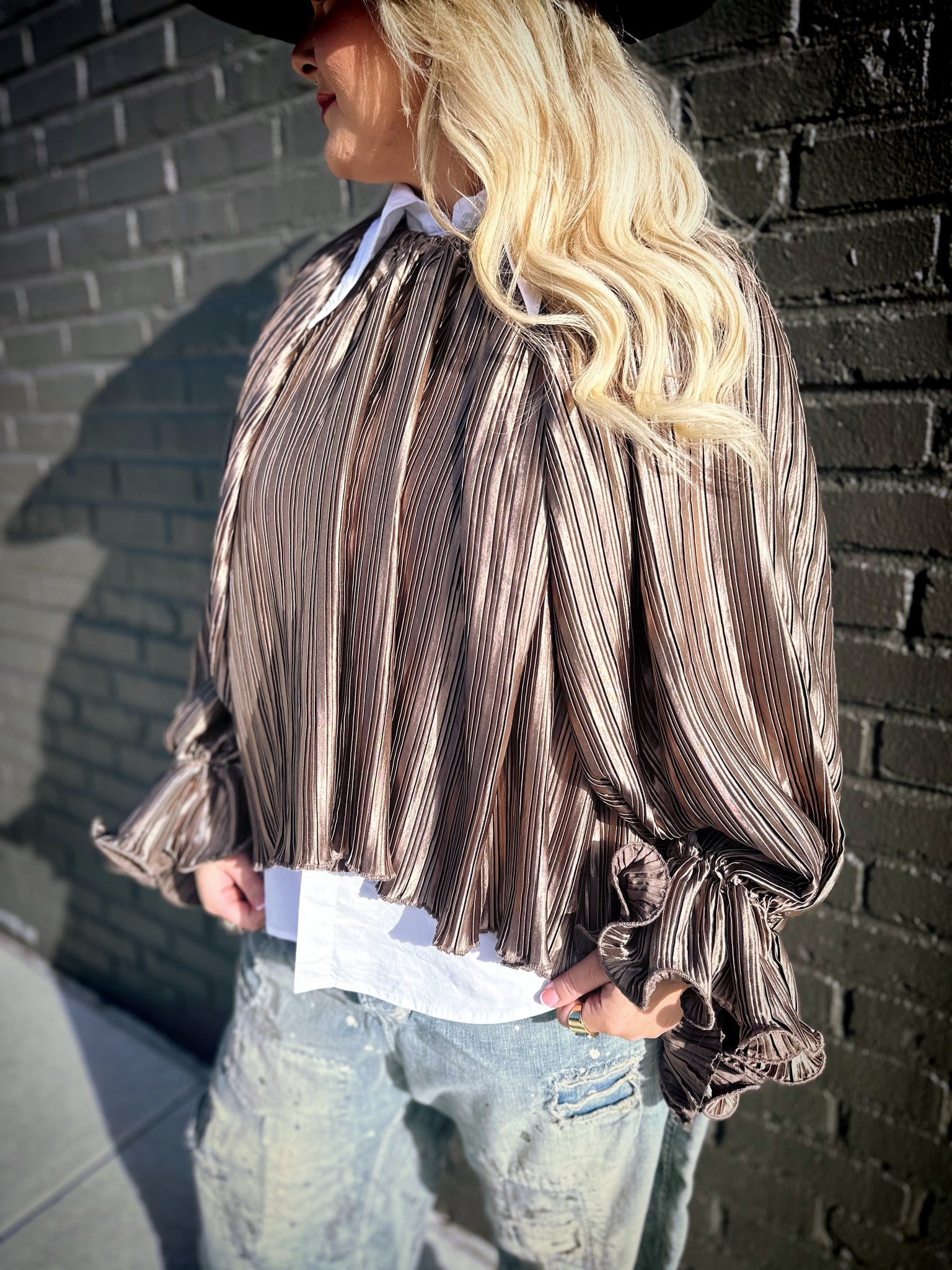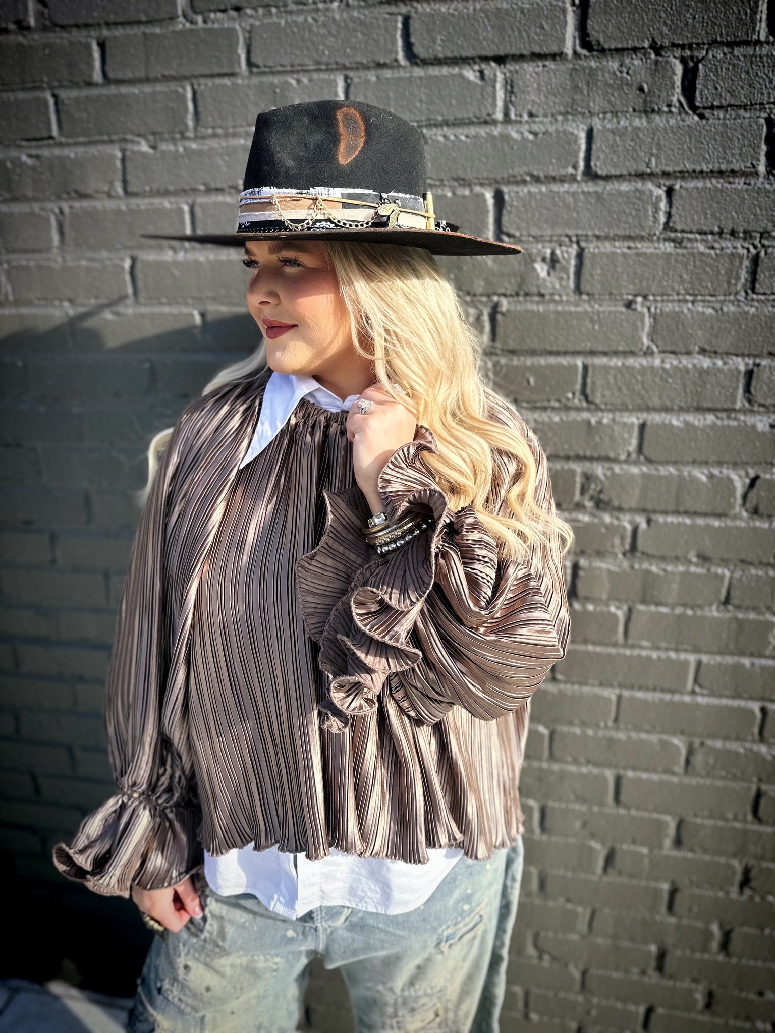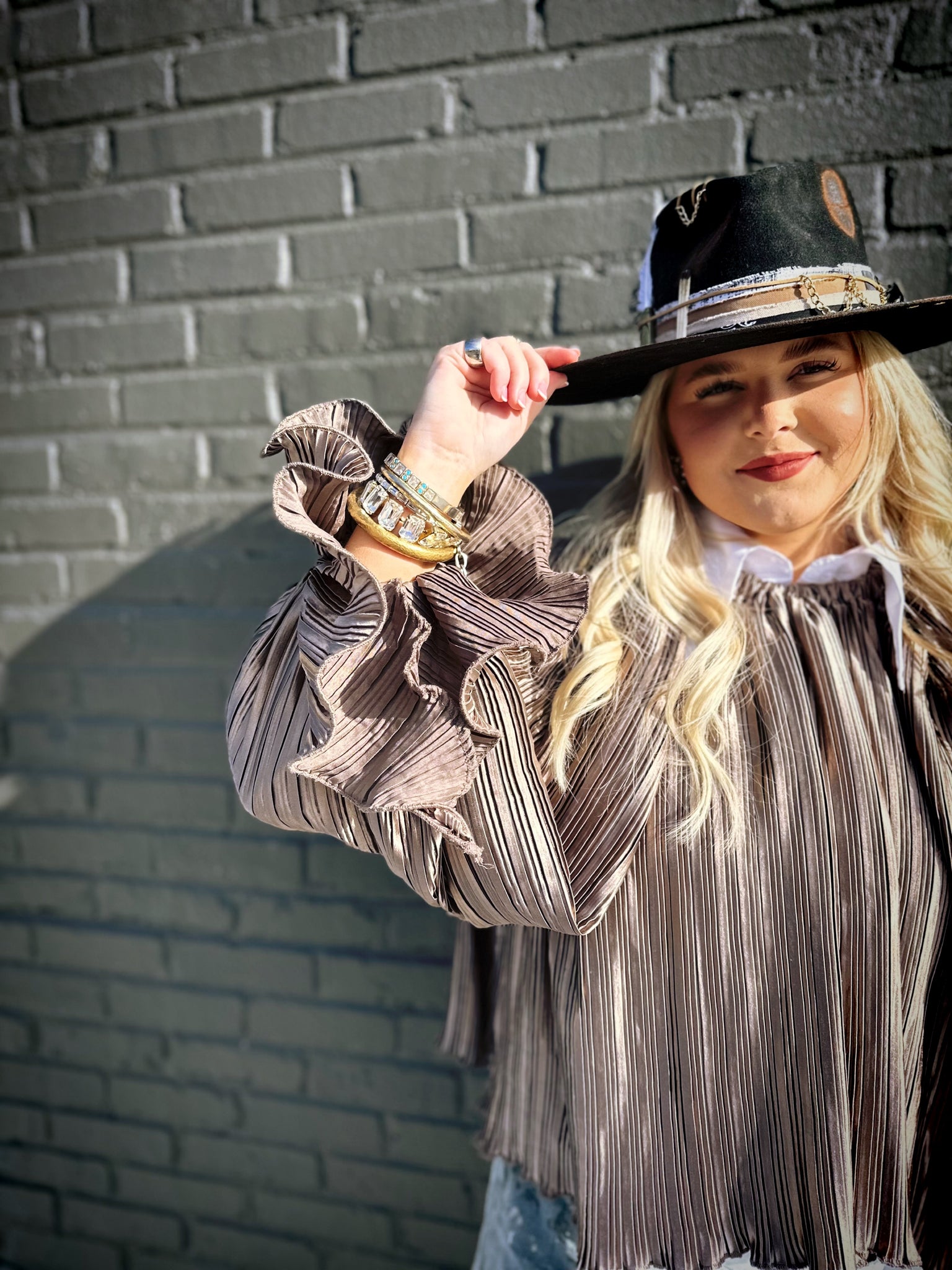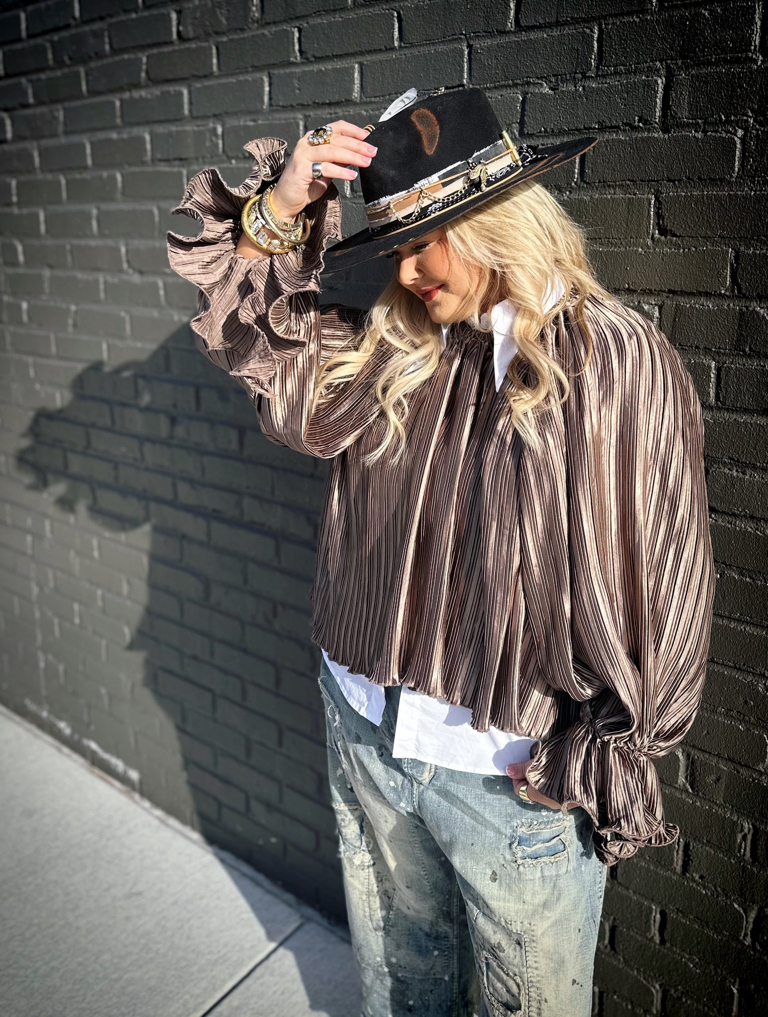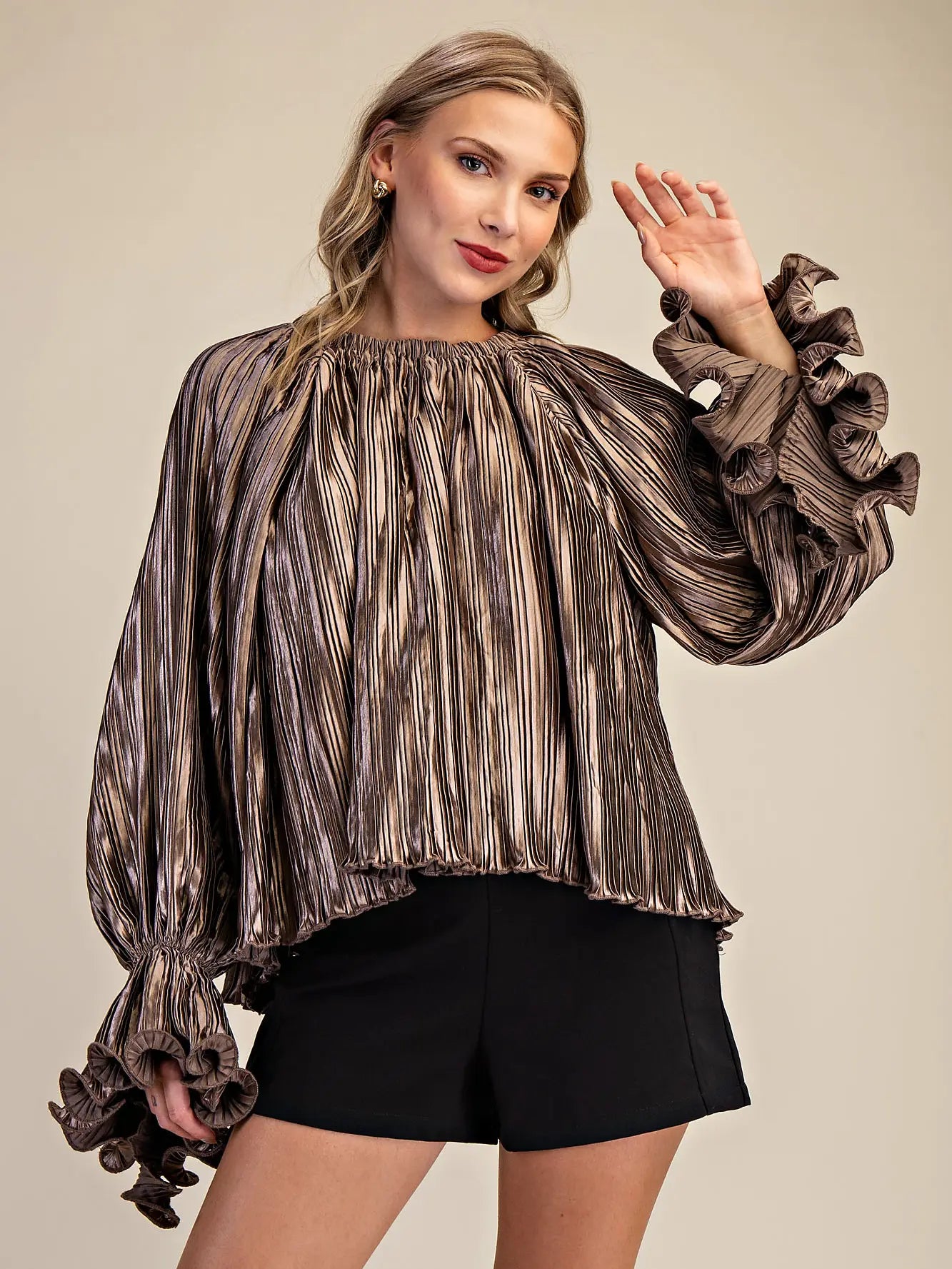 Nick of Time Top in Bronze is the statement piece your wardrobe's been waiting for. This playful pleated ruffle top features an elastic neckline for effortless comfort and charming ruffle sleeves that add movement and dimension. The angled cut creates a flattering silhouette that works beautifully for both casual outings and dressed-up occasions. The rich bronze tone is versatile enough to pair with your favorite jeans or layer under jackets. Whether you're rushing to catch the moment or taking your time to shine, this top delivers style that never goes out of fashion.