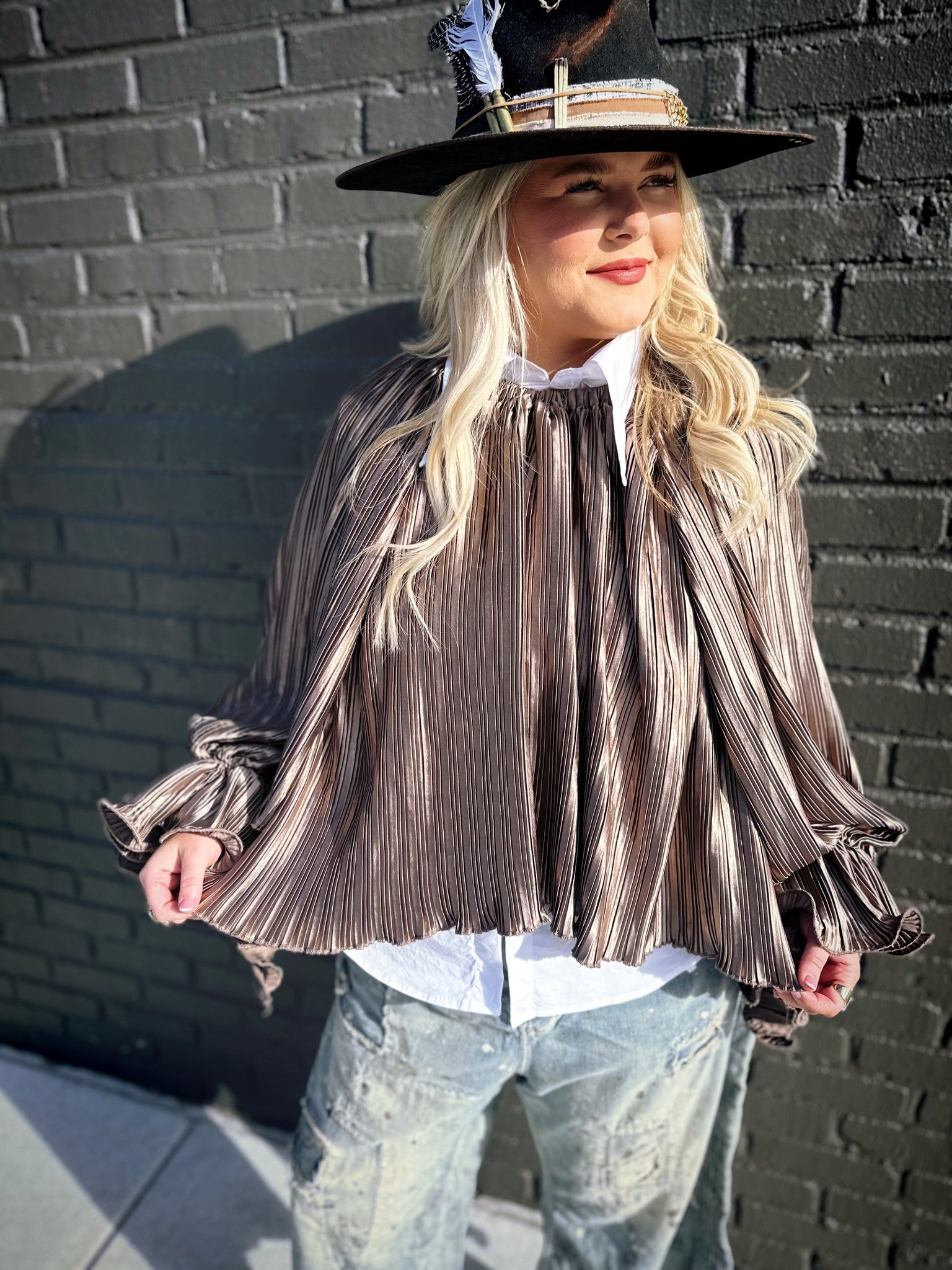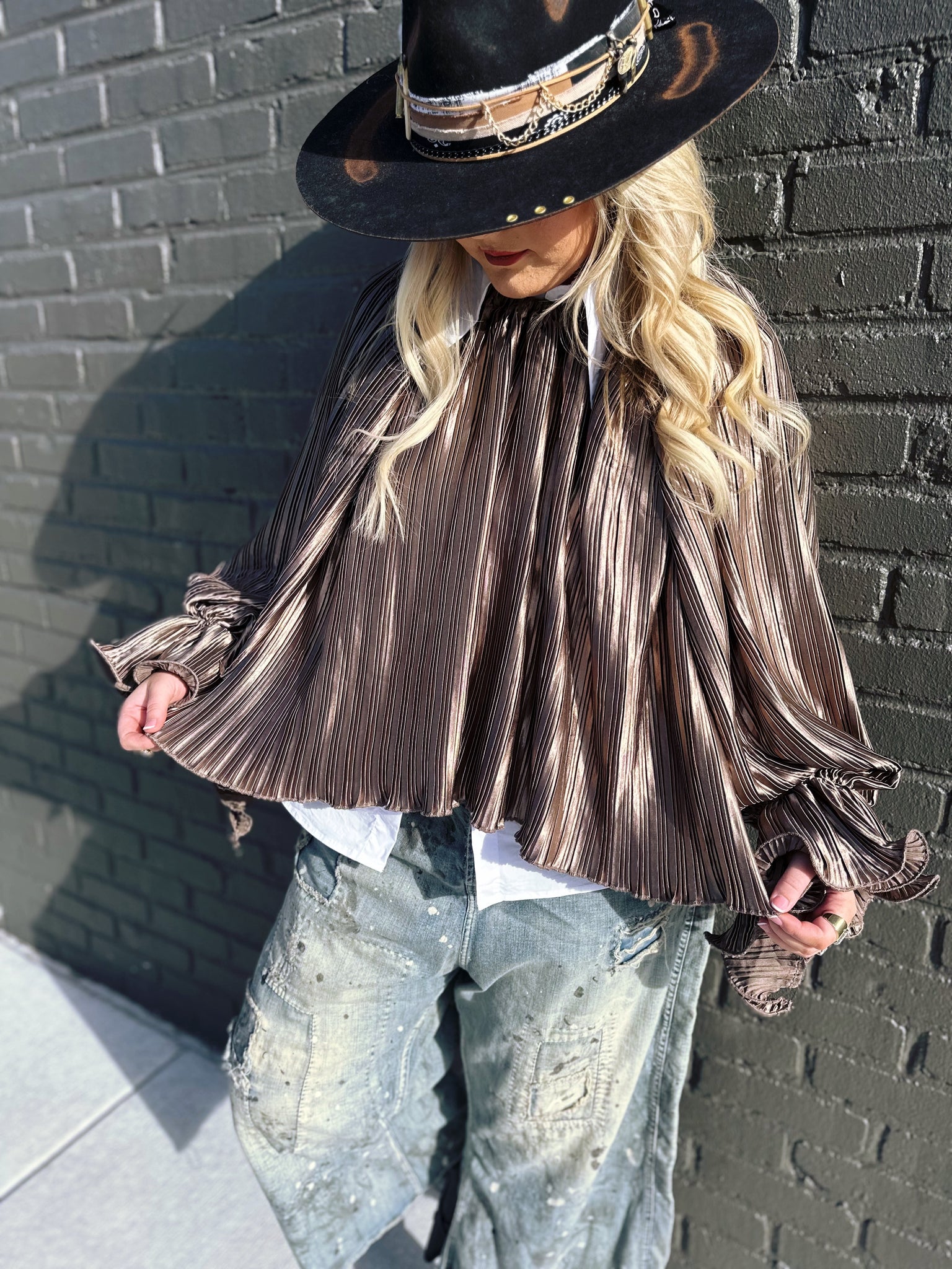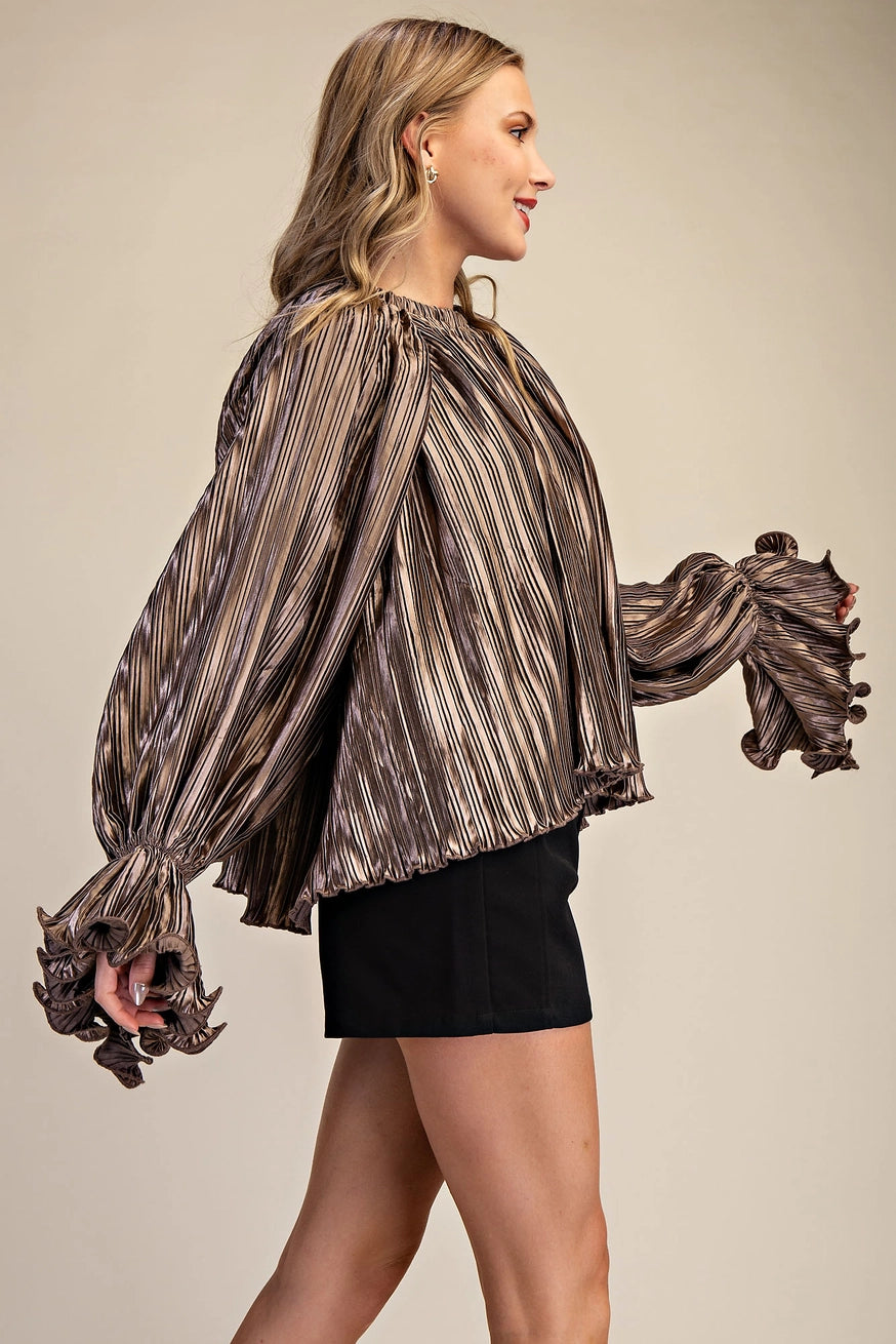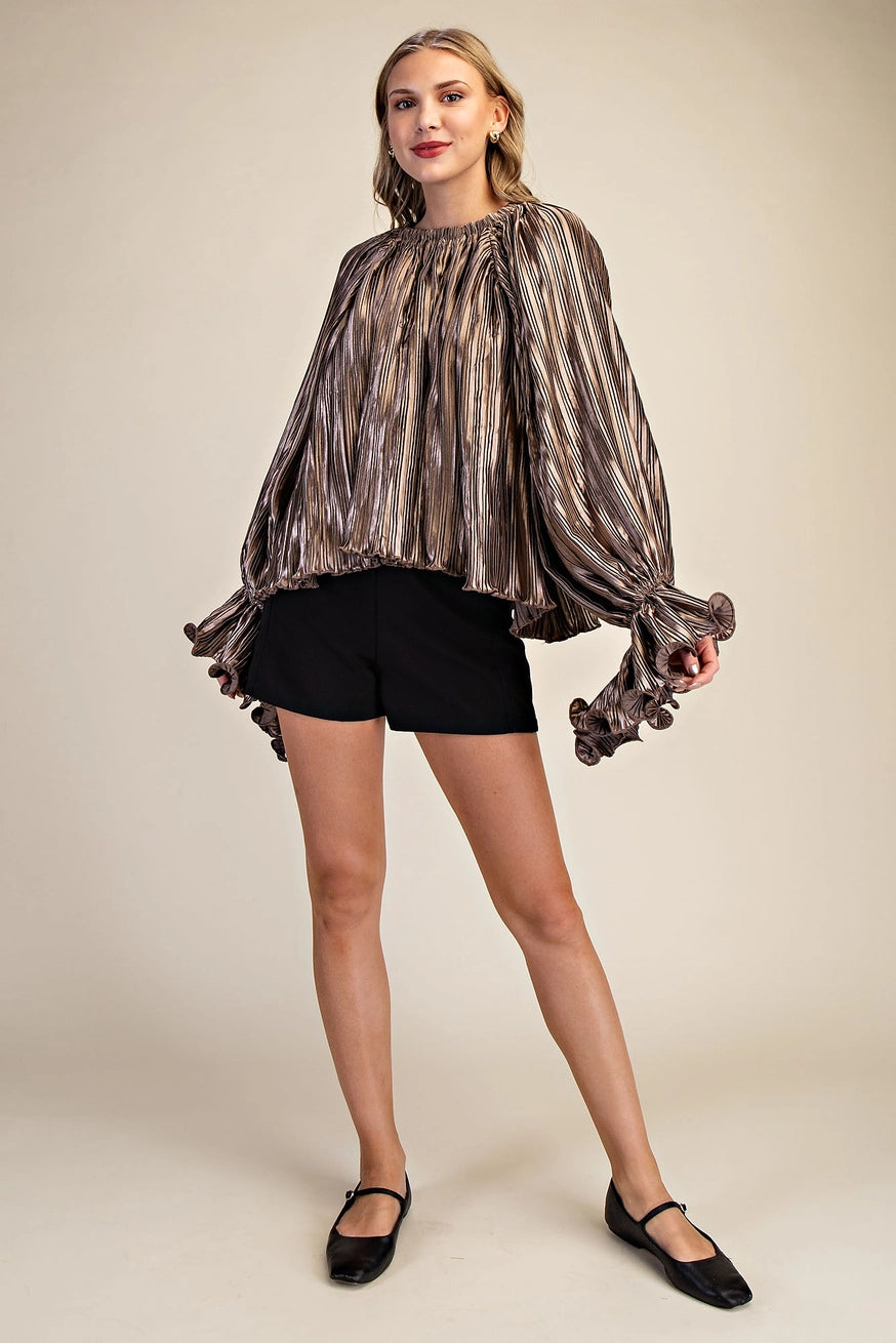 Nick of Time Top in Bronze is the statement piece your wardrobe's been waiting for. This playful pleated ruffle top features an elastic neckline for effortless comfort and charming ruffle sleeves that add movement and dimension. The angled cut creates a flattering silhouette that works beautifully for both casual outings and dressed-up occasions. The rich bronze tone is versatile enough to pair with your favorite jeans or layer under jackets. Whether you're rushing to catch the moment or taking your time to shine, this top delivers style that never goes out of fashion.