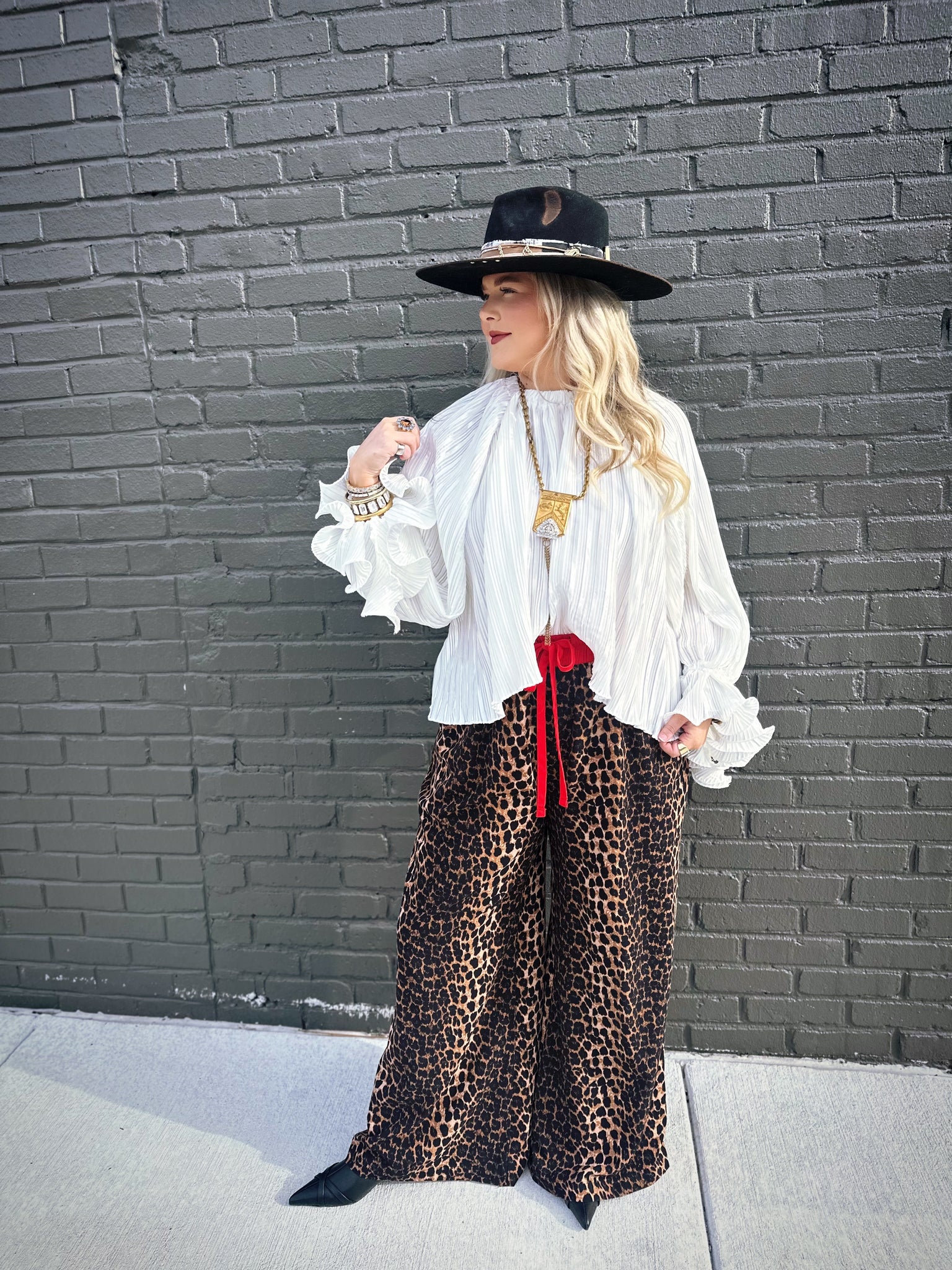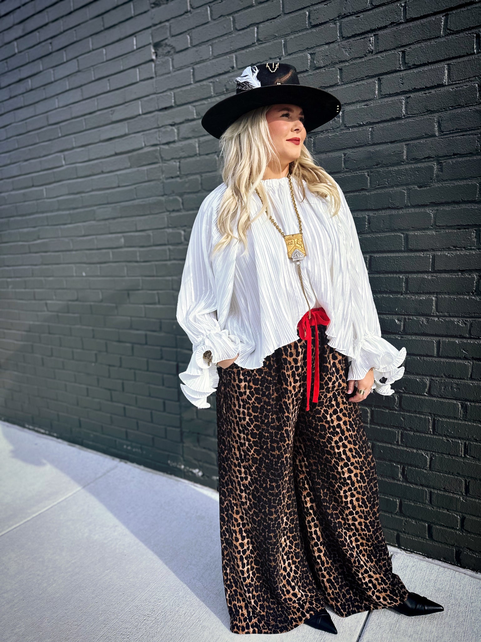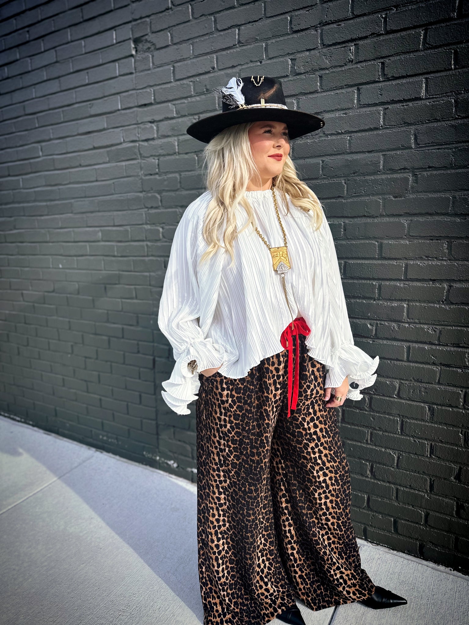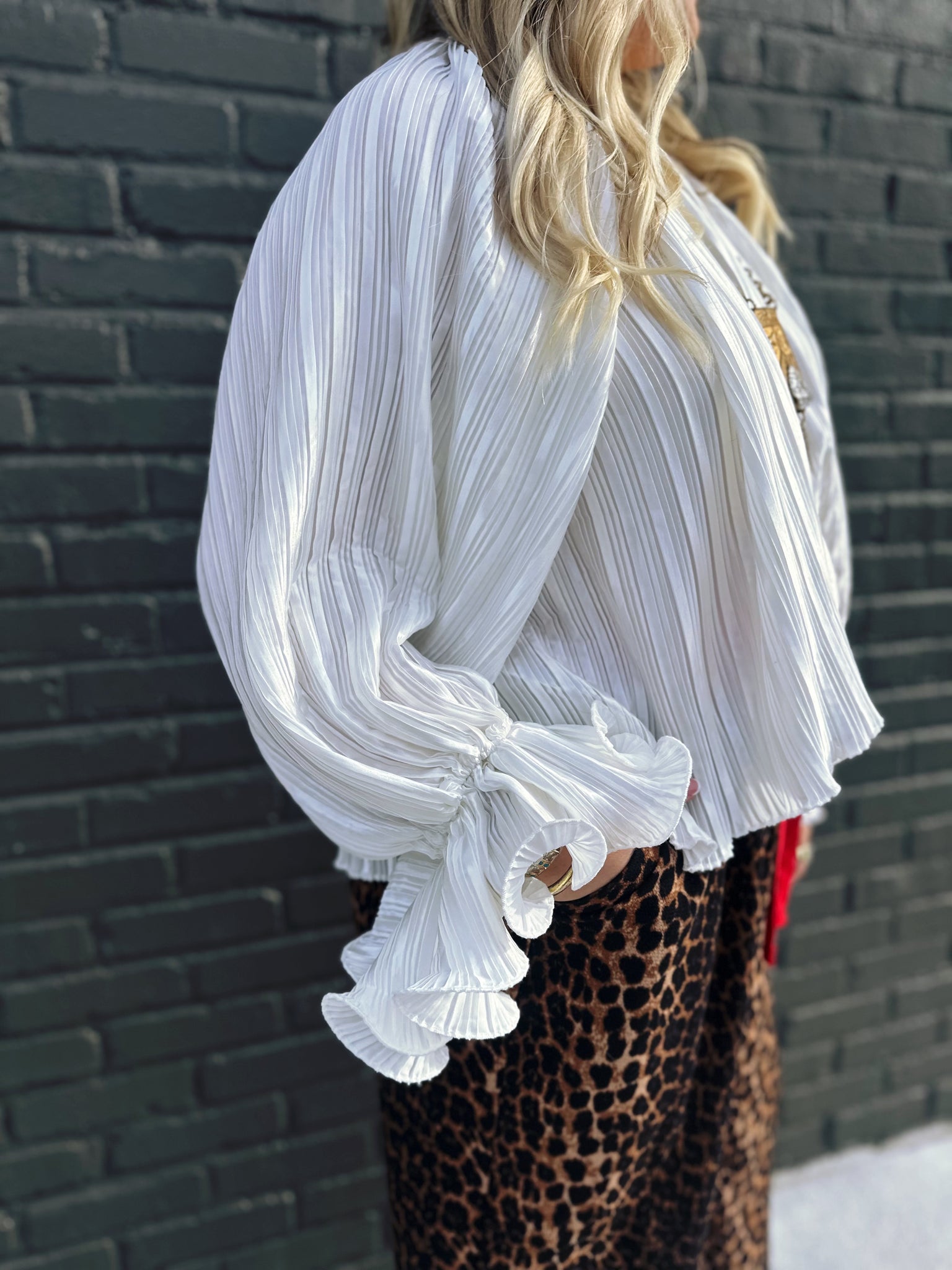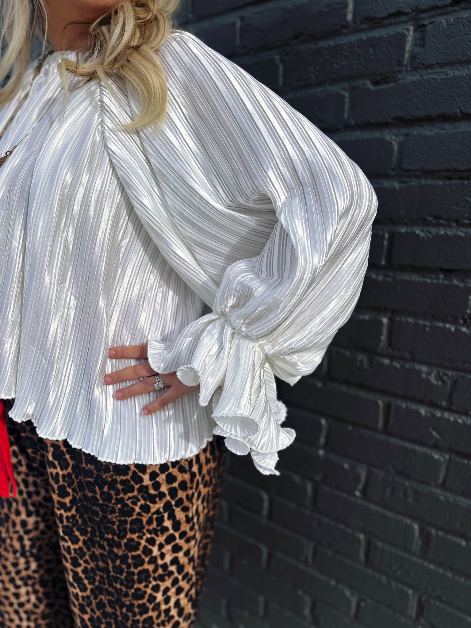 The Nick of Time Top in Ivory is your answer to effortless elegance with a dash of whimsy. This charming piece features an accordion-style design that adds wonderful texture and movement, paired with romantic balloon sleeves that make a statement without trying too hard. The delicate ruffle detailing at the wrist brings a playful finishing touch that catches the light beautifully. Crafted in a lustrous ivory fabric with a subtle sheen, this top transitions seamlessly from casual daytime wear to evening occasions. Perfect for anyone who appreciates vintage-inspired details with a modern twist.