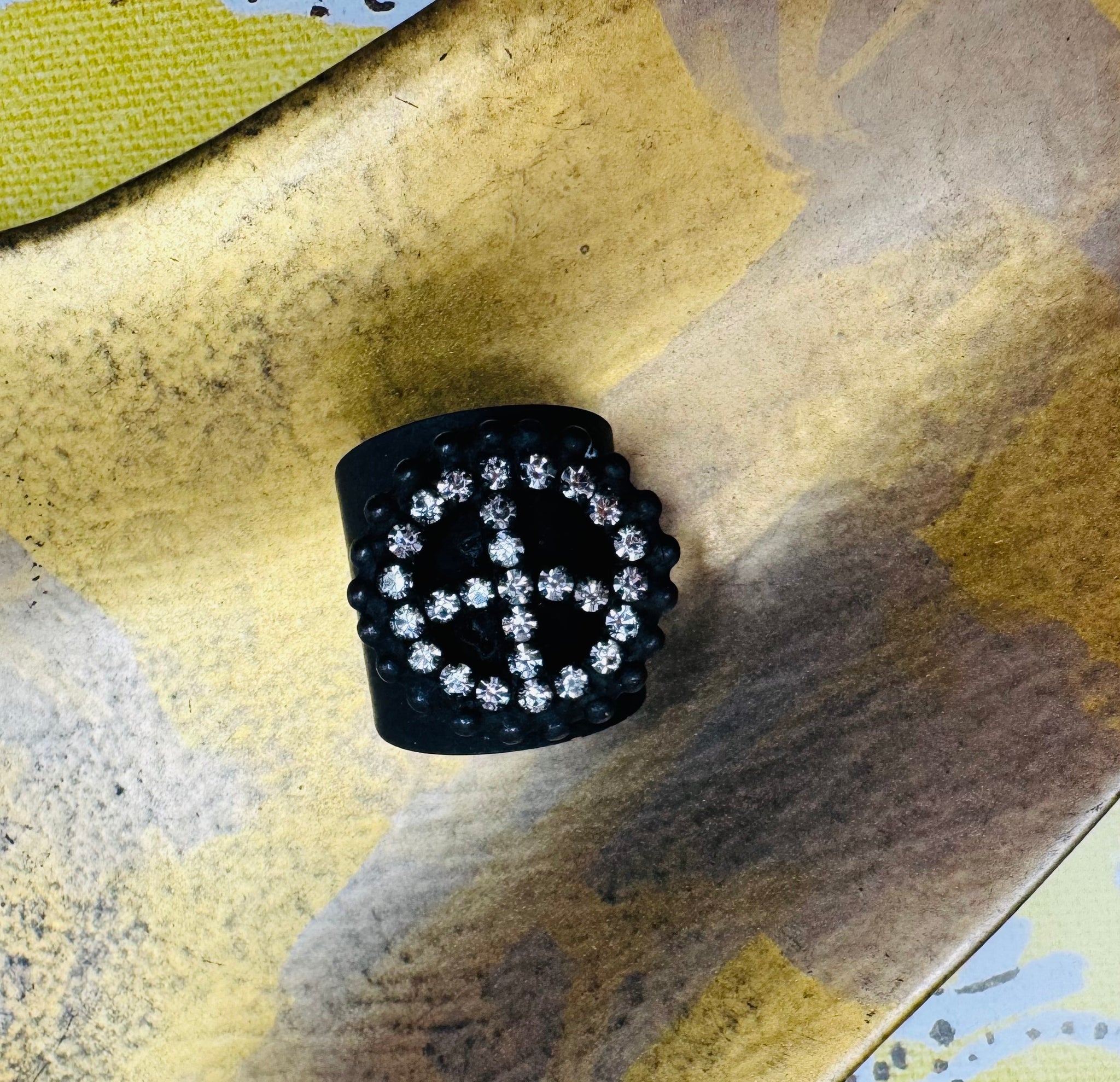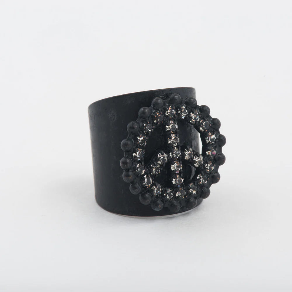 Add a dash of sparkle and a pinch of peace to your look with the Peace Out Ring in Smutt! This adjustable ring is crafted from sturdy brass and features dazzling crystals that catch the light with every gesture. Its antique gold plating lends a vintage vibe, making it both charming and stylish. Handmade in Canada, this unique ring is perfect for spreading good vibes and turning heads wherever you go. Whether you're giving a casual peace sign or simply accessorizing your outfit, this ring says it all with playful, glamorous flair. Say "Peace out!" in style!