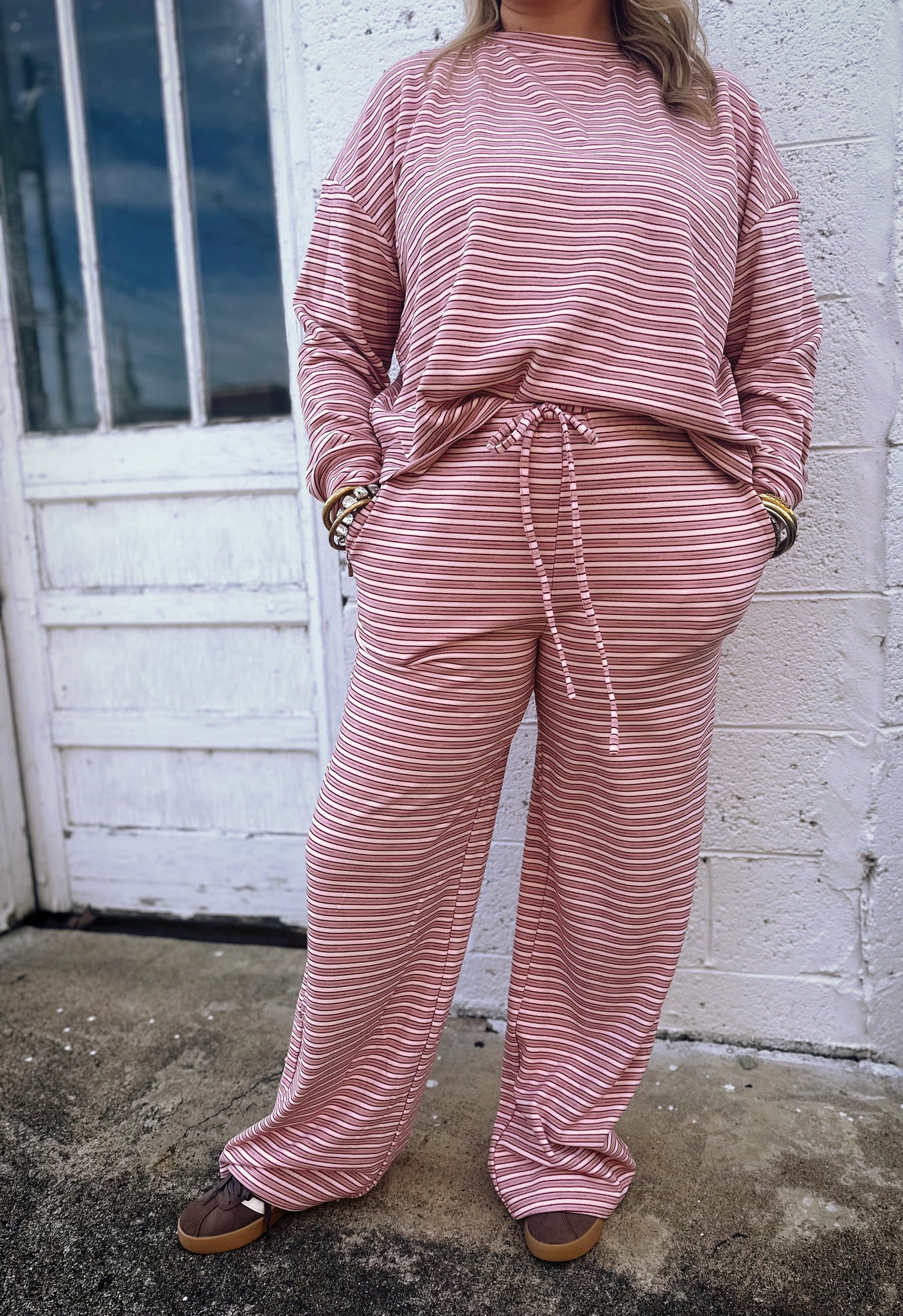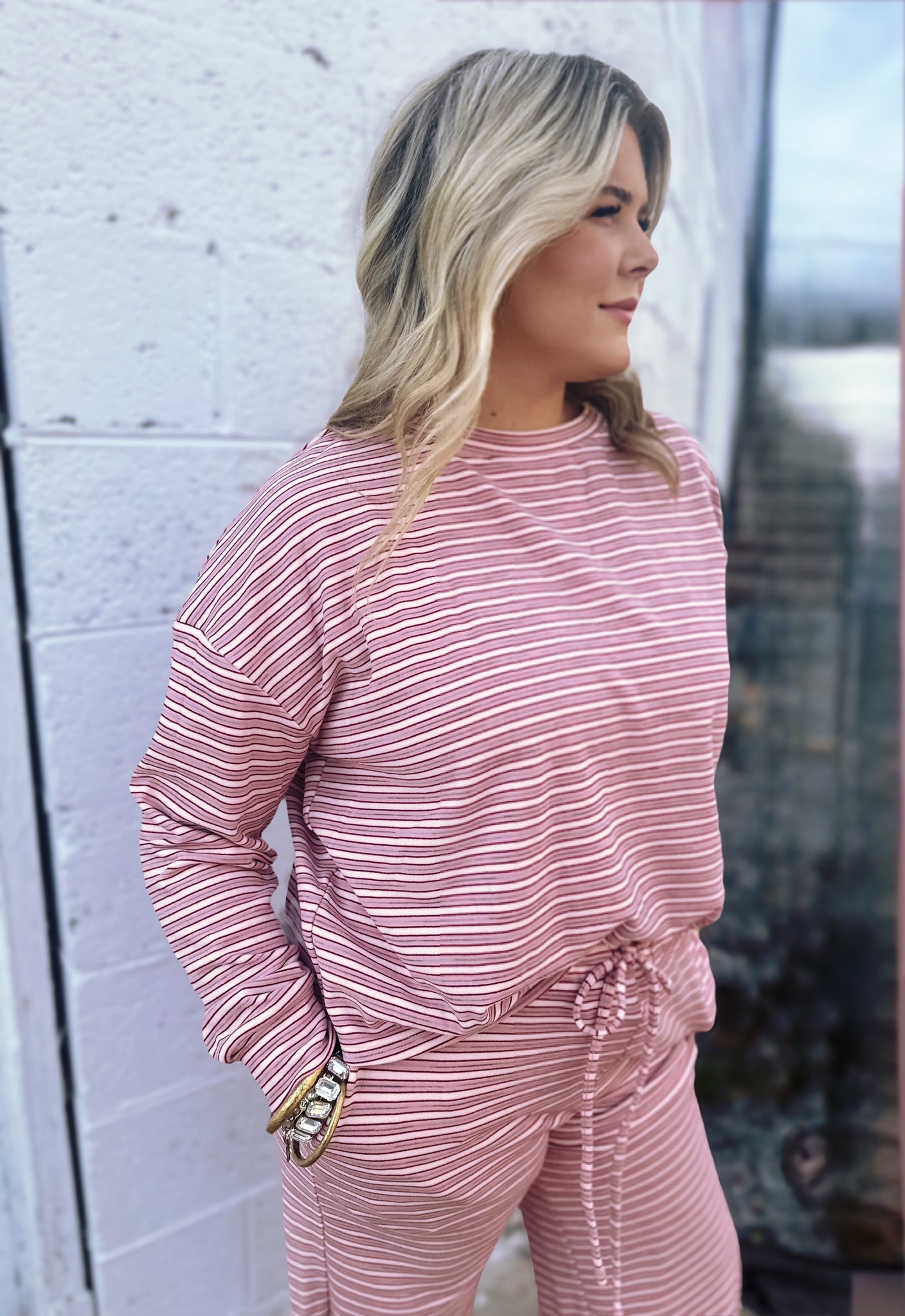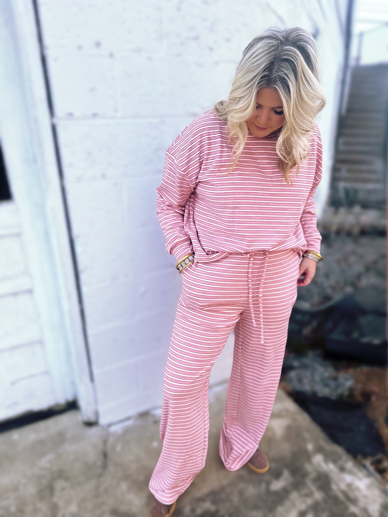 Get cozy in style with this delightful Peppermint Striped Set! Featuring bold red, pink, and white stripes, this two-piece lounge ensemble is perfect for lazy days at home or casual hangouts. The soft, comfortable top pairs beautifully with matching striped pants that feature an elastic waistband and adjustable drawstring for the perfect fit every time. Whether you're relaxing on the couch, running errands, or just want to feel put-together while staying comfy, this playful set delivers both style and comfort. The coordinated design means you're ready to go straight out of the drawer—no mixing and matching required!