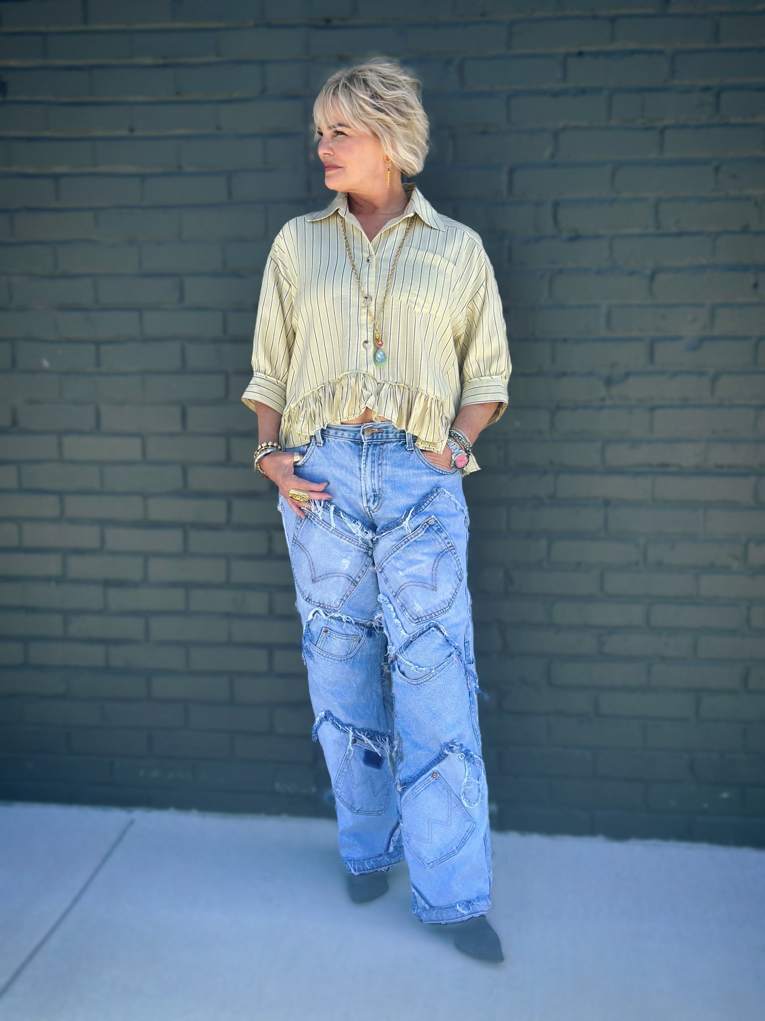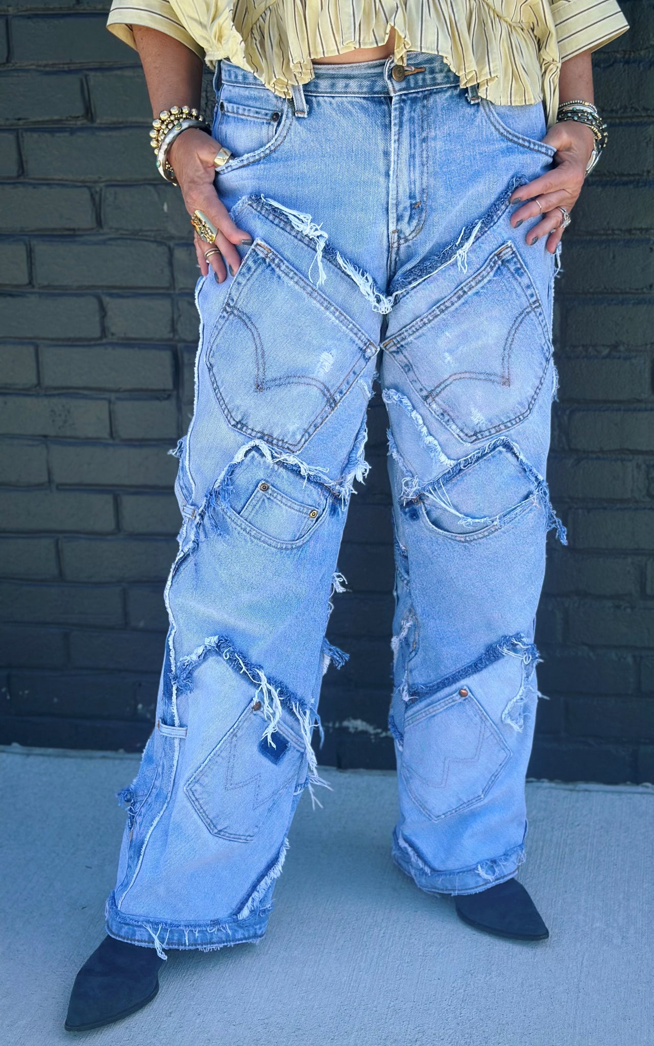 Pocket of Dreams Jeans are where sustainability meets style in the most delightfully unexpected way. Each pair is a one-of-a-kind masterpiece, lovingly reconstructed from an eclectic mix of vintage and contemporary denim pieces. You'll discover a beautiful patchwork of different washes and textures—no two pairs are ever alike, making your jeans as unique as you are. Perfect for anyone who refuses to blend in, these playful pieces celebrate individuality while giving quality denim a second life. Slip into something special and wear your own wearable art.