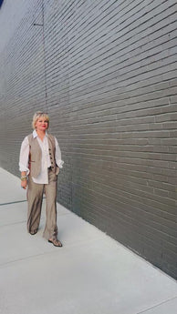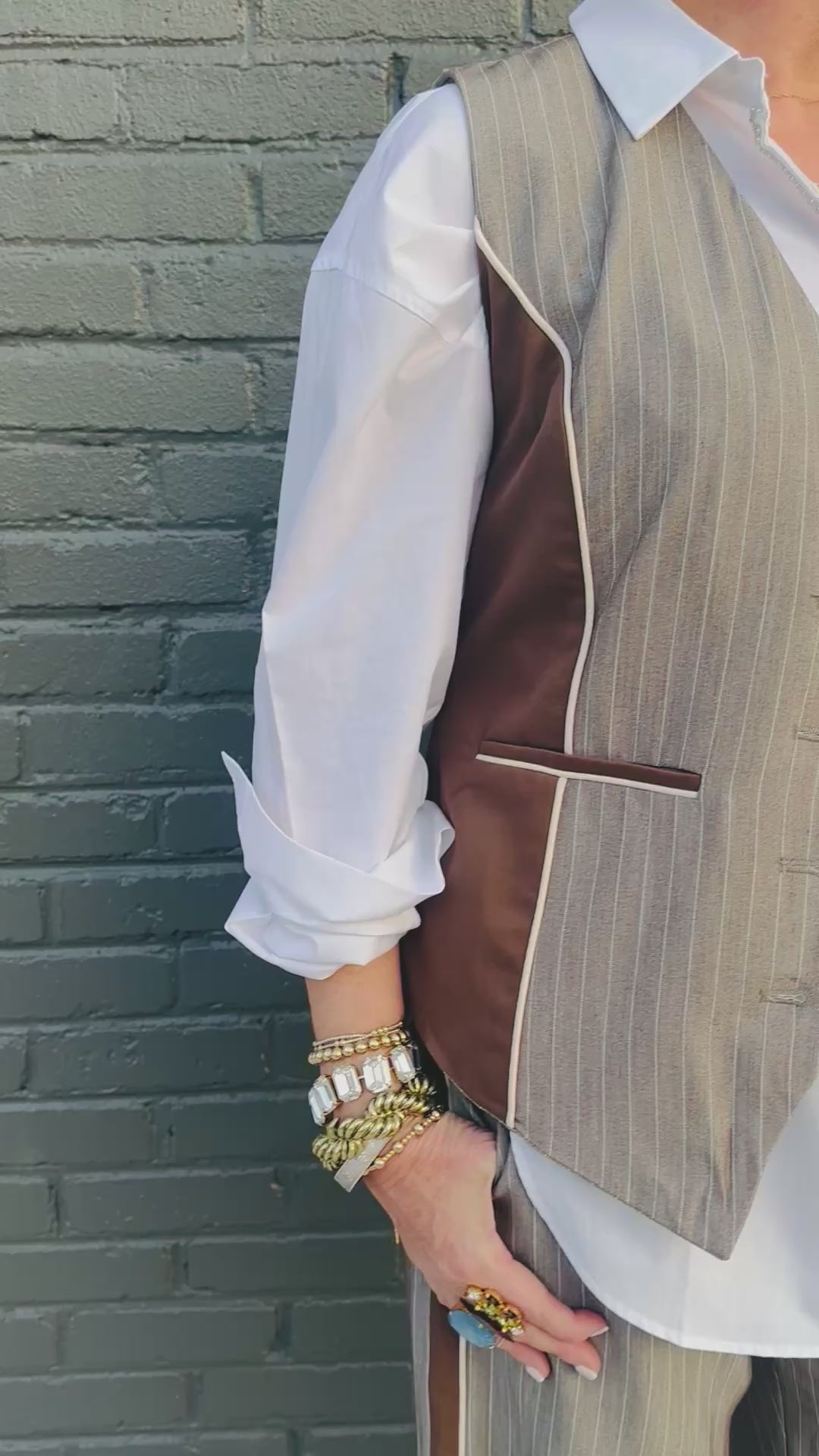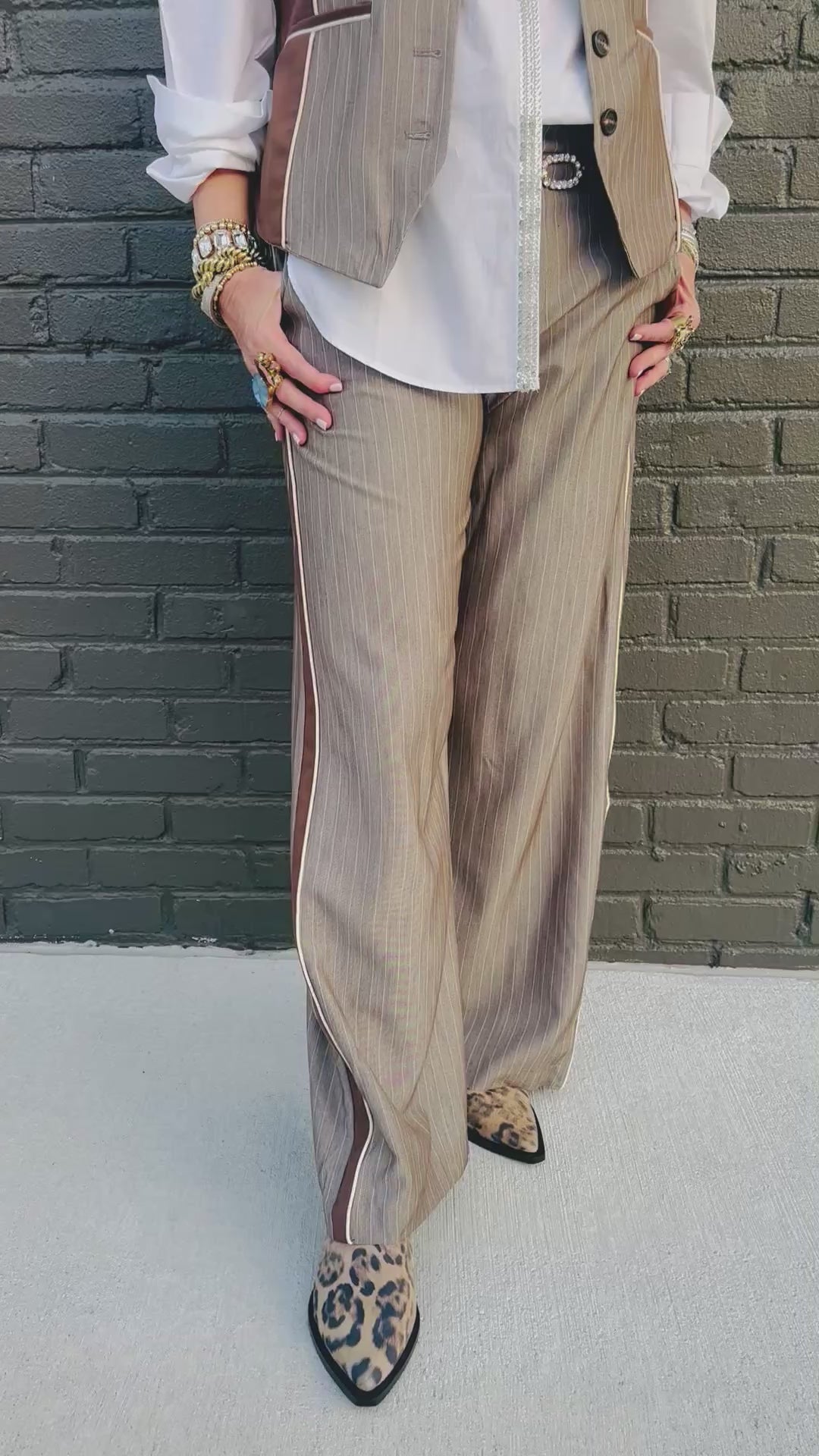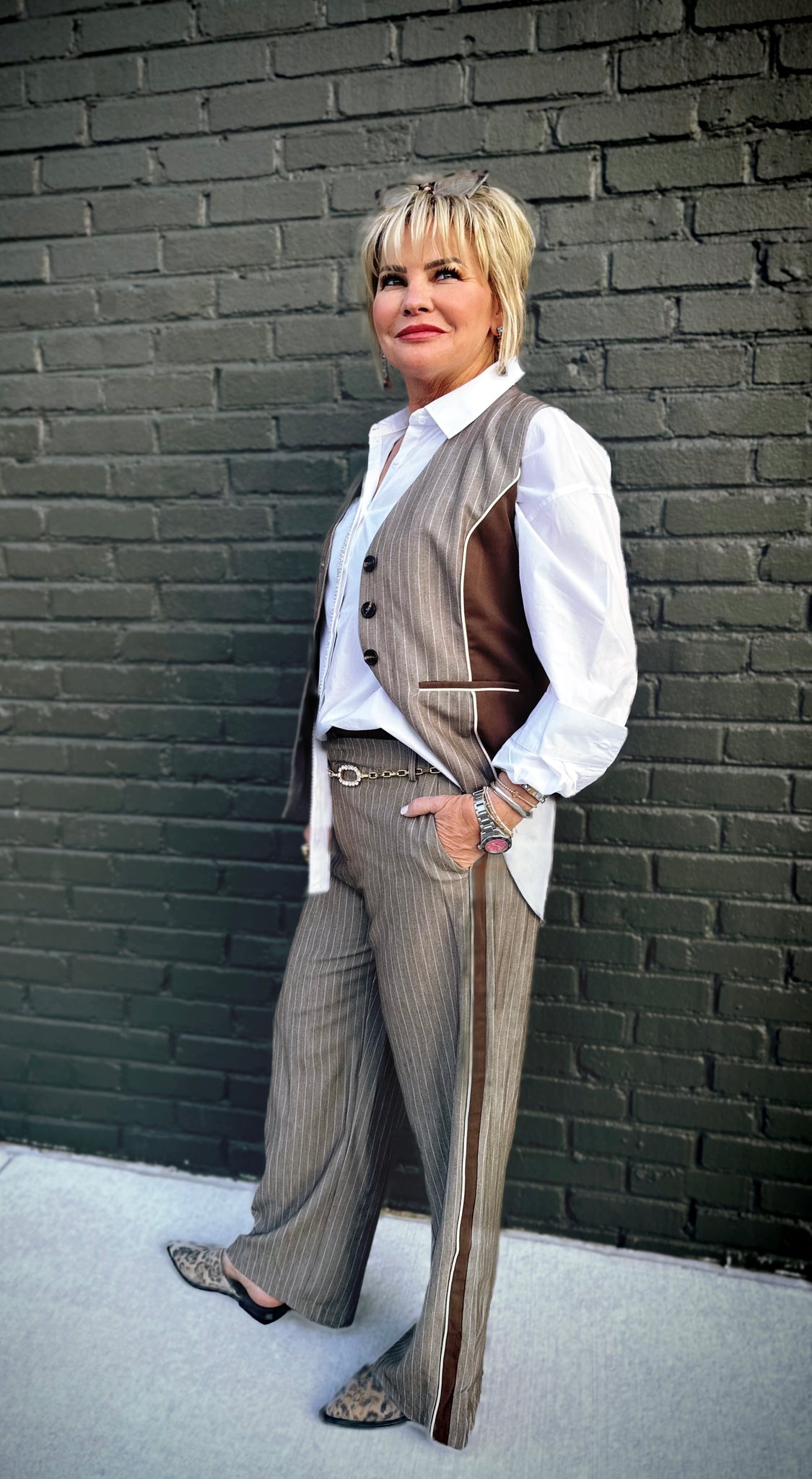 Introducing the Polly Pinstripe Pantsuit—where sharp tailoring meets fun flair! This dynamic two-piece set combines a sleek mixed-media piping detail vest top with matching trousers, both crafted from stretch pinstripe suiting fabric for all-day comfort and movement. The vest top features a chic V-neck, button-down front closure, and a back adjustment cinch strap for a customized fit. A contrast color solid panel and playful piping details add visual interest, while the fully lined interior keeps everything polished. The coordinating trousers boast a wide straight leg silhouette with a side contrast stripe and piping detail that ties the look together beautifully. Practical touches include double elastic waistband, belt loops, side pockets, and welt back pockets—because style should never sacrifice functionality. Whether you're heading to the office, a special event, or anywhere in between, the Polly Pantsuit delivers sophisticated charm with a wink of personality. Mix and match with other pieces or wear as the complete set for an effortlessly put-together ensemble.