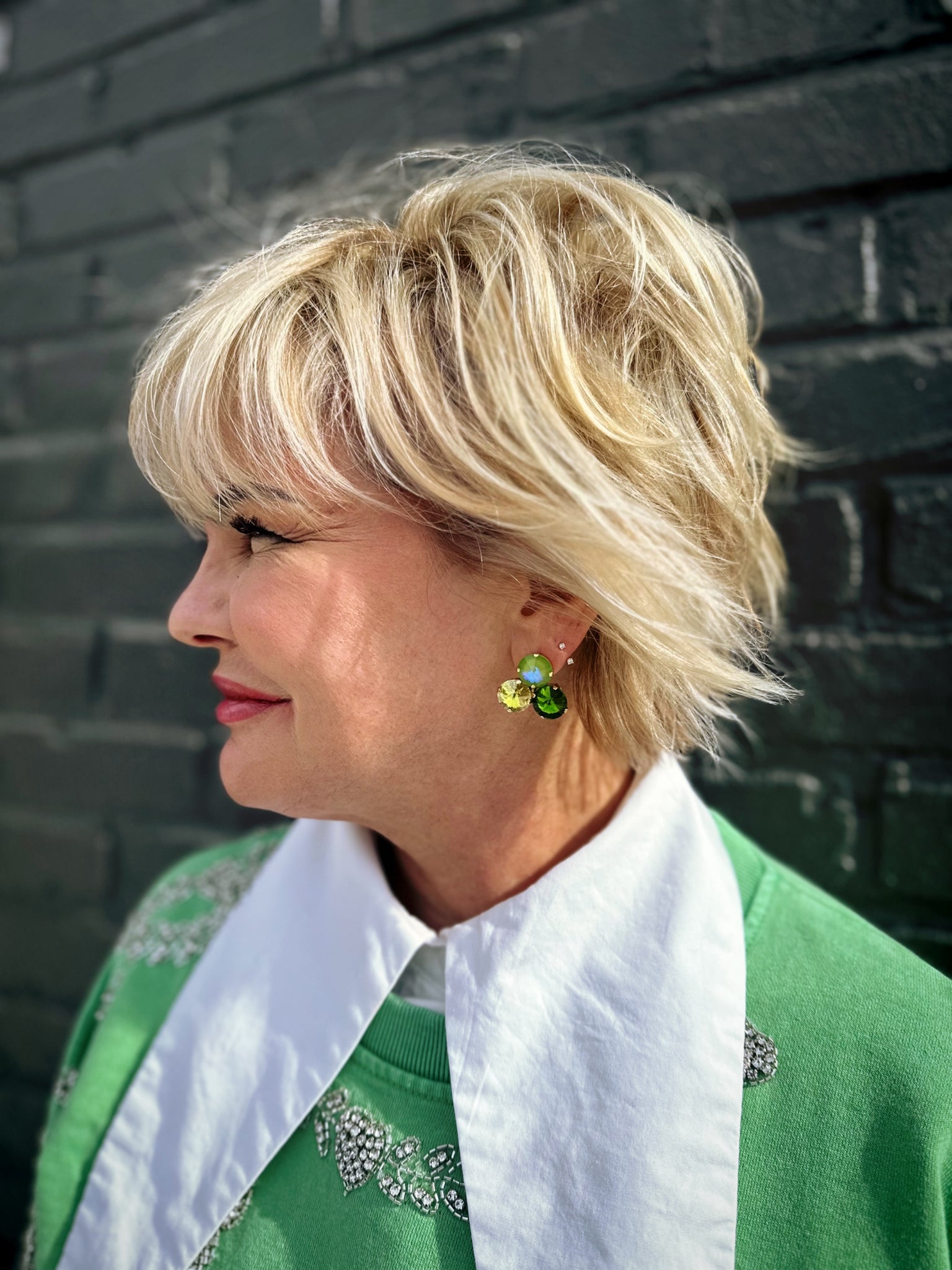 Add a pop of playful charm to any outfit with the Reya Earrings in Green Mix! These dazzling 1-inch studs sparkle brilliantly thanks to carefully selected high-quality crystals set on an antique gold-plated brass base. Designed for comfort and durability, the surgical steel post keeps your ears happy and secure all day, whether you’re dancing the night away or keeping it casual. Handpicked in a custom green mix exclusive to Beyond 436, these earrings bring a fresh, vibrant twist to your jewelry collection. Get ready to shine bright and turn heads wherever you go!