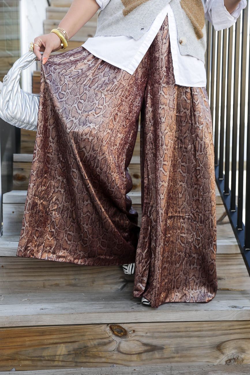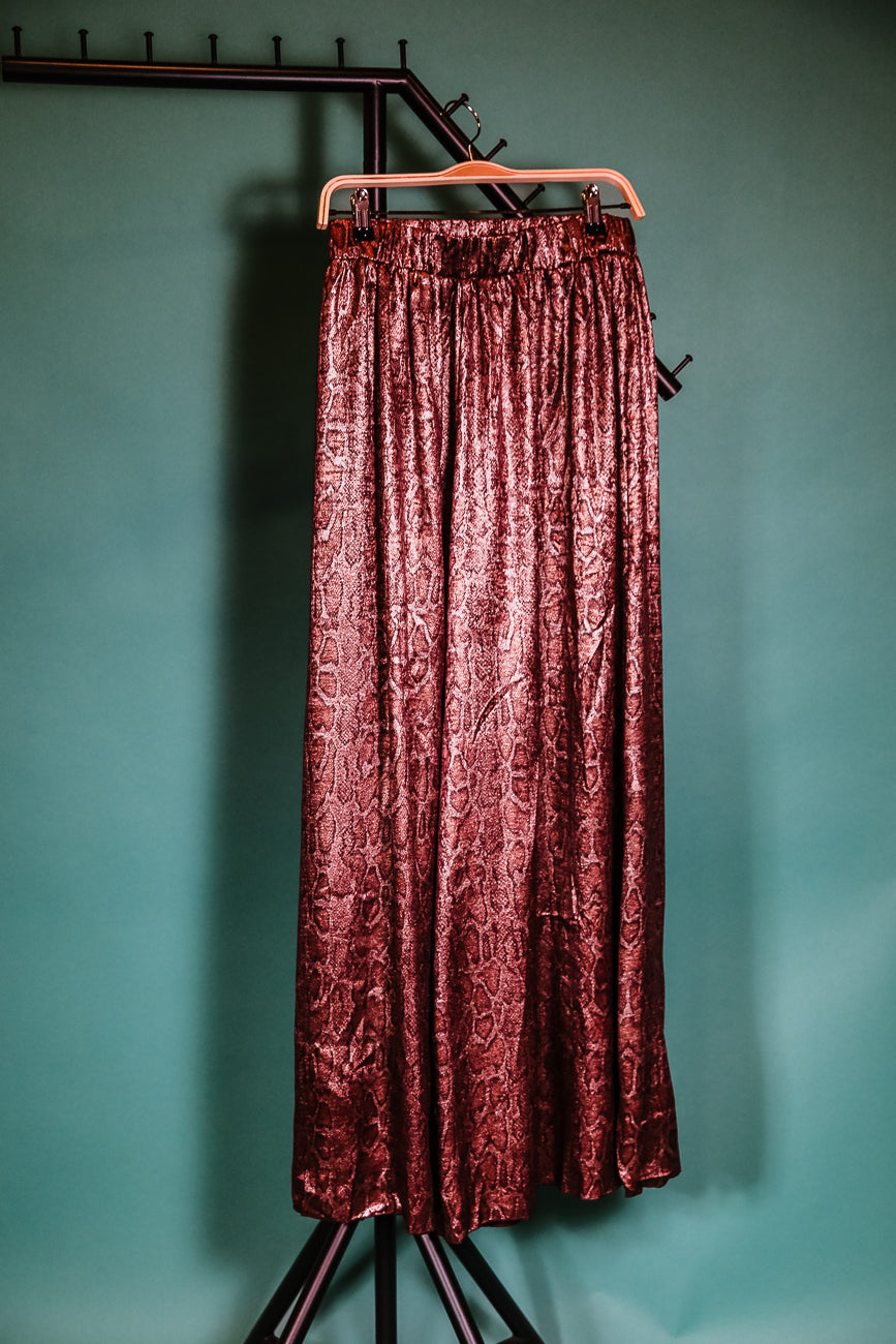Embrace bold style and ultimate comfort with our Rye Python Pants in Burgundy. Featuring a striking python pattern that adds a wild twist to your wardrobe, these pants combine fashion with ease thanks to a stretchy elastic waistband. Crafted from 100% polyester, they offer a smooth, flowy feel that moves with you all day long. The very wide leg design creates a dramatic, playful silhouette perfect for turning heads whether you're out with friends or simply lounging in style. Elevate your look effortlessly with these statement pants that bring a touch of adventurous charm to any outfit.