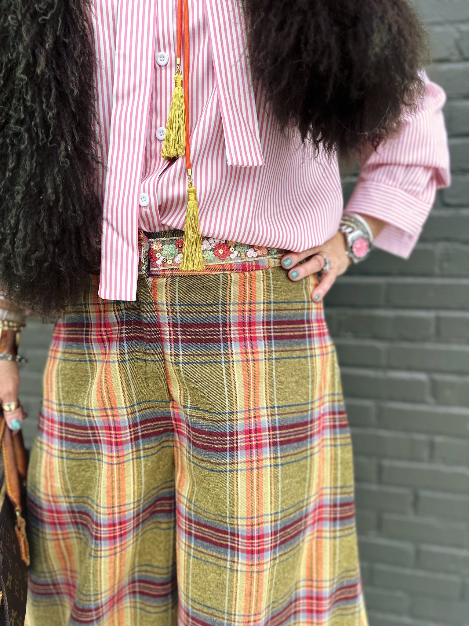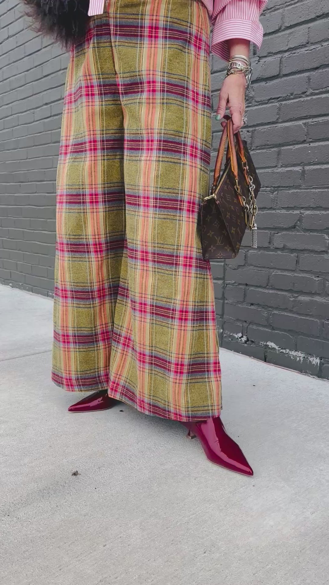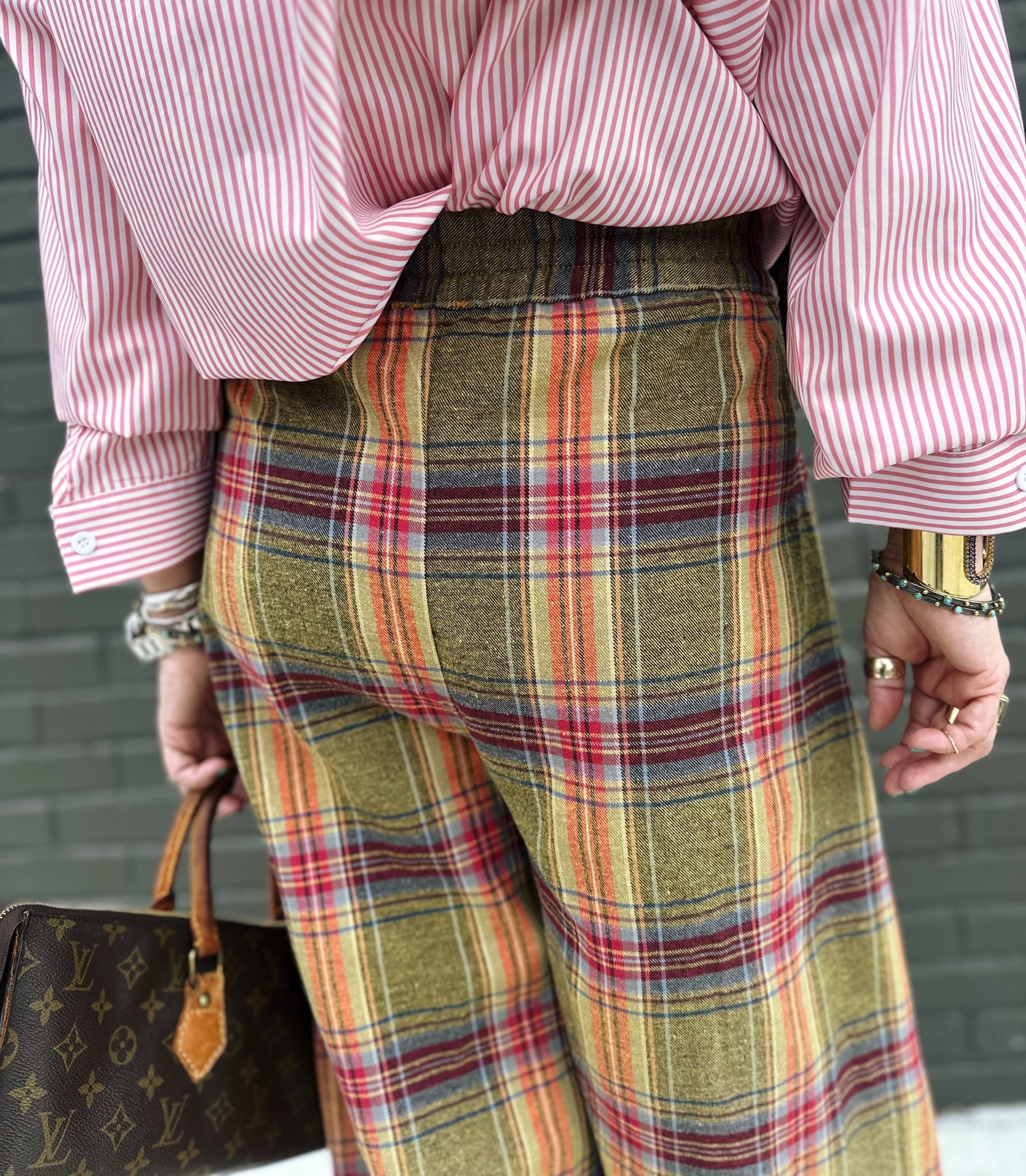Step into style and comfort with our Seasons Pants, featuring a charming olive plaid combo that effortlessly blends classic and contemporary vibes. These zip flare pants are detailed with an embroidered trim on the front waistband, adding a playful touch to your outfit. Crafted from a soft, durable blend of 70% cotton and 30% polyester, they promise all-day comfort with just the right amount of stretch. Perfect for a casual day out or turning heads at your next event, these pants keep your look fresh and fun. For best care, dry clean only to maintain their vibrant color and crisp fit.