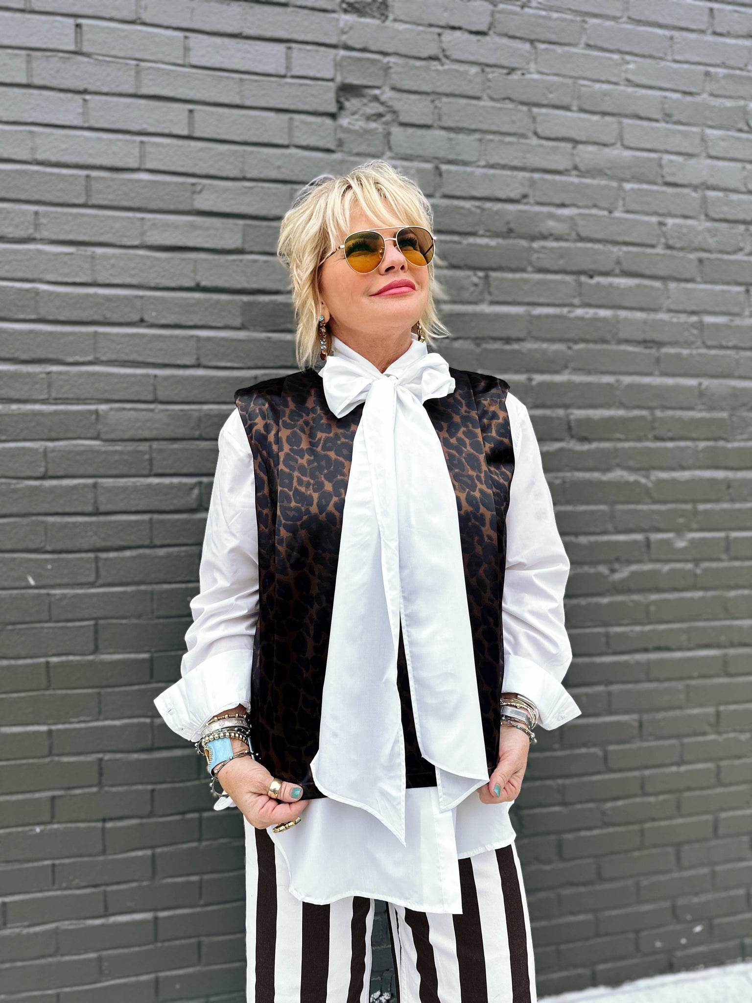 Bring some wild flair to your wardrobe with the Selene Sleeveless Top. This playful leopard print holiday tank features a comfortable lining and structured shoulder pads that add a touch of bold sophistication. Crafted from a blend of 95% polyester and 5% spandex, it offers just the right amount of stretch for effortless movement and a flattering fit. The 100% polyester lining ensures a smooth feel against your skin, making it perfect for festive occasions or a fun night out. Stand out, shine, and let your style roar with the Selene Sleeveless Top!