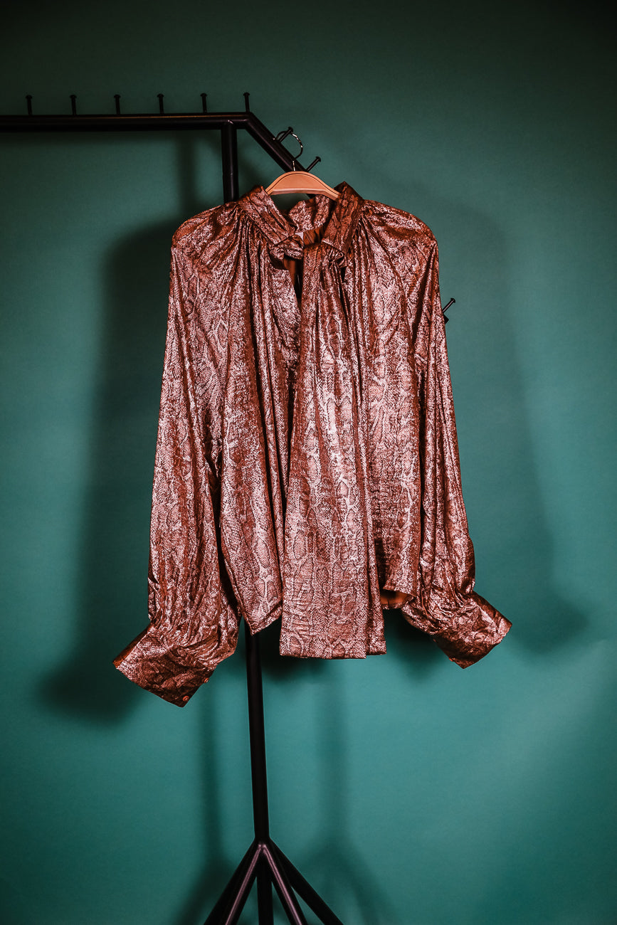 Turn heads in the Sharpe Python Top, where fierce meets fun. This playful blouse features a chic tie neck that adds a flirty bow detail, perfectly paired with a metallic python print for an edgy shine. Crafted from 100% polyester, it offers a flowy A-line silhouette that flatters every curve. Balloon sleeves add a whimsical touch, while the button-up front lets you customize your look from casual to classy. Whether dressing up for a night out or elevating your everyday style, this top is your new go-to for effortless confidence and flair.