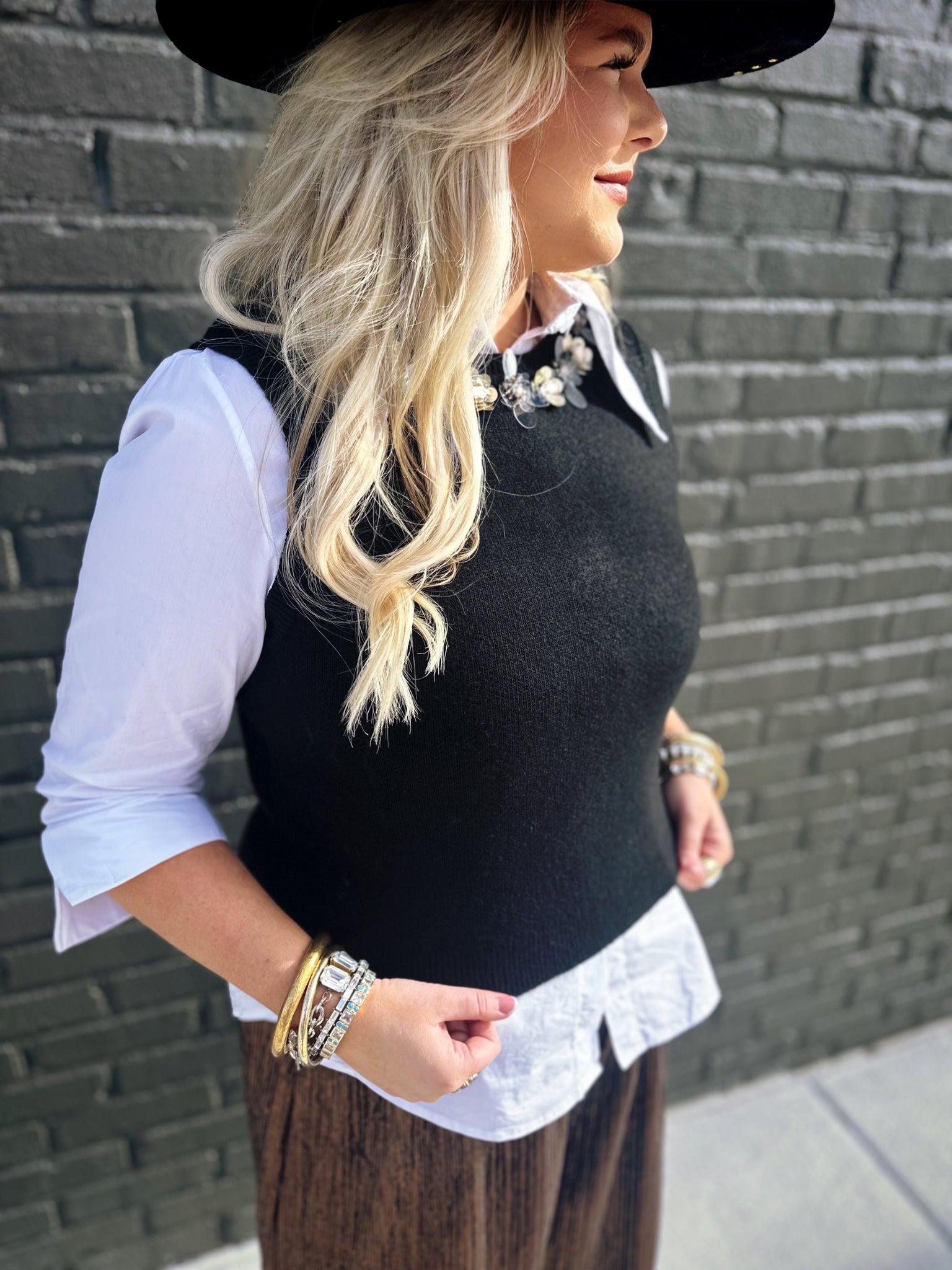 Shine bright with our Knit Jewel Trim Sleeveless Top. Made from a soft, breathable knit, this piece is designed for all-day wear while keeping you effortlessly chic. The jewel-embellished trim adds a hint of sparkle, turning a timeless round neckline into a statement detail that catches the light beautifully. Its sleeveless cut makes it a versatile layering piece—pair it with tailored trousers and a blazer for a refined office look, or style it with your favorite denim for a more casual yet elevated vibe.