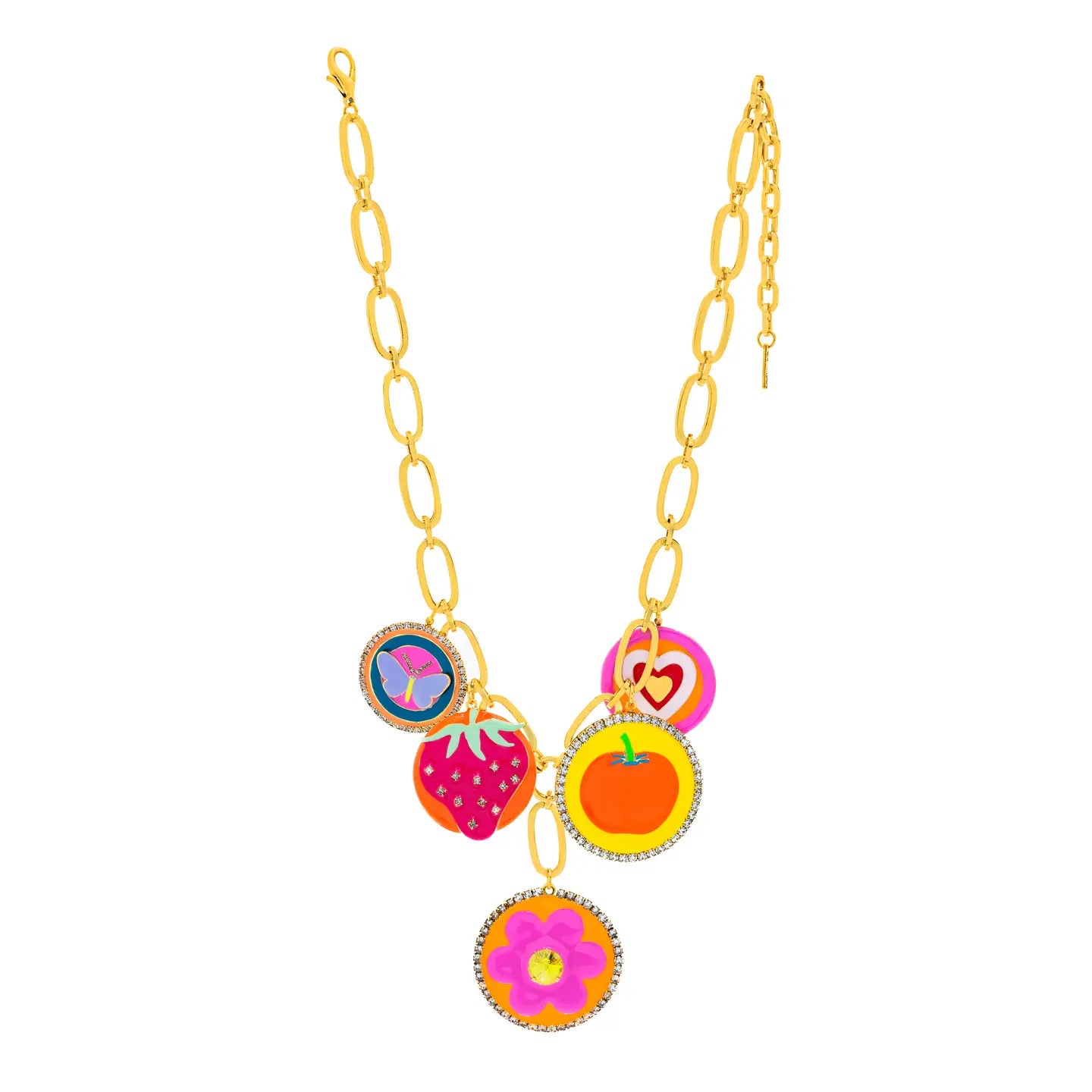Add a touch of whimsy to your outfit with the Starburst Necklace. Made with antique gold plating and high quality crystals, this brass base metal necklace is sure to make a statement. Hand painted with enamel, making it a unique addition to any jewelry collection. 18" in length, with 2" drop and 4" extension. Designed and crafted in Canada.