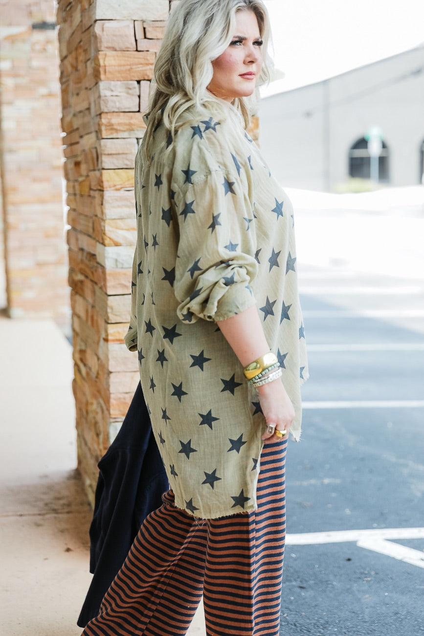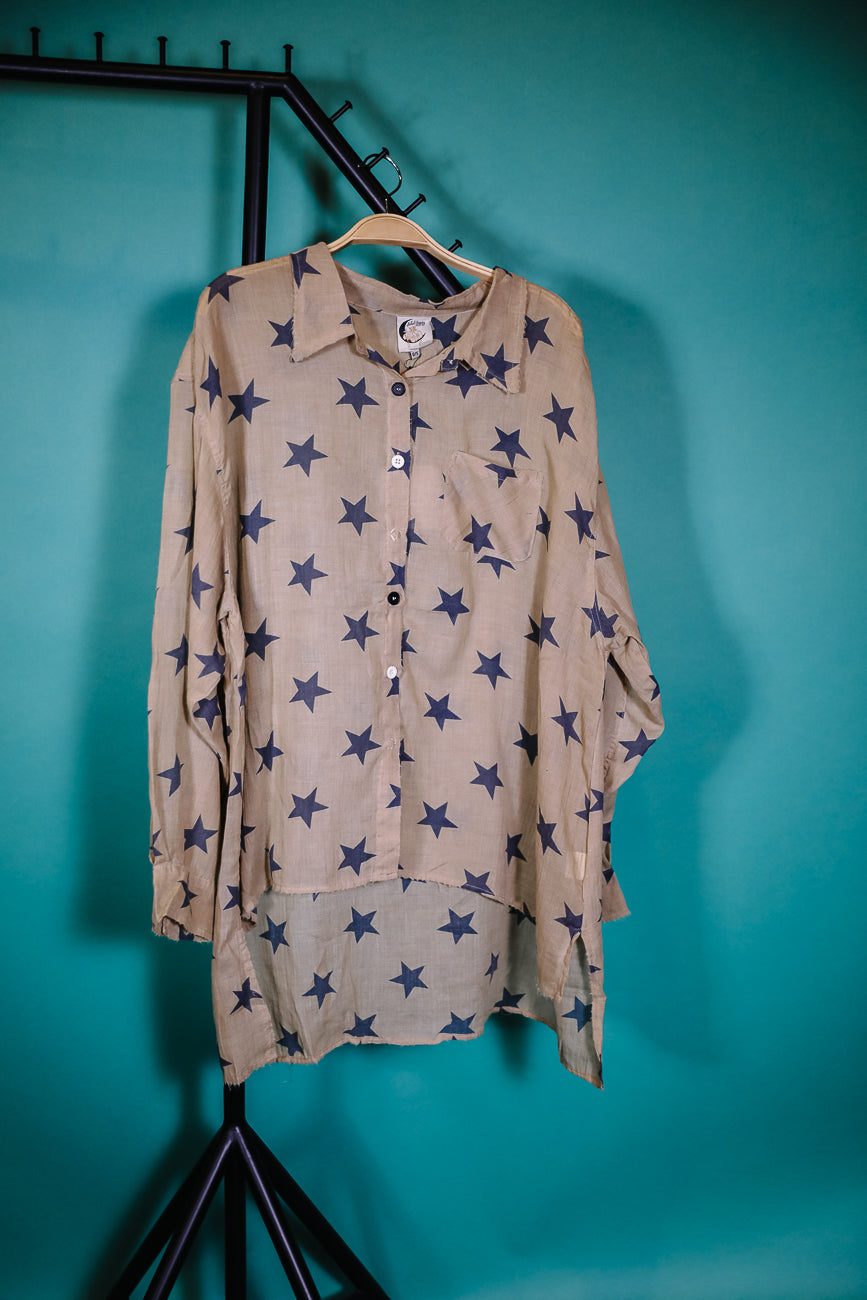 Our fabulous Starburst Top is crafted from 100% pre-shrunk cotton, making it soft, breathable, and effortless to wear. The lightweight fabric and star design add a fun, whimsical touch while keeping you comfortable all day. Navy stars sprinkled throughout bring a bit of charm, complemented by tricolor buttons that add a pop of color and personality. Designed with a hi-lo fit featuring two side slits, it offers a flattering silhouette that's perfect for layering or wearing on its own. With roomy measurements including a 26" bust, 21" shoulder, and 29" length, it’s ready to keep up with your lively style.
