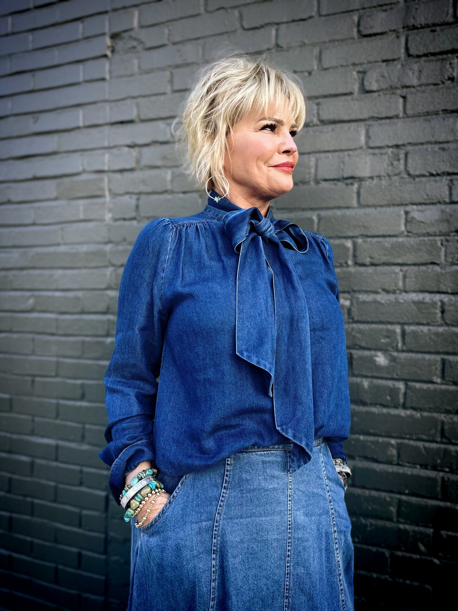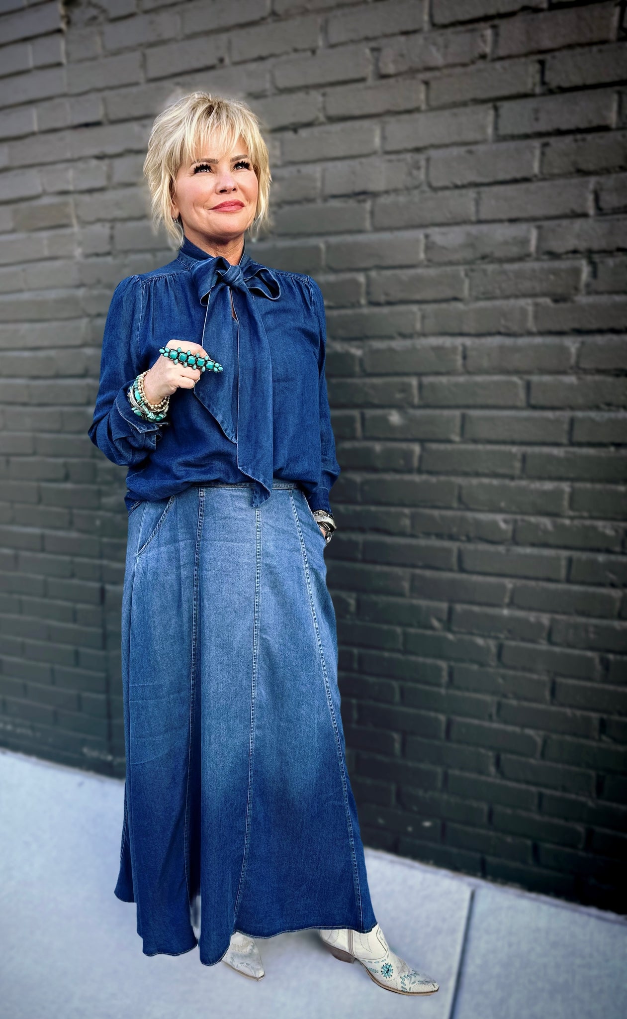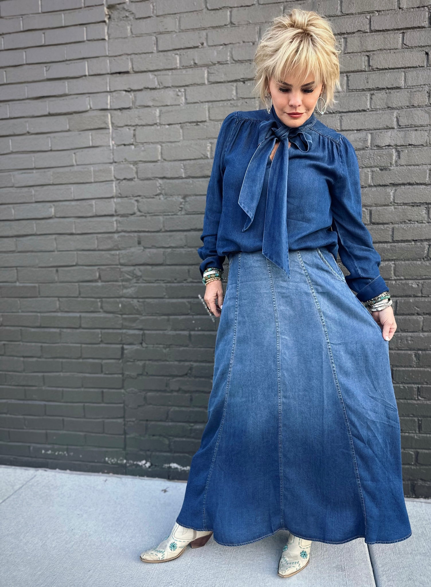 Get ready to turn heads with the Strasa Denim Set—your new go-to combo for effortless style! This playful two-piece features a stunning ombré denim maxi skirt that transitions from rich dark tones to breezy light wash, paired with a flowy, blouse-inspired tie neck top that's equal parts chic and comfortable. The skirt is thoughtfully designed with a convenient side zip, elastic back waistband for the perfect fit, and functional pockets because who doesn't love pockets? The airy top drapes beautifully and ties at the neck for an adjustable, flattering silhouette. Whether you're dressing up for a night out or keeping it casual, this set delivers versatility and personality in one gorgeous package. Mix, match, or wear together—the possibilities are endless!