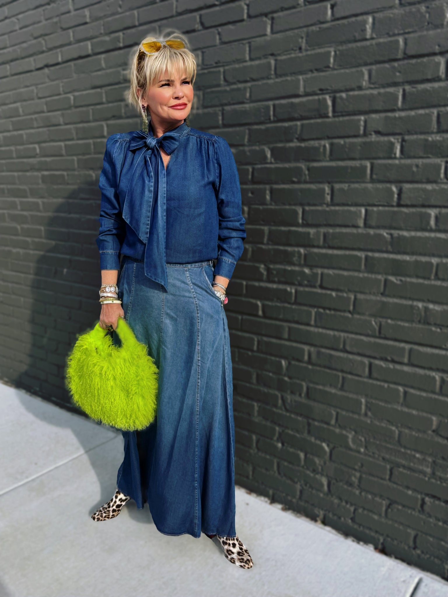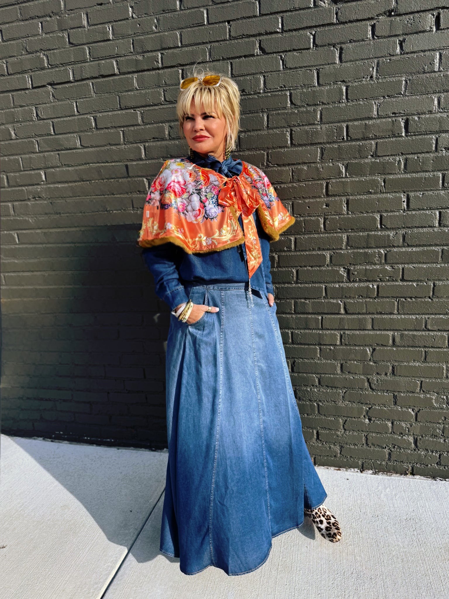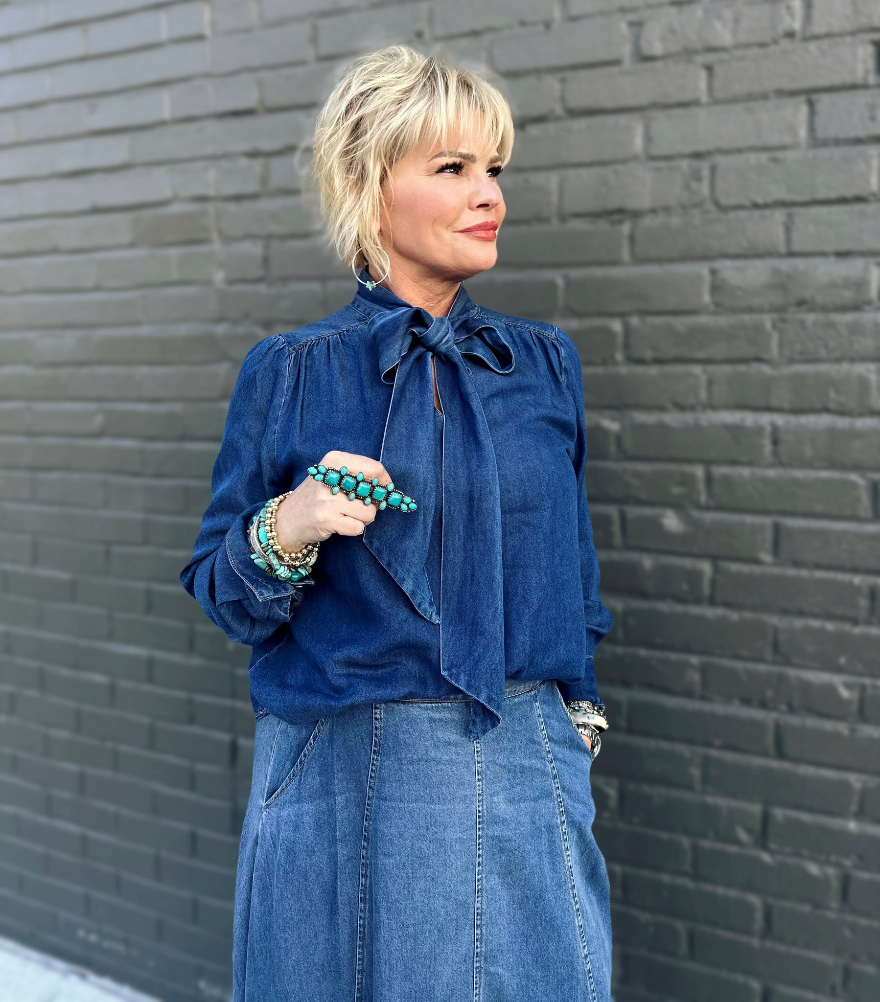 Get ready to turn heads with the Strasa Denim Set—your new go-to combo for effortless style! This playful two-piece features a stunning ombré denim maxi skirt that transitions from rich dark tones to breezy light wash, paired with a flowy, blouse-inspired tie neck top that's equal parts chic and comfortable. The skirt is thoughtfully designed with a convenient side zip, elastic back waistband for the perfect fit, and functional pockets because who doesn't love pockets? The airy top drapes beautifully and ties at the neck for an adjustable, flattering silhouette. Whether you're dressing up for a night out or keeping it casual, this set delivers versatility and personality in one gorgeous package. Mix, match, or wear together—the possibilities are endless!