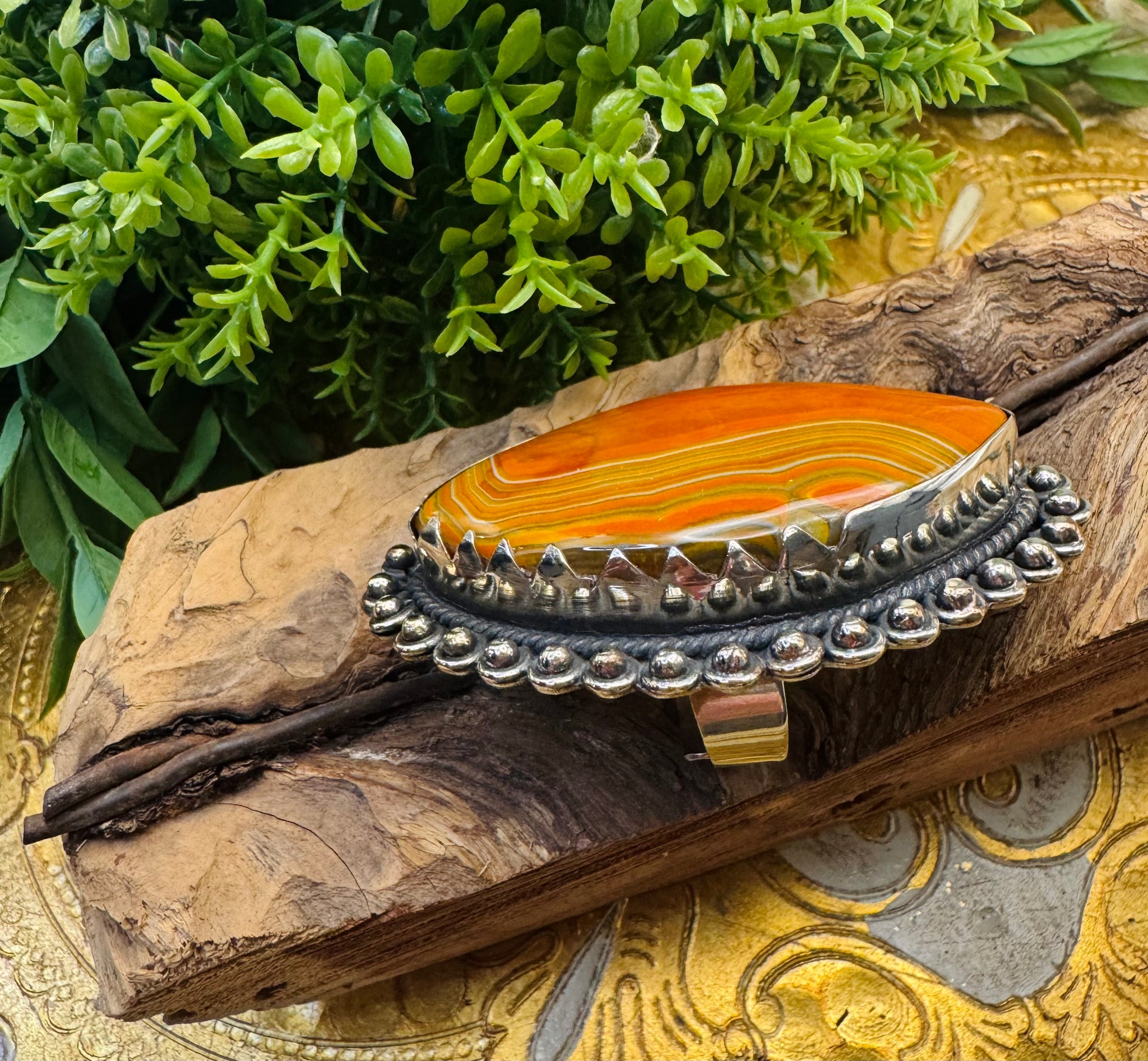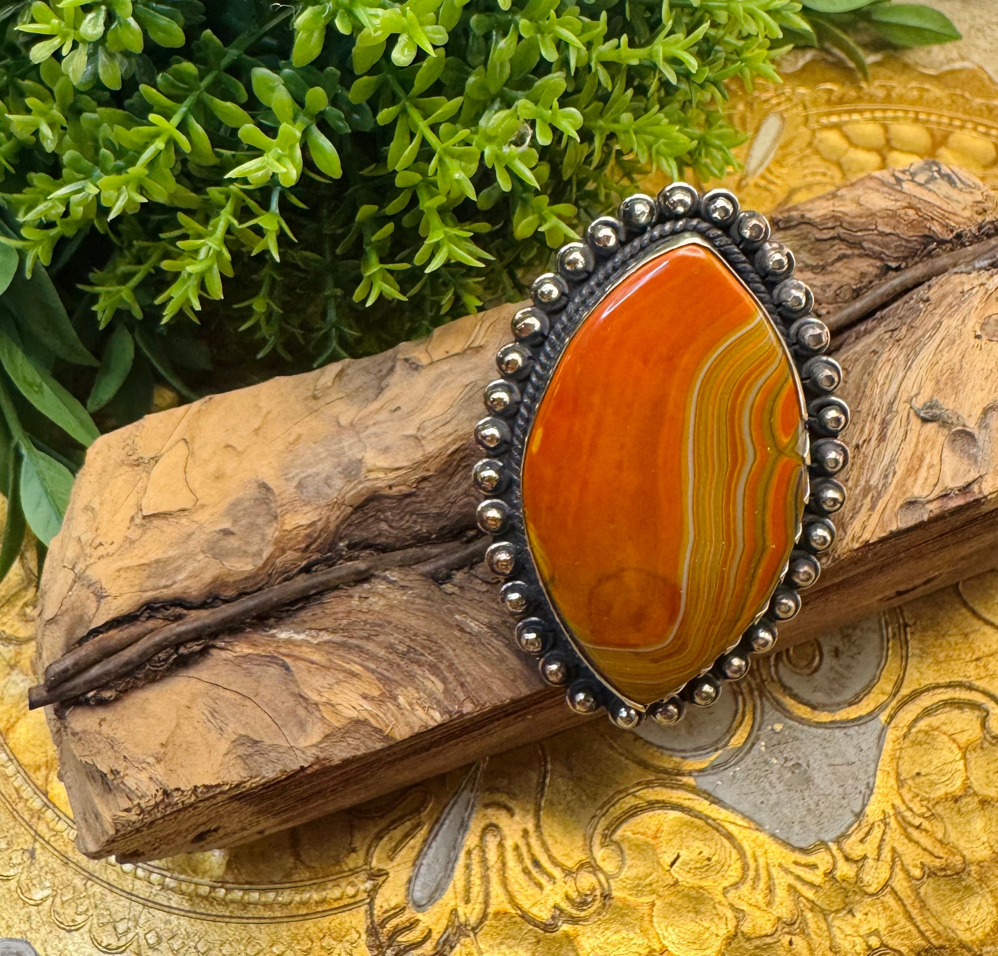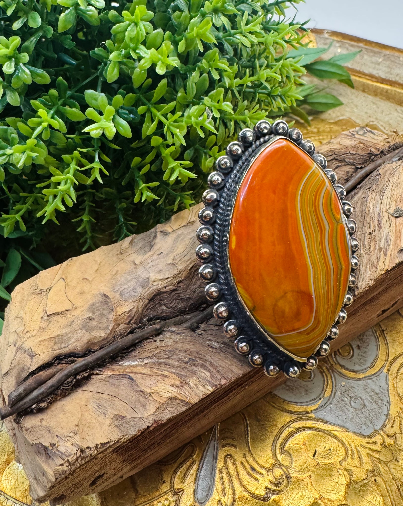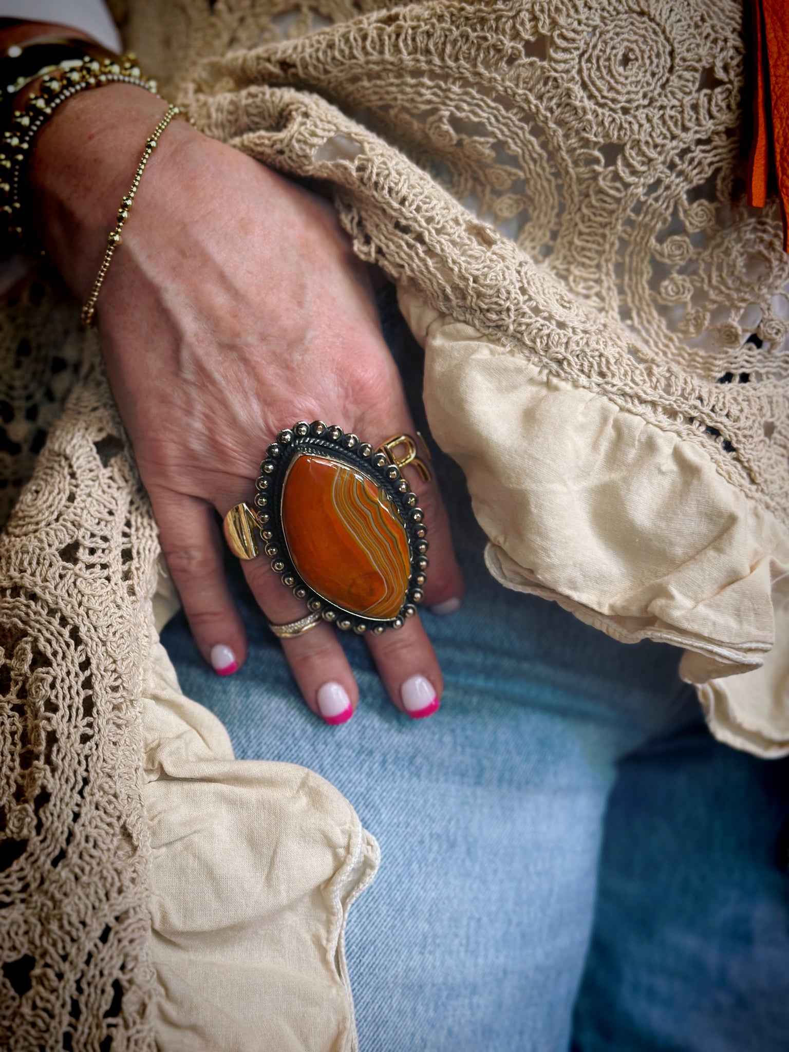 Catch the golden hour on your finger with this stunning Sunset Over Amarillo Ring. Featuring a generously sized banded agate gemstone that swirls with warm amber, rust, and cream tones reminiscent of a Texas sunset, this beauty is set in lustrous western German silver for timeless appeal. The adjustable band ensures a perfect fit for any hand, making it an effortless addition to your everyday jewelry collection or a show-stopping statement piece for special occasions. Whether you're a gemstone lover, western enthusiast, or simply drawn to nature-inspired designs, this ring brings a touch of southwestern charm and playful elegance to your style.