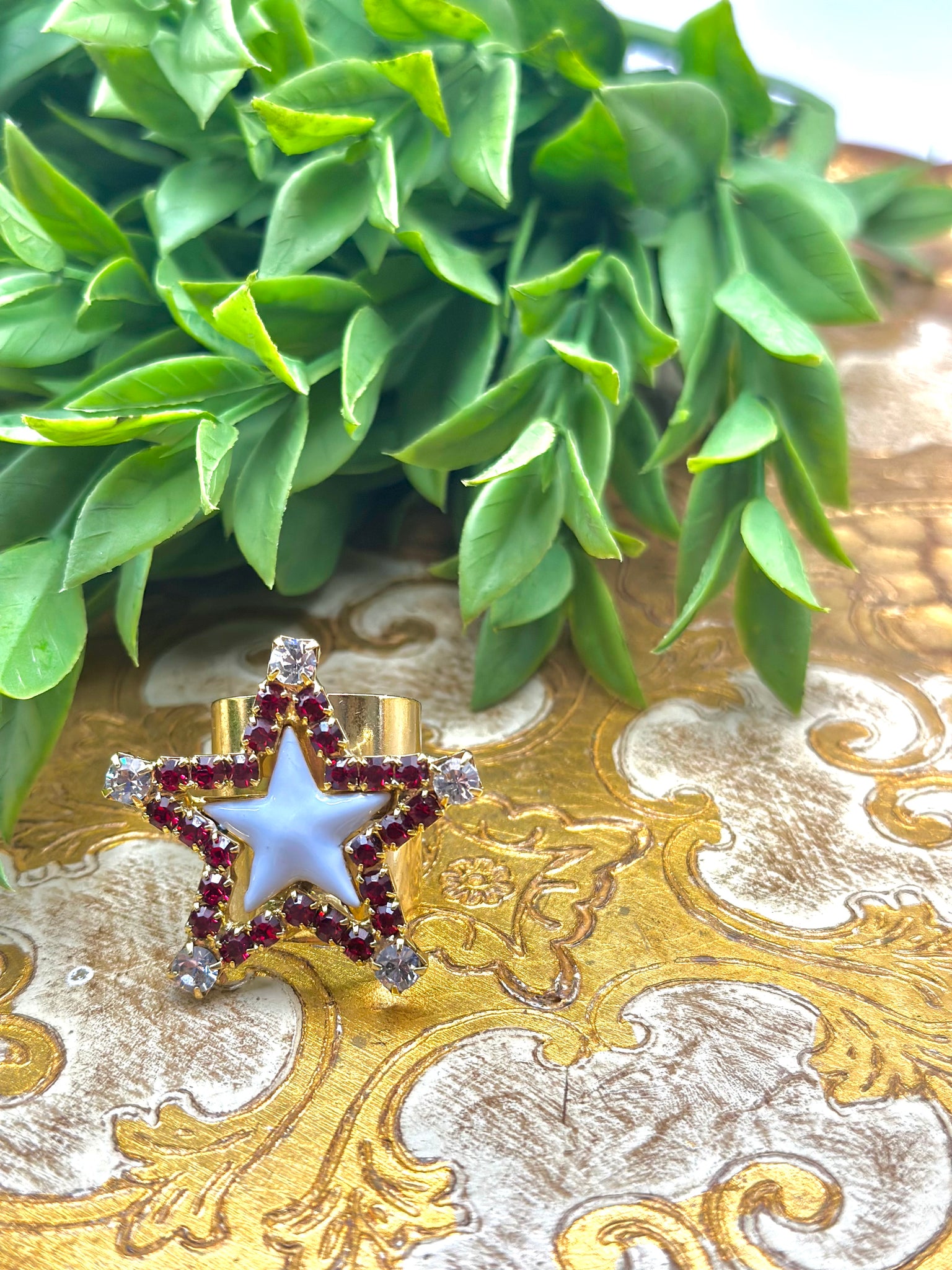 This Super Star Ring in White Enamel and Red Rhinestones, will make you shine brighter than the North Star! The antique gold, plated brass will make sure your style's never dull, while the high quality crystals will make sure you sparkle wherever you go. And the adjustable size? Perfect for any finger size, interstellar or otherwise! Made in Canada with love.