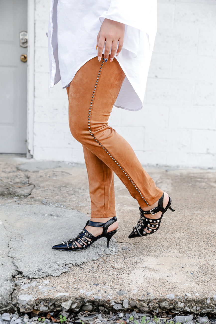 Add a little sass to your closet with these fabulous studded stretch suede leggings! Crafted from ultra-soft faux suede, they feel like a dream against your skin while giving you that chic suede look. The bold studs lining the sides bring a fierce, edgy vibe that instantly upgrades your outfit. With a high-rise fit that flatters your curves and offers support, these leggings blend comfort with attitude perfectly. Whether you're dressing up for a night out or keeping it cool and casual during the day, they’re versatile enough to handle it all. Pair them with your favorite heels for a sultry look or boots for a touch of rugged charm, and get ready to turn heads wherever you go!
