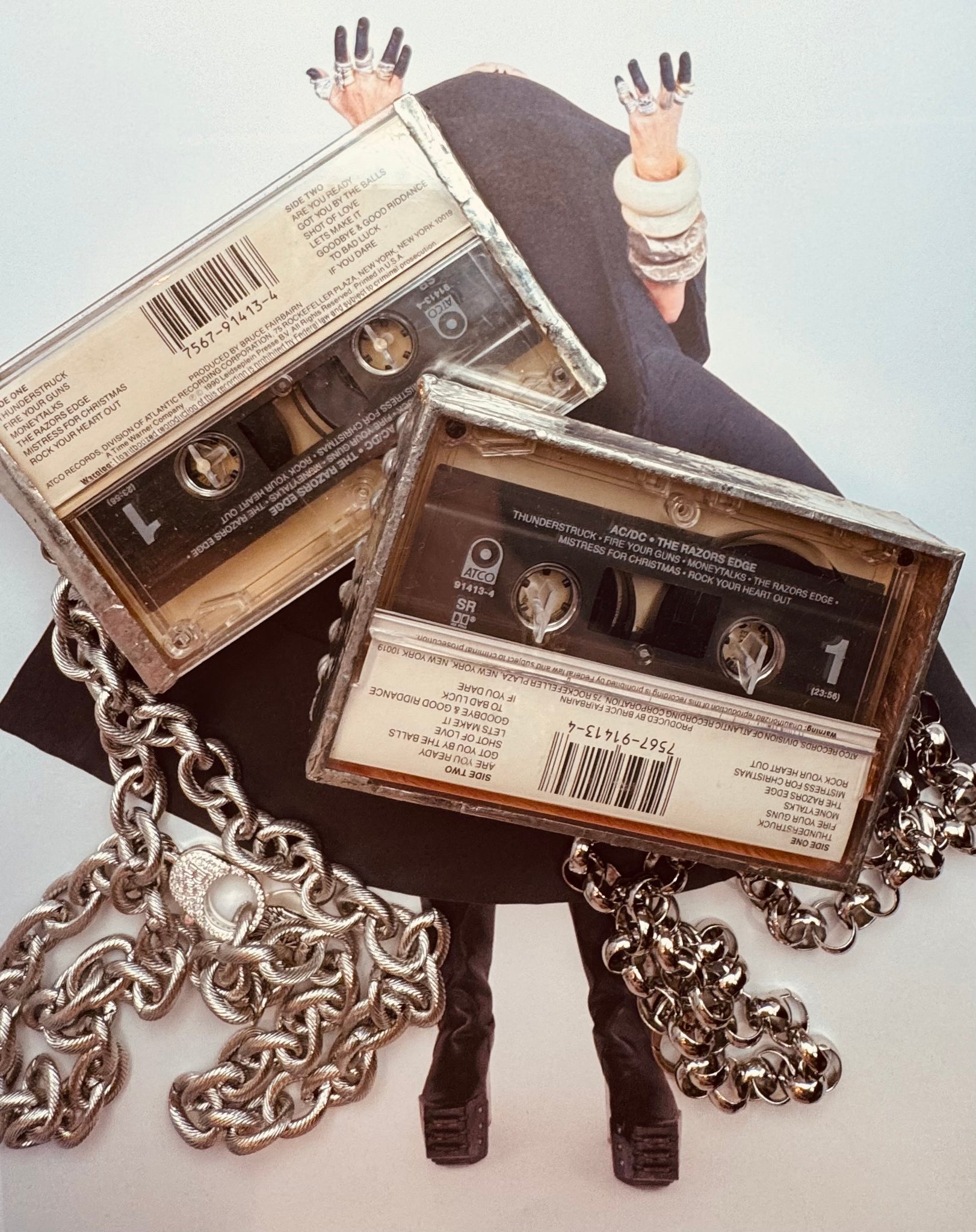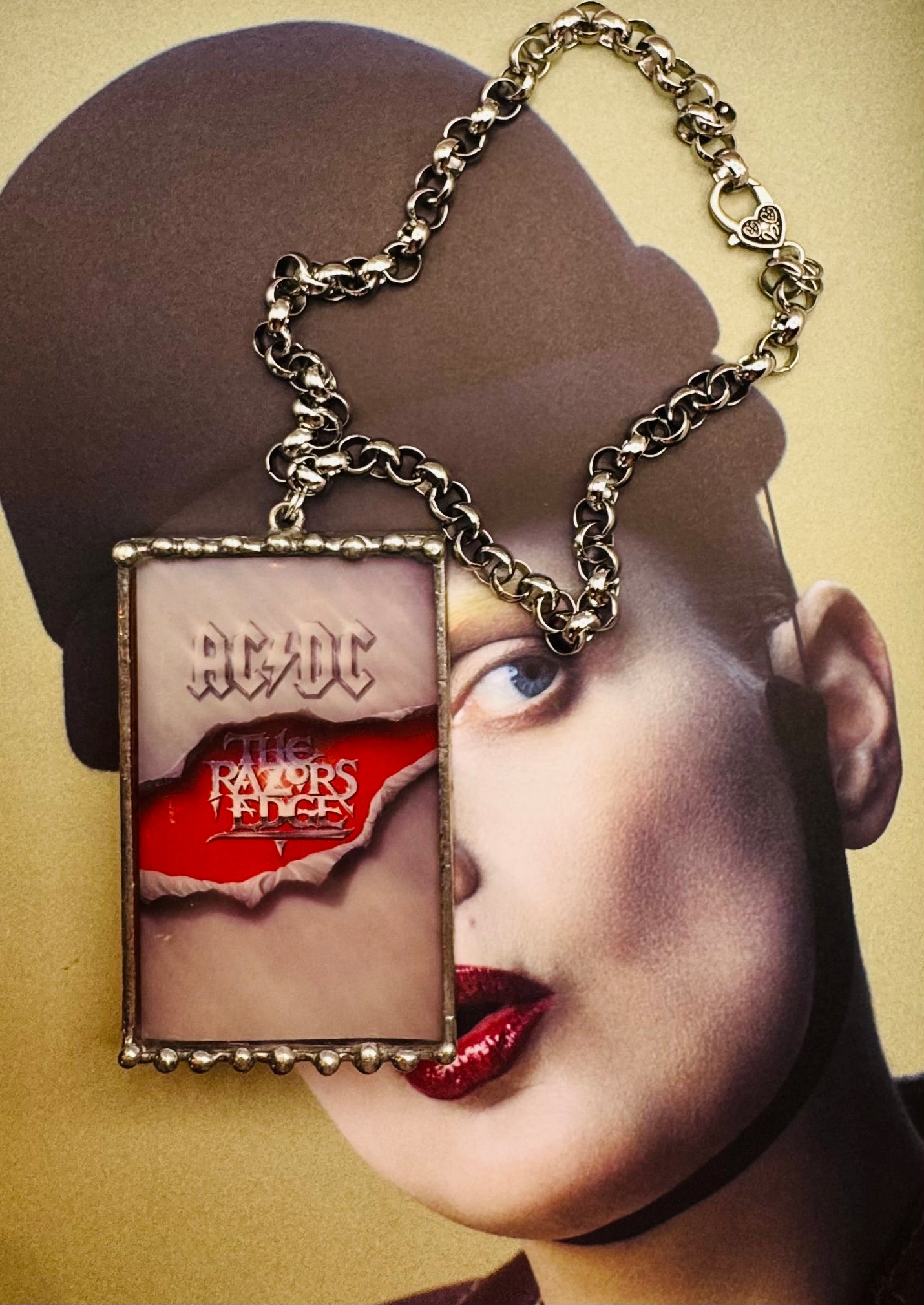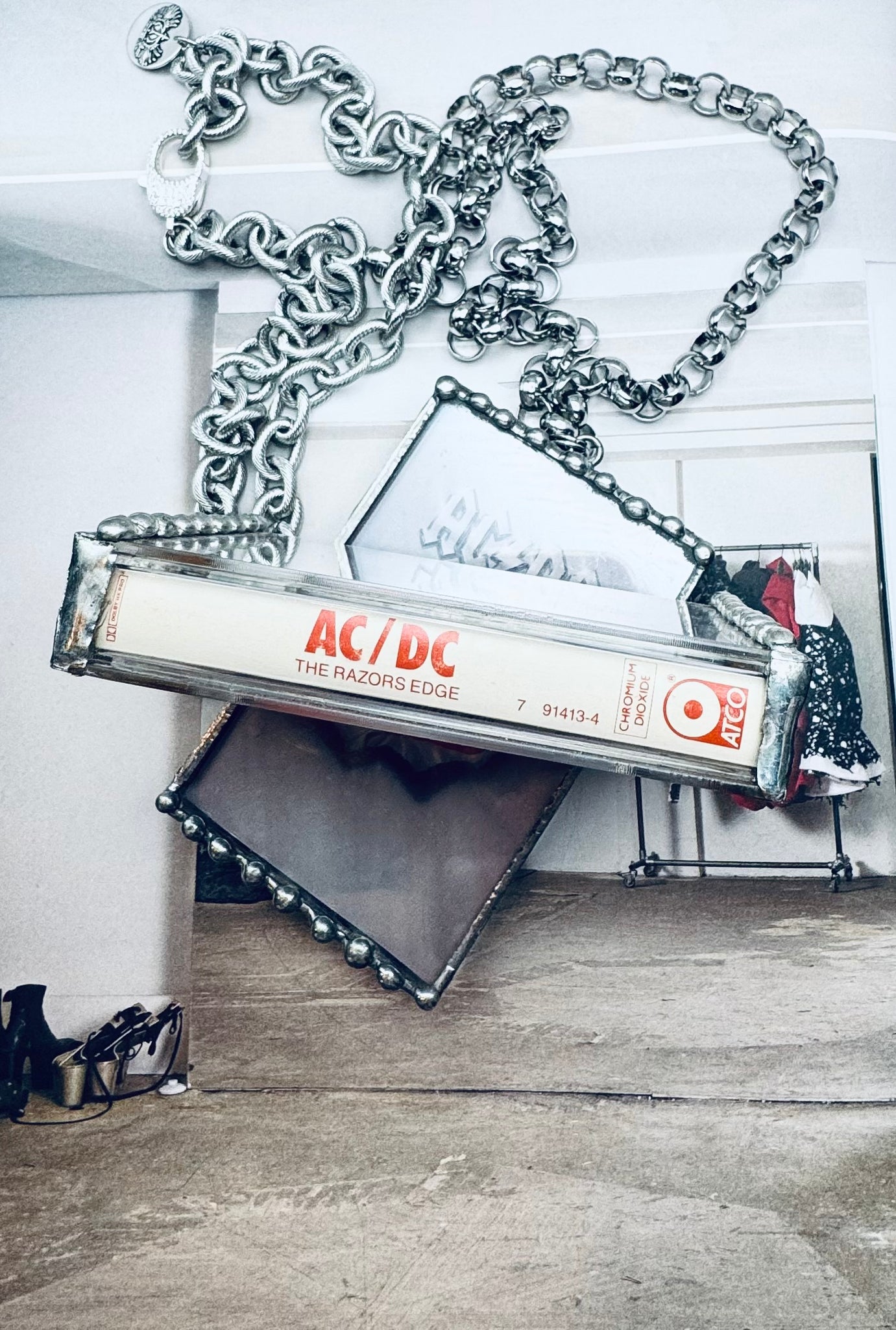 Unleash your inner rockstar with The Razors Edge Cassette Necklace. Boldly crafted from an original cassette and case from AC/DC's iconic album, this necklace features a sleek silver link chain. Make a statement and stand out from the crowd with this edgy and unique accessory.