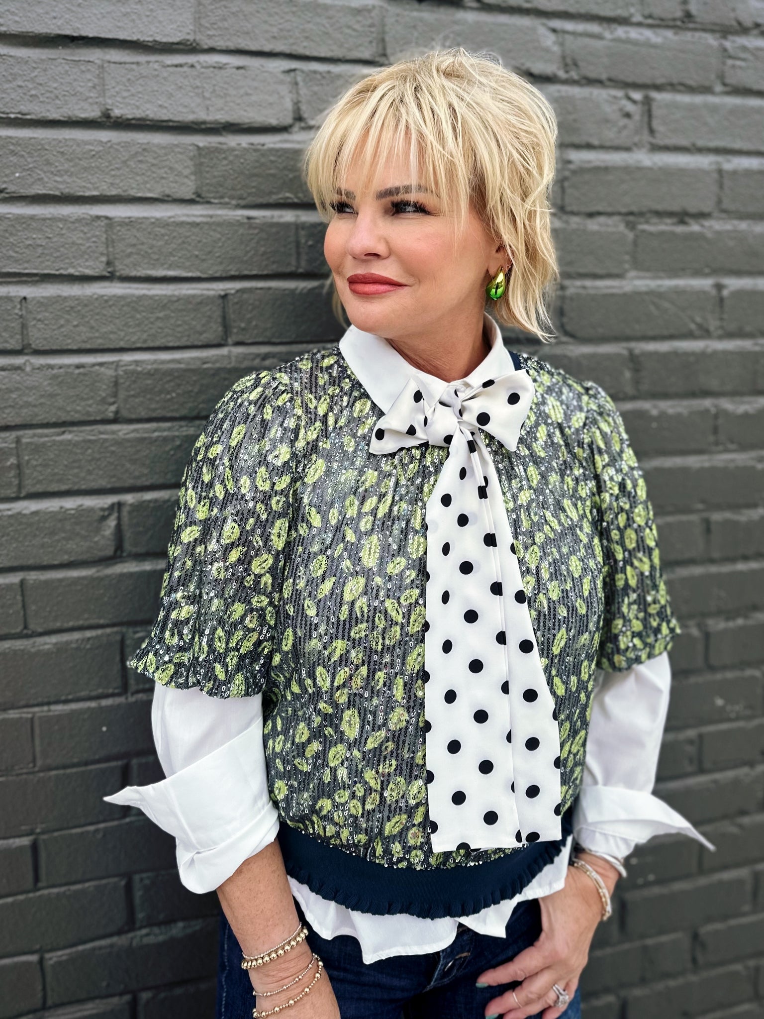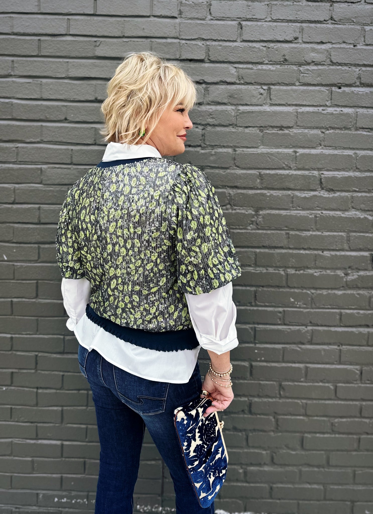 Bring the sparkle and sass to your holiday celebrations with this show-stopping Thistle Sequin Top. Featuring a bold sequin leopard print in vibrant chartreuse and navy, this piece commands attention from every angle. The playful ruffle band detail adds movement and dimension, while the shimmering sequins catch the light with every twirl. Perfect for festive gatherings, night outs, or whenever you want to feel like the star of the show. This is the kind of top that makes a statement and guarantees you'll be the most dazzling guest in the room.