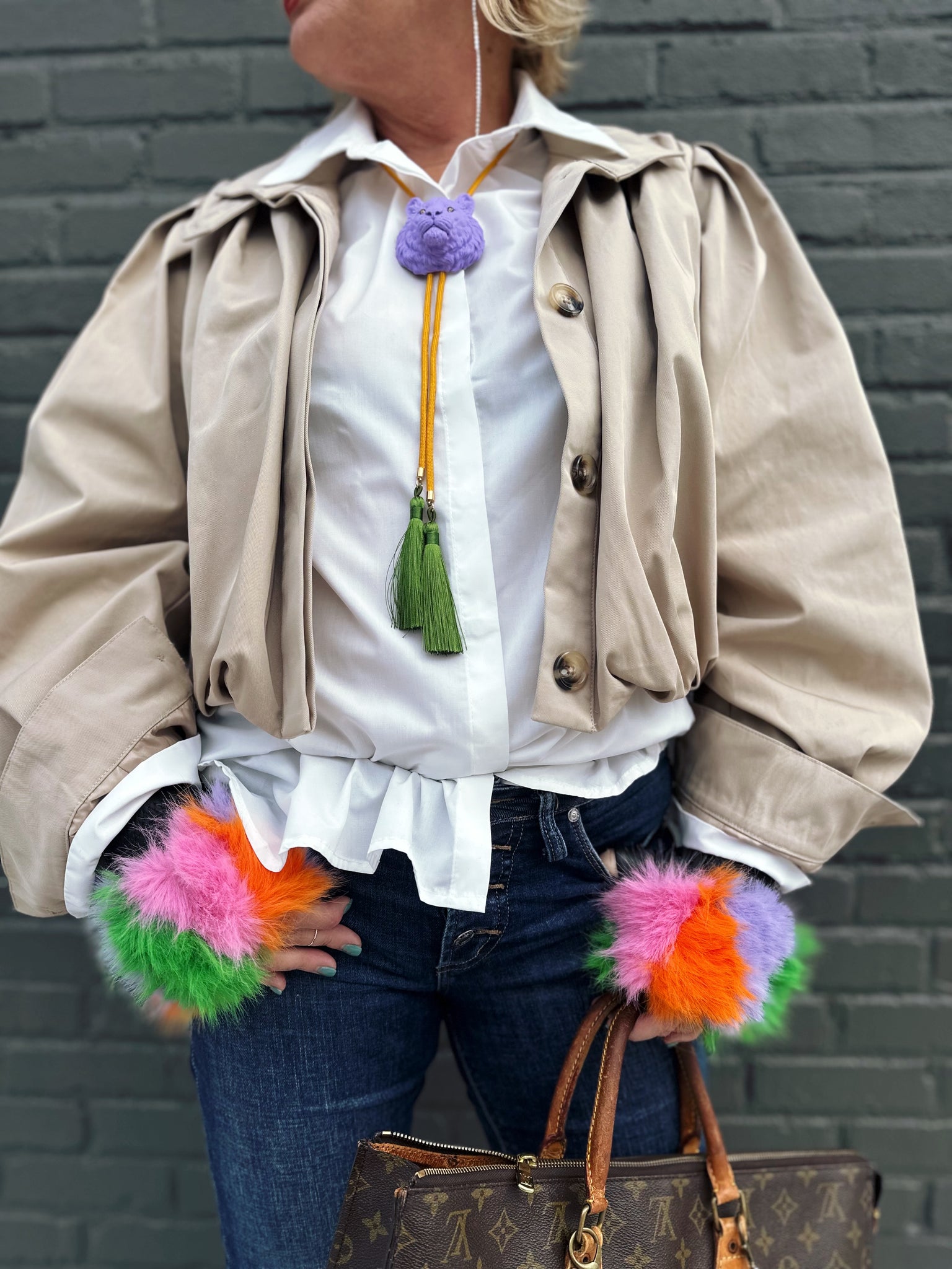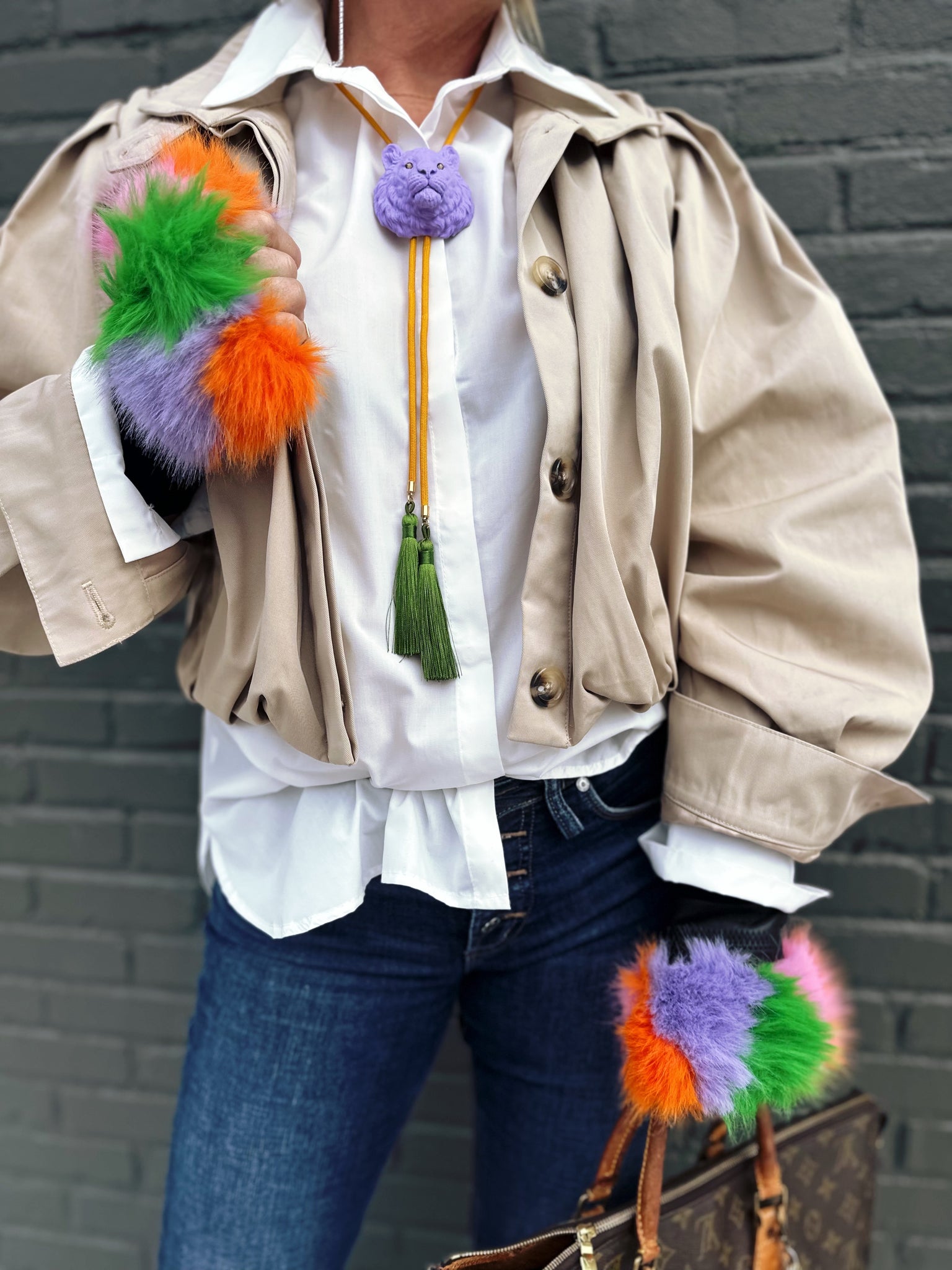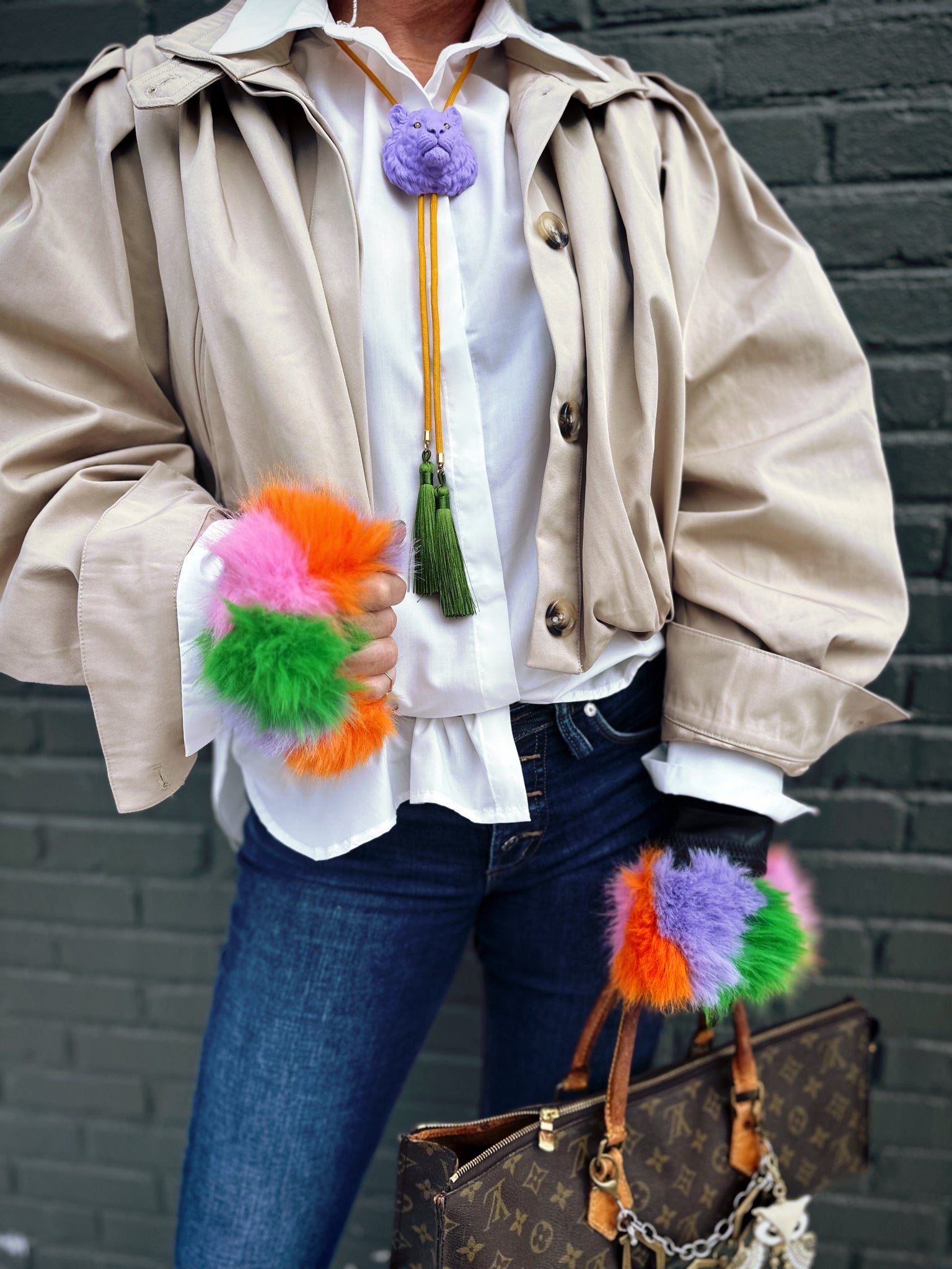 These uniquely styled fingerless gloves with multi-color fur trim will not only keep the cold at bay but they will also turn heads! Perfect for anyone who wants to stay warm without sacrificing style or functionality, these gloves let your fingers roam free while the cozy fur trim wraps around your wrists for extra comfort. Whether you're texting, typing, or just need a little extra flair during chilly weather, these fingerless gloves deliver both practicality and personality. The vibrant multi-color fur adds a playful pop to any winter outfit, making them an instant conversation starter. Slip them on and embrace the perfect blend of warmth, attitude, and undeniable cool factor.